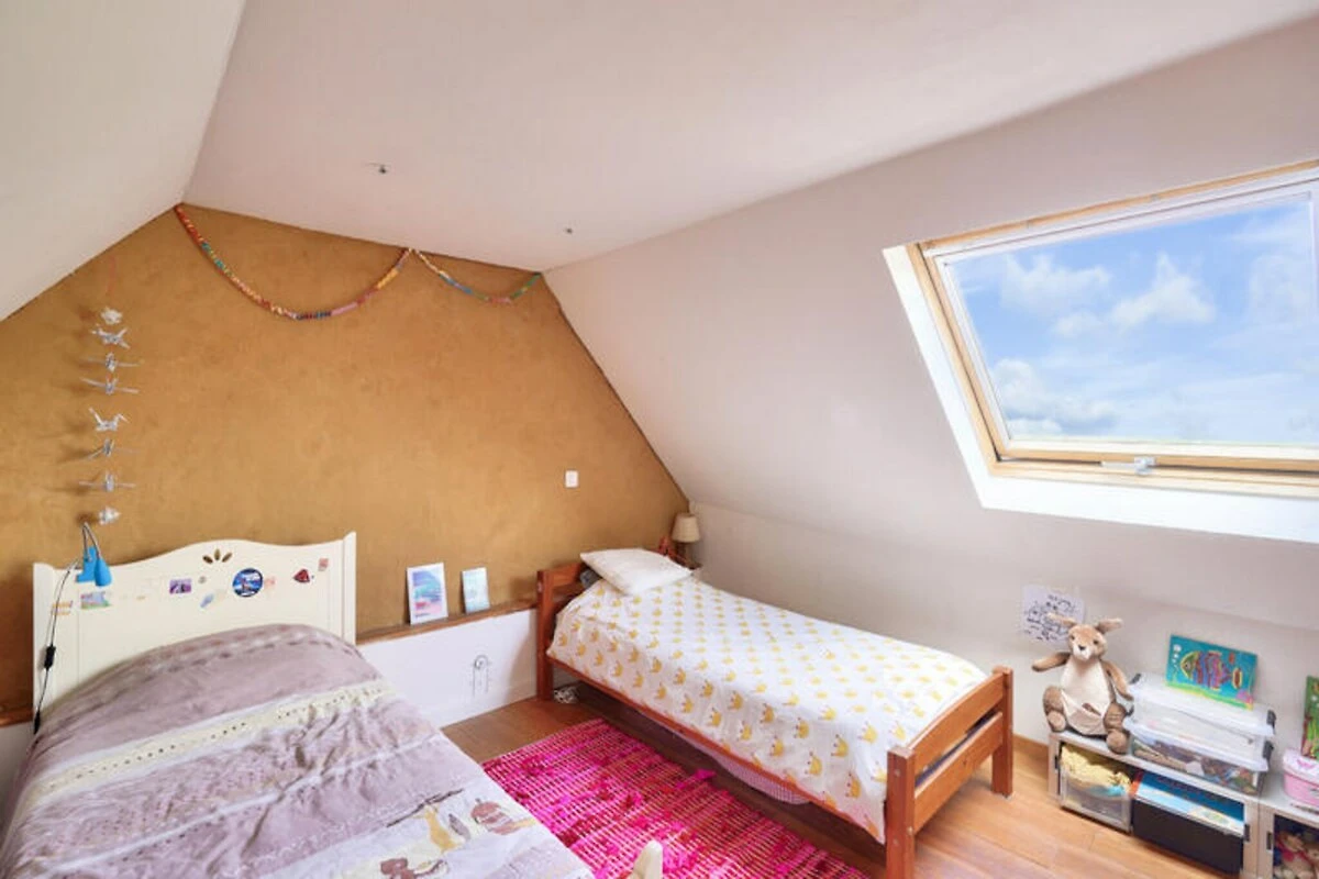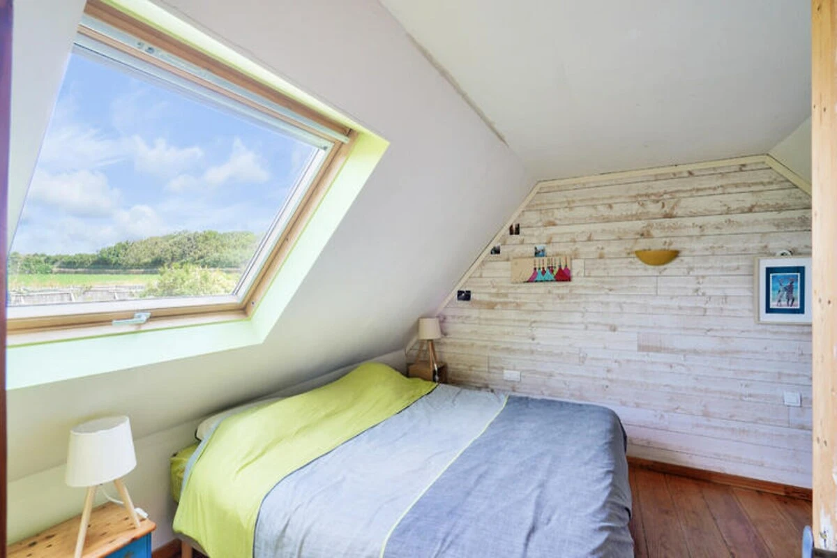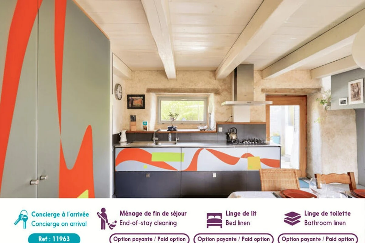 Mitten im idyllischen Bigouden der Bretagne bietet dieses charmante Landhaus den perfekten Rückzugsort für alle, die Ruhe und Natur suchen. Umgeben von üppigem Grün und nur einen Kilometer vom Sandstrand von Plovan entfernt, vereint dieses renovierte Bauernhaus rustikalen Charme mit modernem Komfort und schafft so eine einladende Oase für einen erholsamen Urlaub. Die friedliche Lage, fernab von WLAN und Fernsehen, lädt dazu ein, die Natur neu zu entdecken und wertvolle Zeit mit Ihren Lieben zu verbringen. Treten Sie ein und entdecken Sie eine reizvolle Mischung aus freiliegenden Holzbalken, Mauerwerk und lebendiger Dekoration, die Wärme und Fröhlichkeit ausstrahlt. Der großzügige Wohnbereich verfügt über eine voll ausgestattete Küche mit Gasherd, Backofen, Kühlschrank, Gefrierschrank und Geschirrspüler, die die Zubereitung von Mahlzeiten zum Vergnügen macht. Genießen Sie herzhafte Mahlzeiten am großen Holztisch oder entspannen Sie sich in der gemütlichen Lounge. Im Obergeschoss erwarten Sie drei charmante Schlafzimmer: ein Doppelzimmer mit Stauraum unter der Dachschräge, ein verspieltes Zweibettzimmer, ideal für Kinder, und ein weiteres Doppelzimmer mit behaglicher Atmosphäre. Ein großer Schreibtisch im Treppenhaus lädt zum kreativen Gestalten ein und bietet den idealen Platz zum Zeichnen oder Basteln. Das Haus verfügt außerdem über ein Badezimmer mit Badewanne und Dusche, zwei separate WCs sowie Annehmlichkeiten wie Waschmaschine und Trockner.