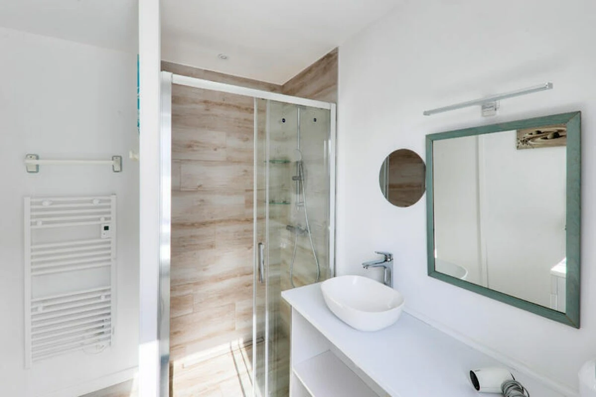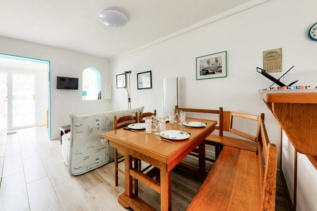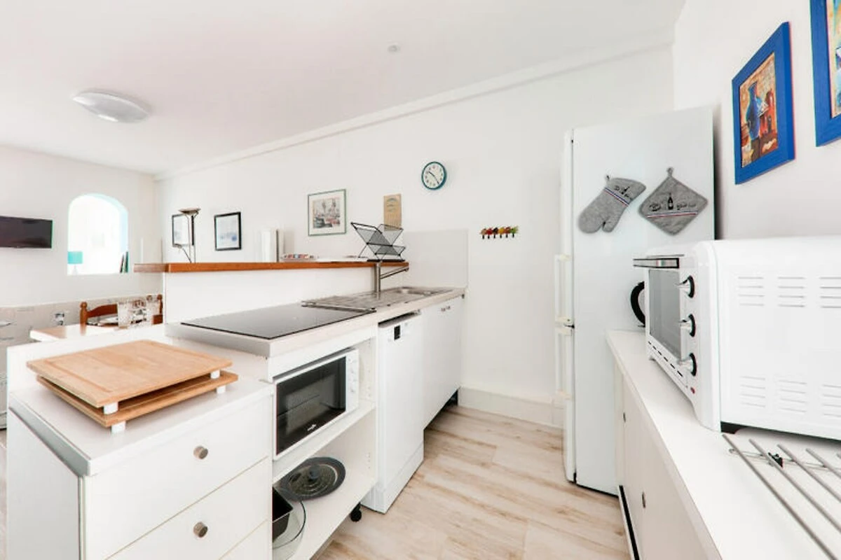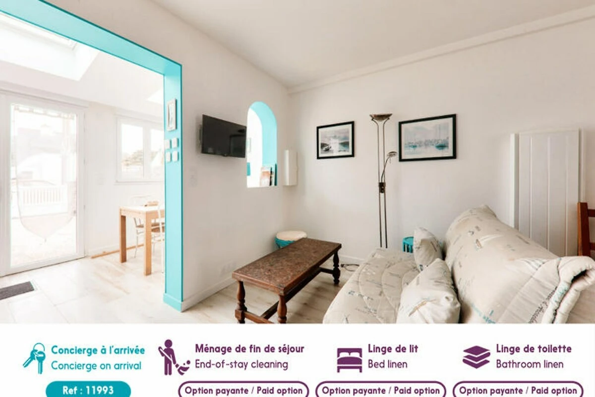 Am nördlichen Rand der Halbinsel Quiberon, wo die Atlantikbrise auf historischen Charme trifft, lädt dieses bezaubernde Küstenrefugium Sie ein, in die natürliche Schönheit und den kulturellen Reichtum der Bretagne einzutauchen. Umgeben von unberührten Stränden, malerischen Küstenwegen und prähistorischen Stätten bietet dieses Haus eine Oase der Ruhe, nur wenige Schritte von den faszinierendsten Sehenswürdigkeiten der Region entfernt. Ob Sie einen entspannten Urlaub am Meer oder einen erlebnisreichen Ferienurlaub planen – diese Unterkunft ist der perfekte Ausgangspunkt. Treten Sie ein und entdecken Sie ein durchdacht gestaltetes Interieur, das Komfort und Funktionalität vereint. Im Erdgeschoss befinden sich ein gemütliches Wohnzimmer mit Kamin, ein lichtdurchfluteter Essbereich und eine voll ausgestattete offene Küche mit modernen Geräten wie Induktionskochfeld, Backofen und Geschirrspüler. Im Obergeschoss bietet die Unterkunft ideale Schlafmöglichkeiten für Familien oder kleine Gruppen: ein Schlafzimmer mit einem Queensize-Bett und ein zweites Schlafzimmer mit zwei Einzelbetten. Zwei Badezimmer, eines mit Dusche und das andere mit Badewanne, sorgen für Komfort für alle Gäste. Draußen laden zwei Terrassen zum Entspannen, Essen im Freien oder einfach nur zum Genießen des Küstenflairs ein.