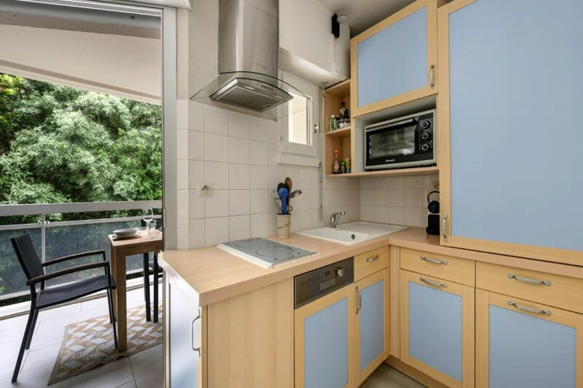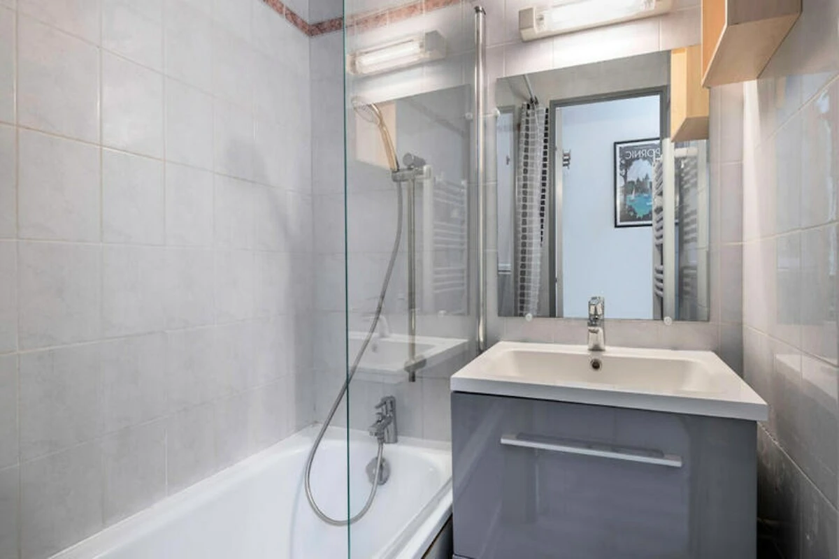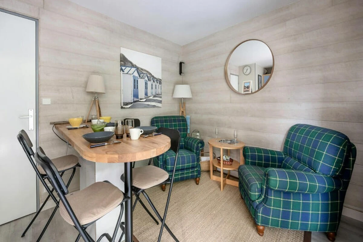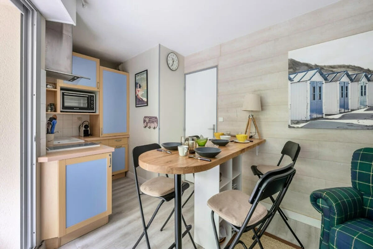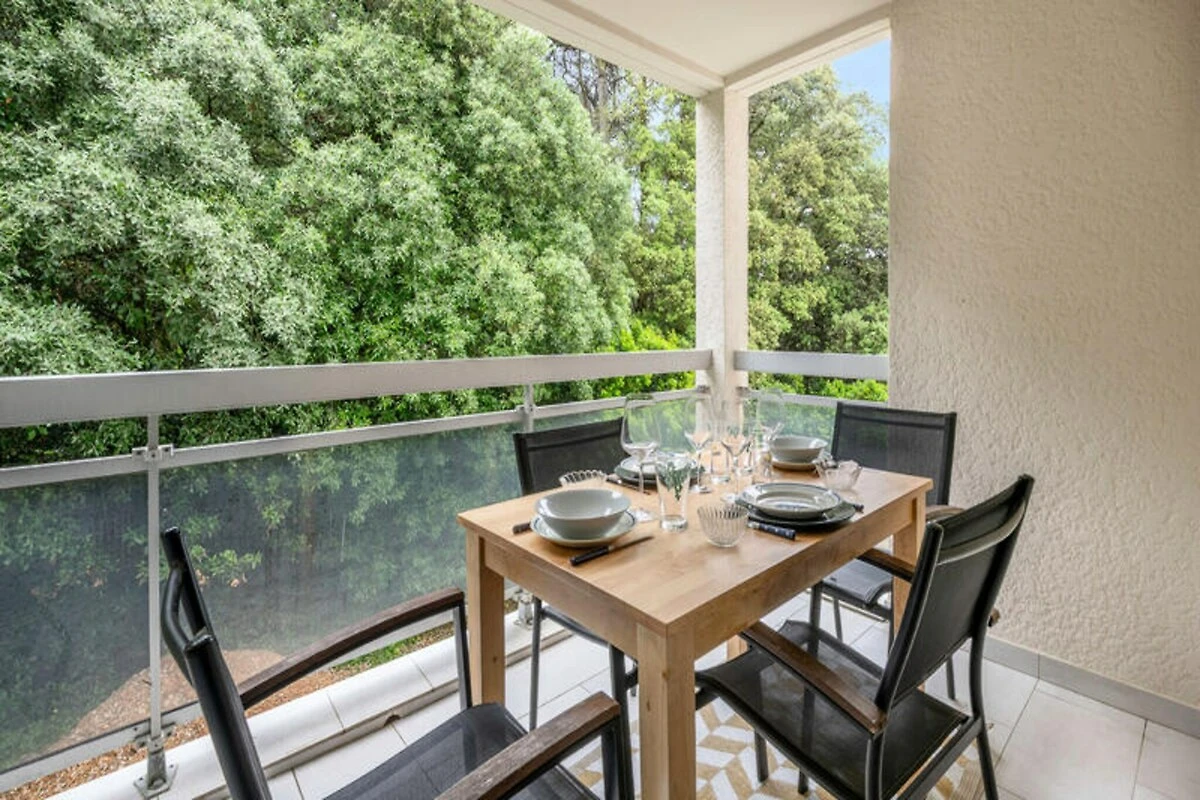 Das Apartment verfügt über ein Schlafzimmer mit Doppelbett (Queensize-Bett) und ein Etagenbett und bietet Platz für bis zu 4 Personen. Die offene Küche ist mit Induktionskochfeld, einem kleinen Backofen und allen notwendigen Geräten ausgestattet, damit Sie sich wie zu Hause fühlen: Kühl-/Gefrierkombination, Geschirrspüler, kleiner Backofen, Filterkaffeemaschine, Kapselkaffeemaschine (Nespresso), Toaster, Wasserkocher, Zitruspresse und Küchenutensilien. Eine TV-Lounge mit Bartisch bietet Zugang zu einem 8 m² großen Balkon mit Gartenmöbeln, Elektrogrill und Sonnenliegen. Ein Badezimmer mit Haartrockner und separatem WC runden die Ausstattung der Unterkunft ab.