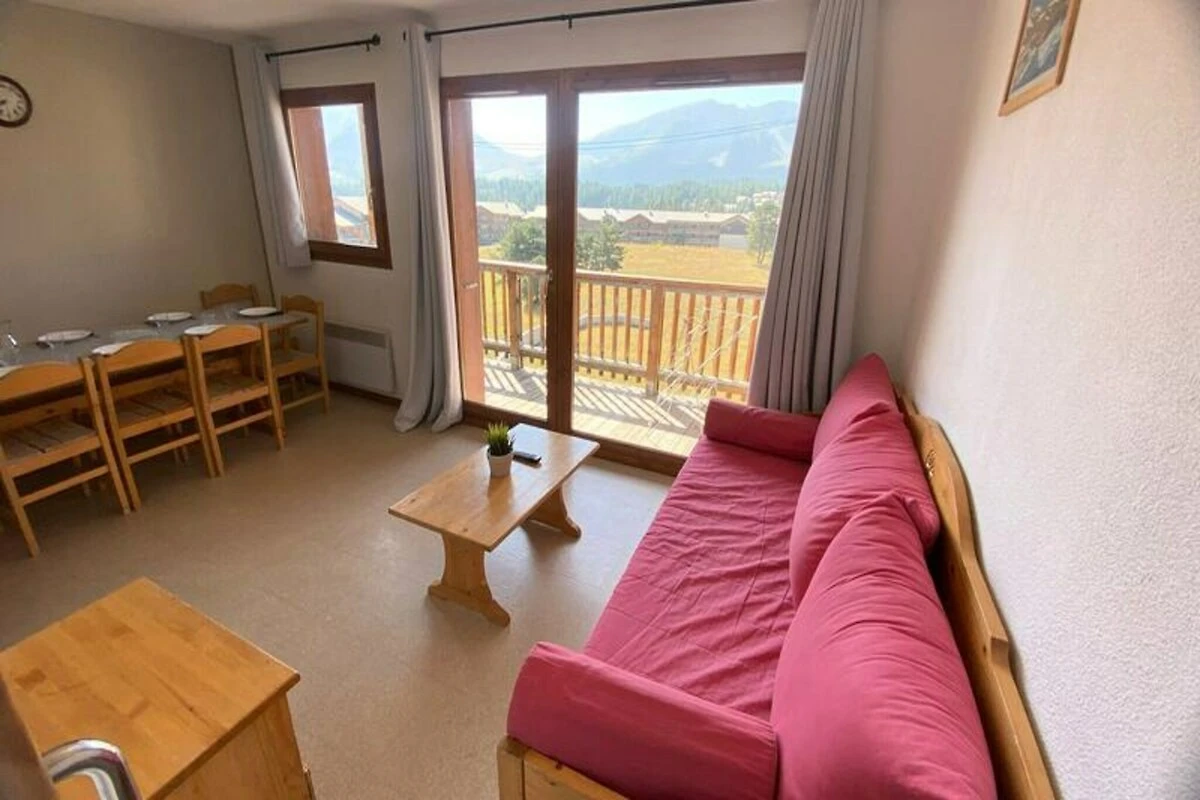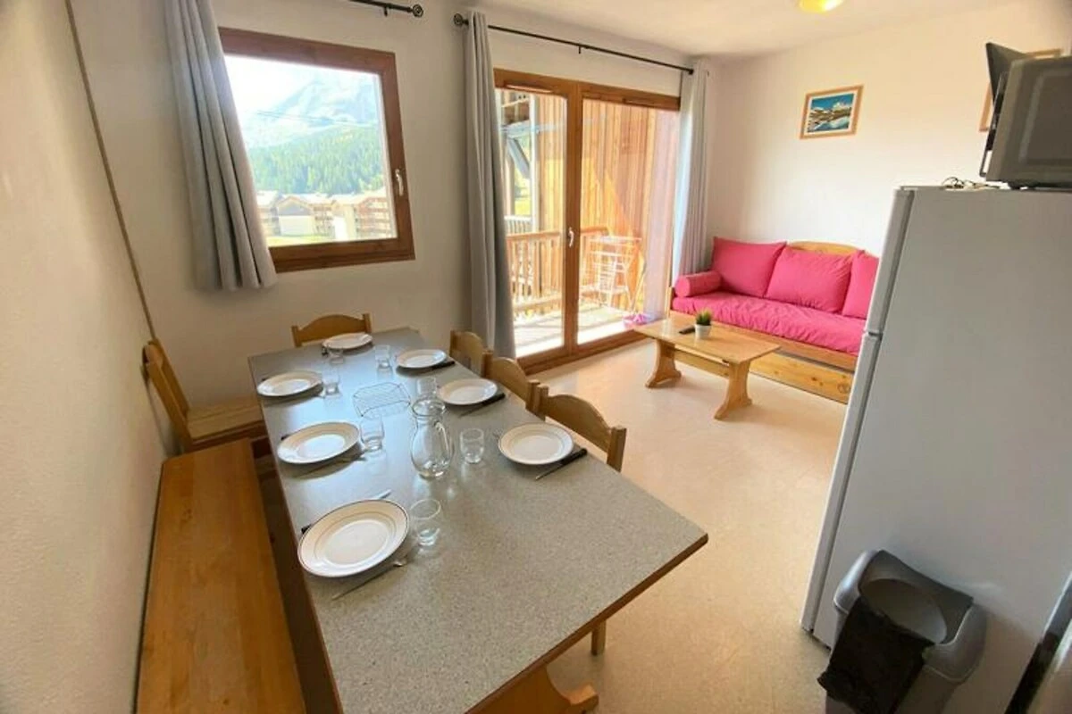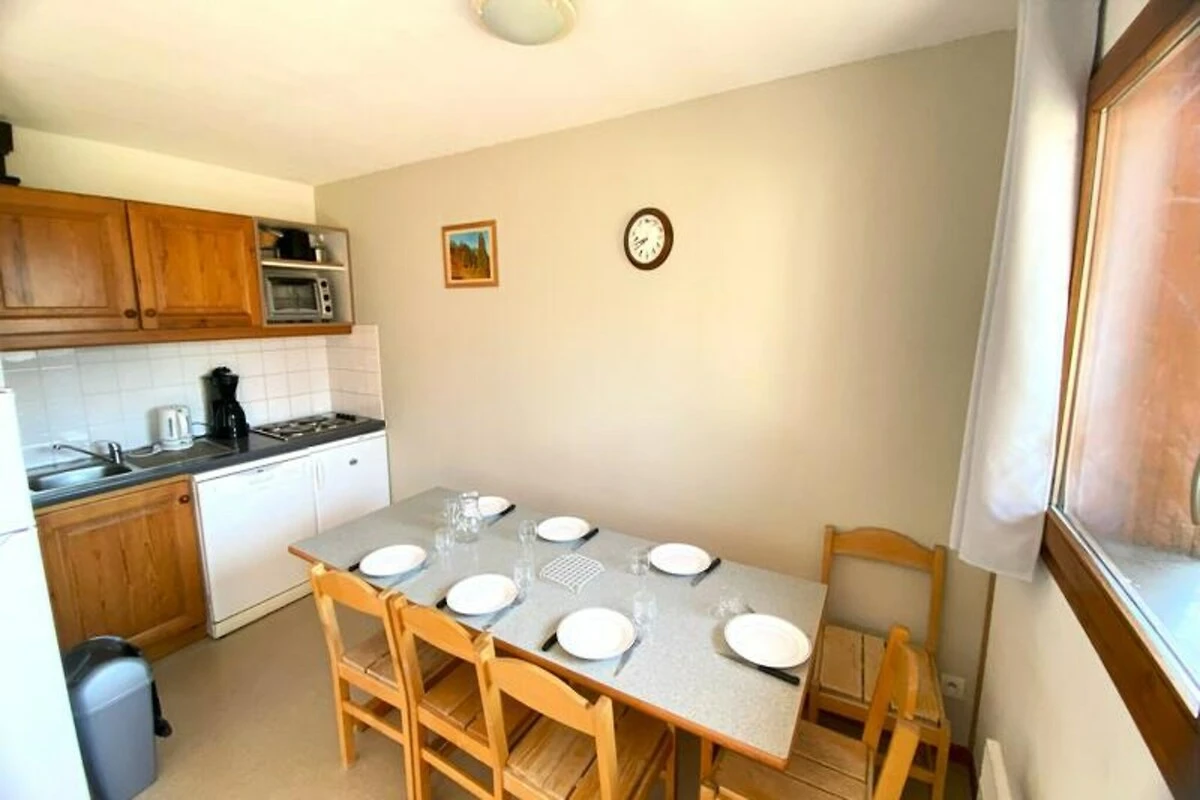 Hoch über den bezaubernden französischen Alpen bietet dieses charmante Apartment die perfekte Kombination aus Komfort und Bequemlichkeit für Ihren nächsten Bergurlaub. Die Unterkunft befindet sich in einer Anlage mit acht Chalets, die jeweils 30 Apartments beherbergen, und ist ideal für Familien oder Gruppen, die einen gemütlichen Rückzugsort in den Alpen suchen. Dank des nach Süden ausgerichteten Balkons genießen Sie jeden Morgen einen atemberaubenden Blick auf die umliegenden Gipfel und können den ganzen Tag die wärmende Sonne genießen. Nur 200 Meter von den Pisten entfernt, ist es ein Paradies für Skibegeisterte, die die unberührten Abfahrten der Region schnell und unkompliziert erreichen möchten. Das 48 m² große Apartment im 5. Stock, das bequem mit dem Aufzug erreichbar ist, bietet Platz für bis zu 8 Gäste. Es verfügt über zwei einladende Schlafzimmer mit Doppelbetten, eine Schlafnische mit Etagenbetten und ein Wohnzimmer mit Ausziehbett. Die gut ausgestattete Küchenzeile umfasst Geschirrspüler, Minibackofen, Mikrowelle, Filterkaffeemaschine, Toaster, Wasserkocher und Gefrierschrank – so können Sie nach einem Tag auf der Piste ganz einfach leckere Mahlzeiten zubereiten. Moderne Annehmlichkeiten wie Fernseher und Bettdecken sorgen für einen entspannten Aufenthalt, während optionale Bettwäschemiete und Reinigungsservice zusätzlichen Komfort bieten.\n\nNur wenige Schritte von der Unterkunft entfernt finden Sie Geschäfte und Restaurants – ideal, um die lokale Küche und die kulinarischen Genüsse nach dem Skifahren zu entdecken. Kostenlose Parkplätze rund um das Gebäude und optionale überdachte Parkplätze garantieren eine stressfreie Anreise. Haustiere sind willkommen, sodass Sie Ihre vierbeinigen Freunde mitbringen können. Ob Sie zum Skifahren, Wandern oder einfach nur zum Genießen des alpinen Charmes hier sind – dieses Apartment ist der perfekte Ausgangspunkt für unvergessliche Erlebnisse in den französischen Alpen.
