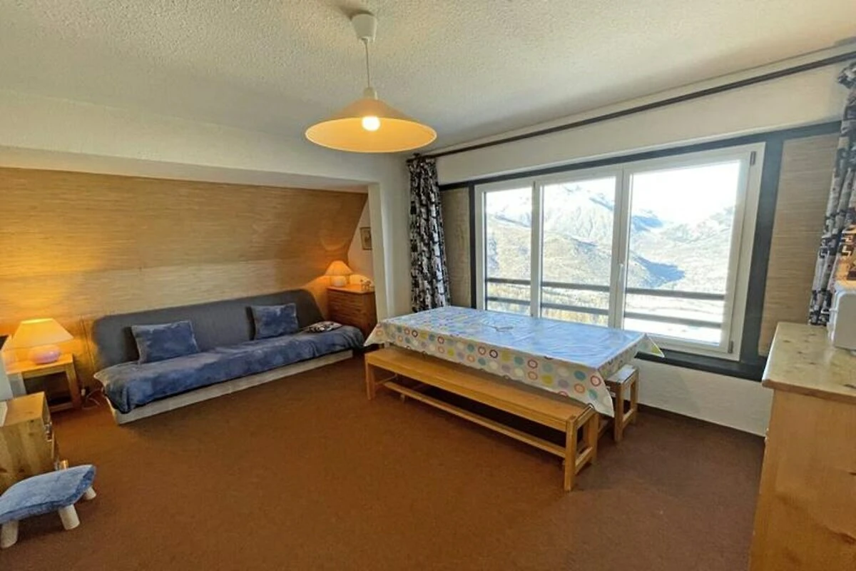 Hoch über dem idyllischen Bergdorf Risoul 1850 bietet dieses charmante Apartment einen gemütlichen Rückzugsort für bis zu sechs Gäste. Mit atemberaubendem Blick auf die umliegenden Gipfel und direktem Zugang zu den Pisten ist es ein Paradies für Skifahrer und Naturliebhaber gleichermaßen. Ob Sie aufregende Winterabenteuer oder entspannte Sommerwanderungen suchen – diese Unterkunft liegt mitten im Herzen der wunderschönen Region Hautes-Alpes. Die klare Bergluft und die malerische Landschaft bilden eine unvergessliche Kulisse für Ihren Urlaub. \n\nTreten Sie ein in das 30 m² große Apartment und entdecken Sie einen durchdacht gestalteten Raum, der Komfort und Funktionalität vereint. Der Eingangsbereich verfügt über eine Schlafnische mit Etagenbetten, ideal für Kinder oder Freunde. Der Hauptraum lädt mit einem Schlafsofa, einem Fernseher und viel Stauraum zum Entspannen ein, während die ausgestattete Küchenzeile alles bietet, was Sie für die Zubereitung herzhafter Mahlzeiten nach einem Tag in der Natur benötigen – Elektroherd, Geschirrspüler, Minibackofen und sogar ein Fondue-Set für authentische Alpenabende. Ein separates Schlafzimmer mit Doppelbett sorgt für erholsame Nächte, und das Badezimmer mit Badewanne und WC bietet zusätzlichen Komfort. Skischränke im Erdgeschoss erleichtern die Ausrüstung für die Piste. \n\nNeben dem Apartment bietet Risoul 1850 eine vielfältige Auswahl an Aktivitäten und Annehmlichkeiten. Von charmanten Restaurants mit regionalen Spezialitäten bis hin zu Skischulen und Skiverleihen – alles, was Sie brauchen, ist bequem zu erreichen. Im Sommer können Sie üppige Wanderwege erkunden, malerische Radtouren unternehmen oder einfach die Schönheit der Alpen genießen. Zu den nahegelegenen Attraktionen gehören der Nationalpark Écrins und die historische Stadt Guillestre, die sich perfekt für Tagesausflüge eignen. \n\nOb Sie mit Familie, Freunden oder Ihrem vierbeinigen Freund reisen – dieses Apartment ist der ideale Ausgangspunkt für unvergessliche Erlebnisse in den französischen Alpen. Mit seiner einladenden Atmosphäre und der unschlagbaren Lage erwartet Sie Ihr alpines Abenteuer.