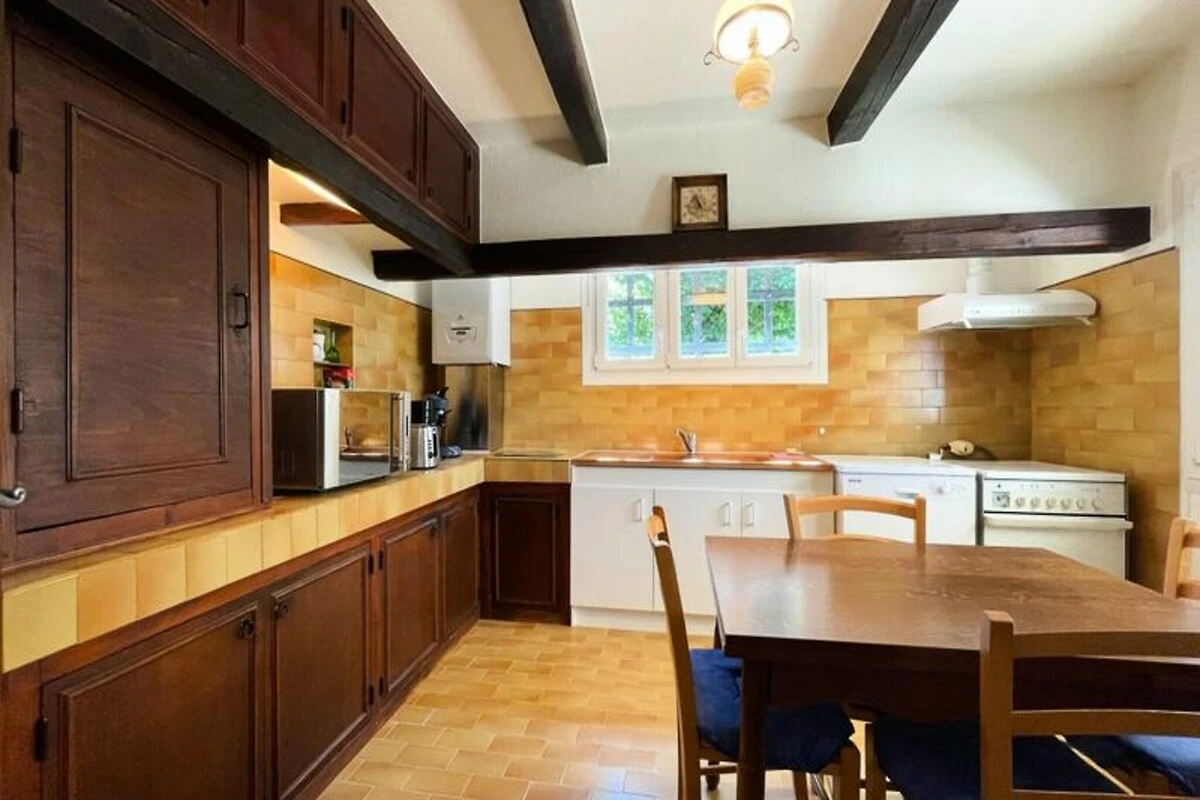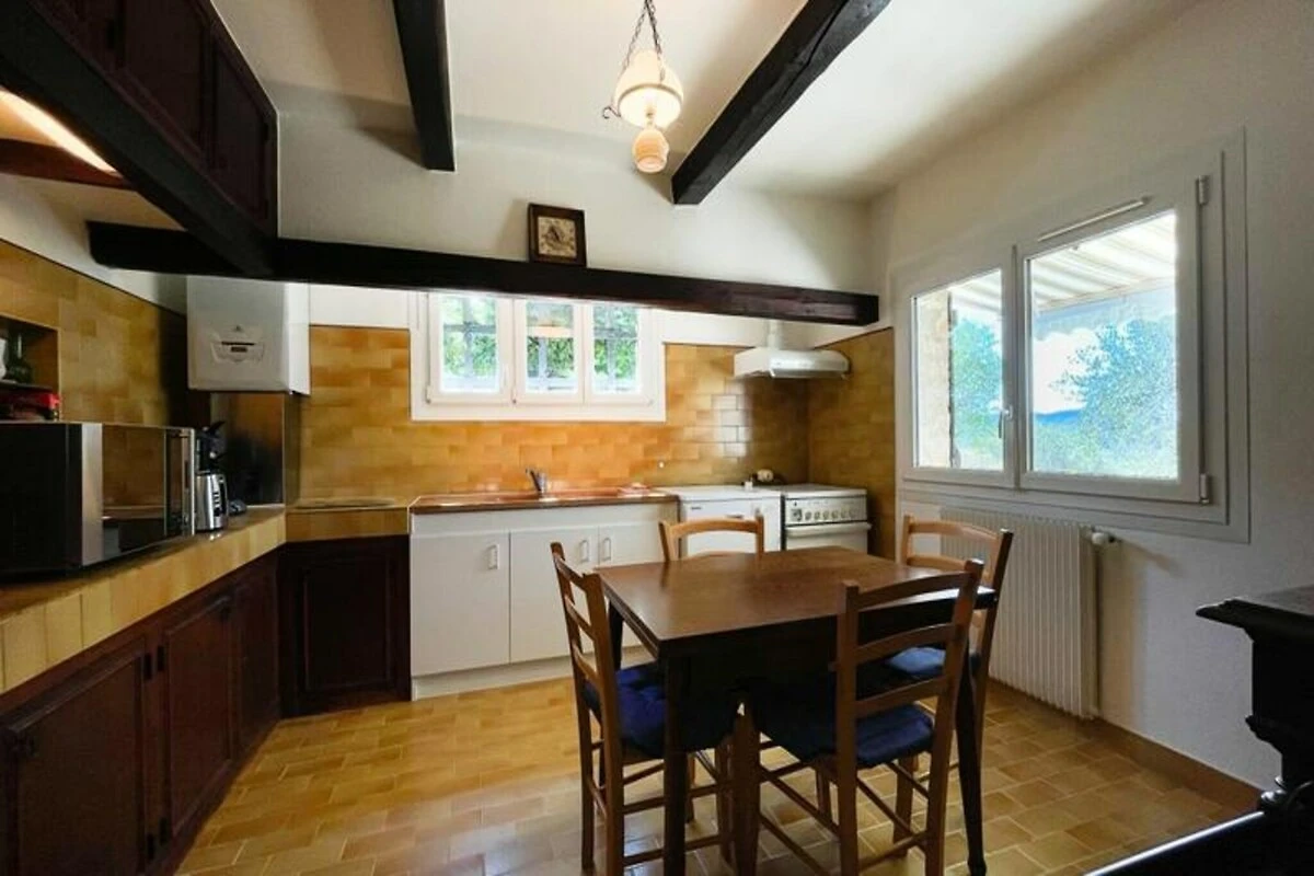 Im Inneren verfügt das Bauernhaus über drei gemütliche Schlafzimmer, darunter zwei mit Doppelbetten und ein Kinderzimmer mit zwei Einzelbetten. Die voll ausgestattete Küche ist ideal für die Zubereitung von Mahlzeiten mit frischen, regionalen Produkten, während die beiden Badezimmer für Komfort für alle Gäste sorgen. Draußen erwartet Sie eine offene Terrasse mit Sonnenliegen für entspannte Nachmittage und ein überdachter Essbereich mit Grillplatte für Mahlzeiten im Freien. Das beruhigende Zirpen der Zikaden und der Duft von Lavendel schaffen eine idyllische provenzalische Atmosphäre.