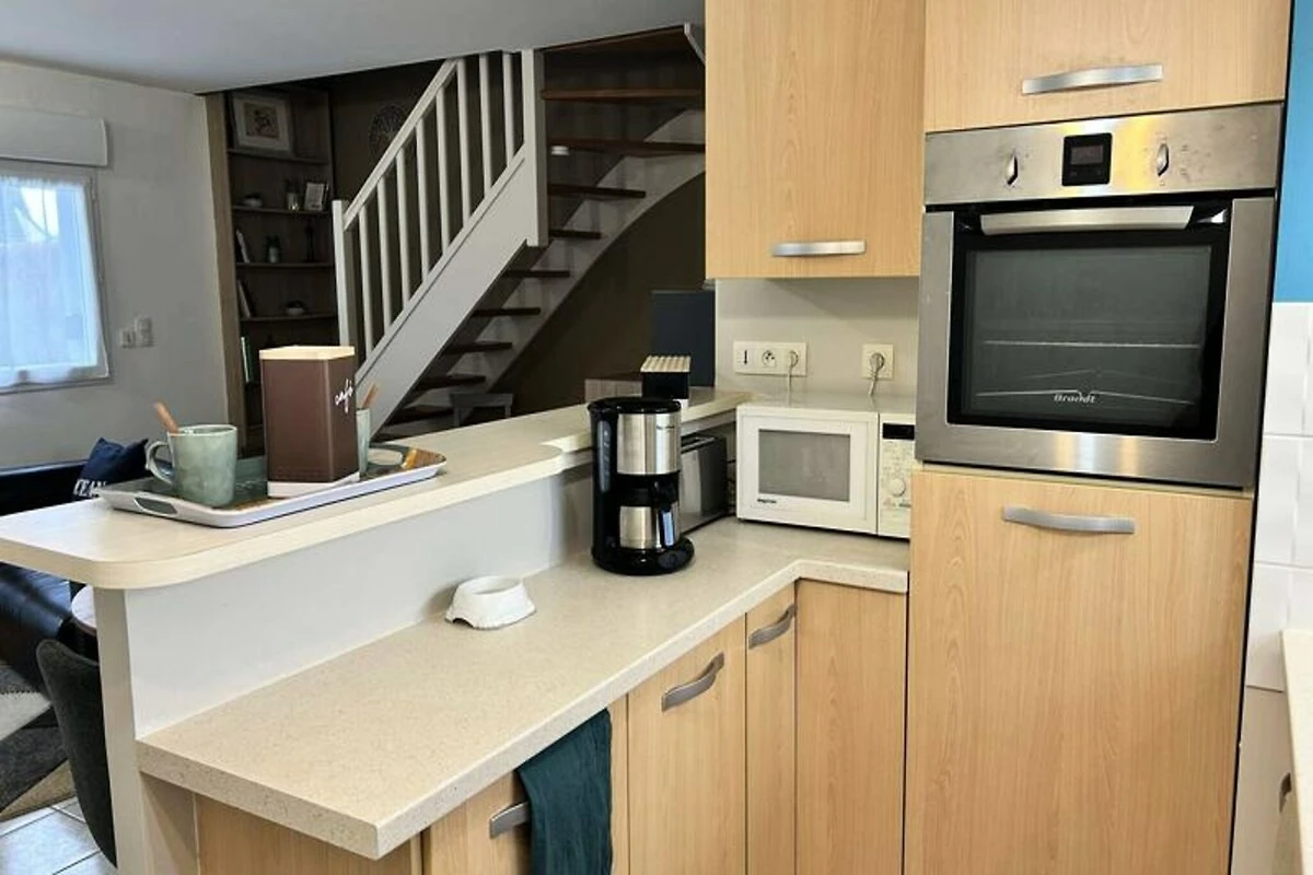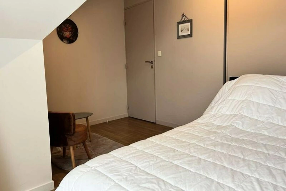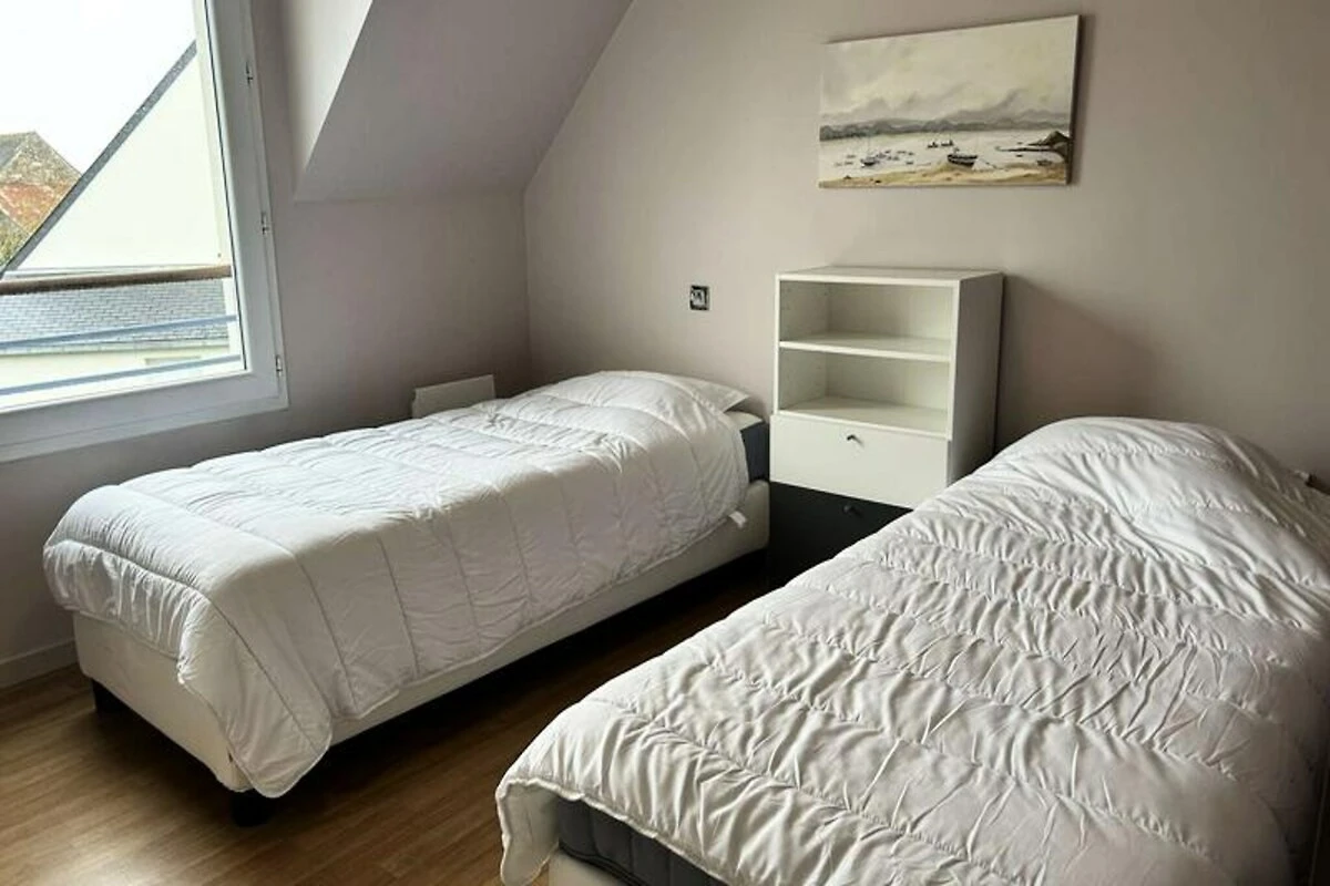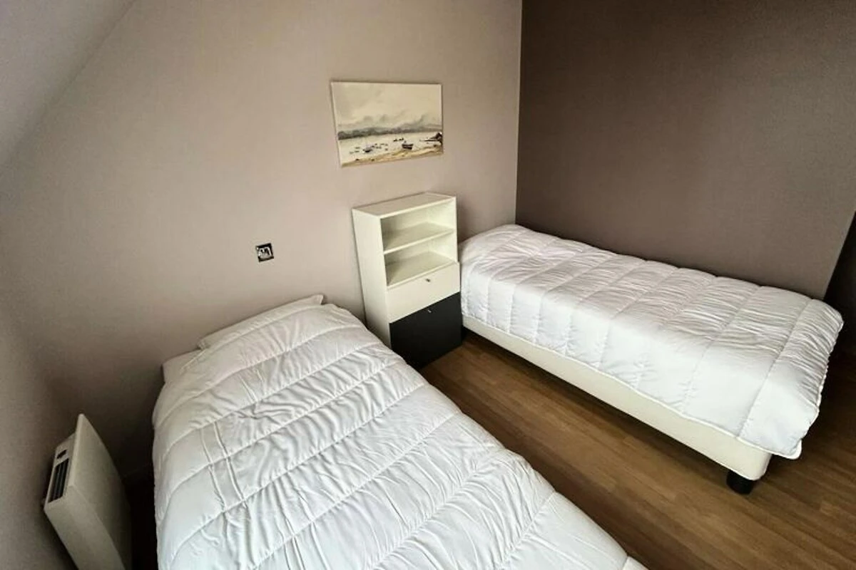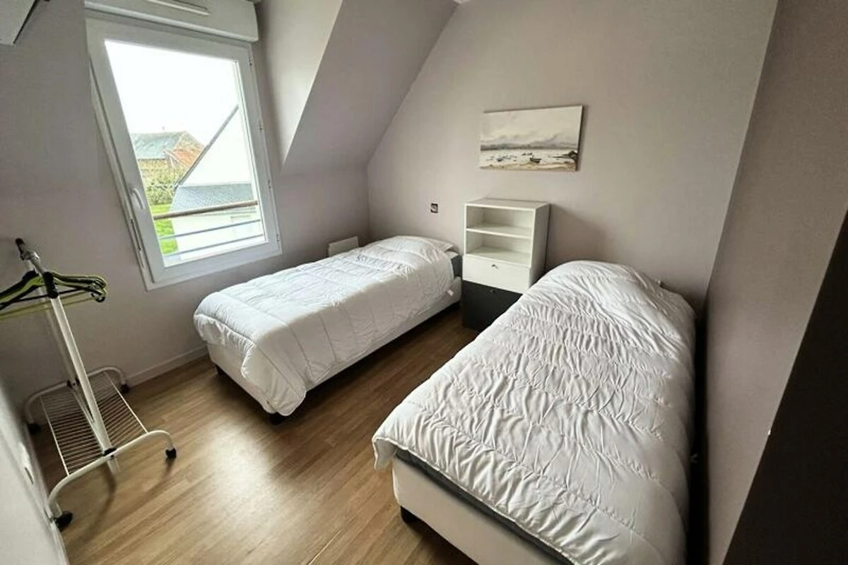Inmitten eines ruhigen, privaten Anwesens bietet dieses charmante Doppelhaus einen idyllischen Rückzugsort nur wenige Schritte vom renommierten Golfplatz Pléneuf-Val-André entfernt. Stellen Sie sich vor, wie Sie mit der sanften Meeresbrise erwachen und Ihren Morgenkaffee auf der Balkonterrasse genießen, umgeben vom wohltuenden Charme der bretonischen Küste. Ob Sie einen Golfurlaub oder eine entspannende Auszeit am Meer verbringen möchten – dieses Haus bietet die perfekte Balance aus Komfort und Bequemlichkeit. \n\nDas 58 m² große Haus ist durchdacht gestaltet und lässt keine Wünsche offen. Im Erdgeschoss befindet sich ein heller und geräumiger Wohnbereich mit einer gemütlichen Lounge, ausgestattet mit Sofa, Sesseln und Fernseher, sowie einem Essbereich für vier Personen. Die offene Küche ist mit modernen Geräten wie Induktionskochfeld, Backofen, Mikrowelle, Kühl-/Gefrierkombination, Geschirrspüler und vielem mehr ausgestattet, sodass Sie mühelos köstliche Mahlzeiten zubereiten können. Im Obergeschoss befinden sich zwei einladende Schlafzimmer: eines mit zwei Einzelbetten und das andere mit einem Doppelbett und Zugang zu einer privaten Balkonterrasse. Das Badezimmer ist mit Badewanne, Duschabtrennung und Waschmaschine ausgestattet. Gäste genießen exklusiven Zugang zum gemeinschaftlichen Hallenbad des Anwesens, das in den Sommermonaten geöffnet ist, sowie kostenlose Parkplätze direkt vor dem Haus. Die erstklassige Lage des Anwesens bietet direkten Zugang zum Golfplatz und dem malerischen Strand von Vallées und ist somit ein idealer Ausgangspunkt, um die Naturschönheiten der Region und ihre vielfältigen Outdoor-Aktivitäten zu entdecken. Ob Sie einen ruhigen Rückzugsort oder einen aktiven Urlaub suchen – dieses charmante Haus lädt Sie ein, unvergessliche Erinnerungen im Herzen der atemberaubenden Küste der Bretagne zu schaffen.