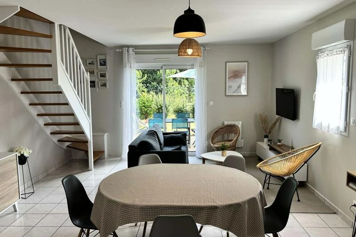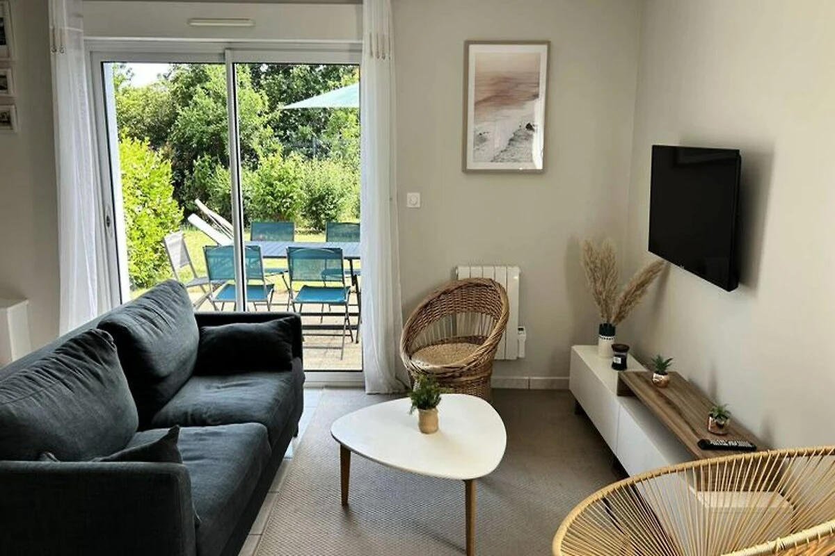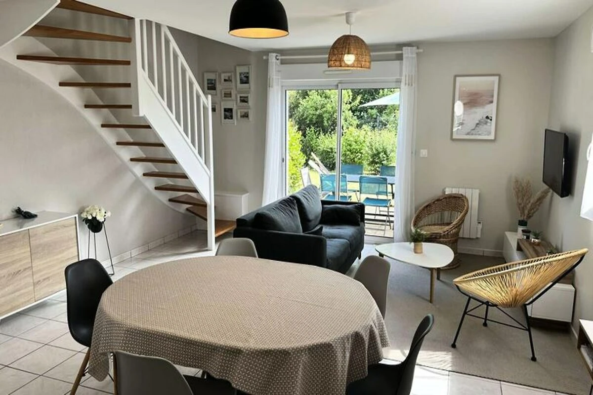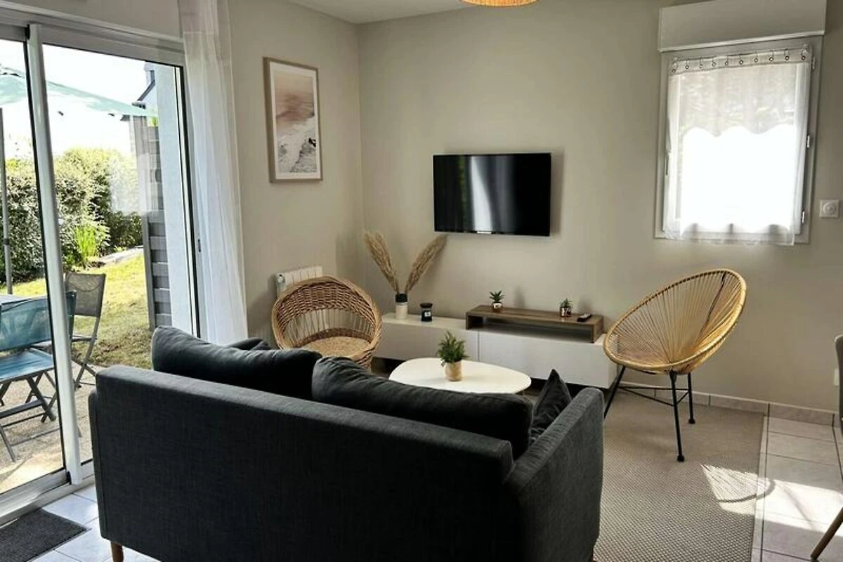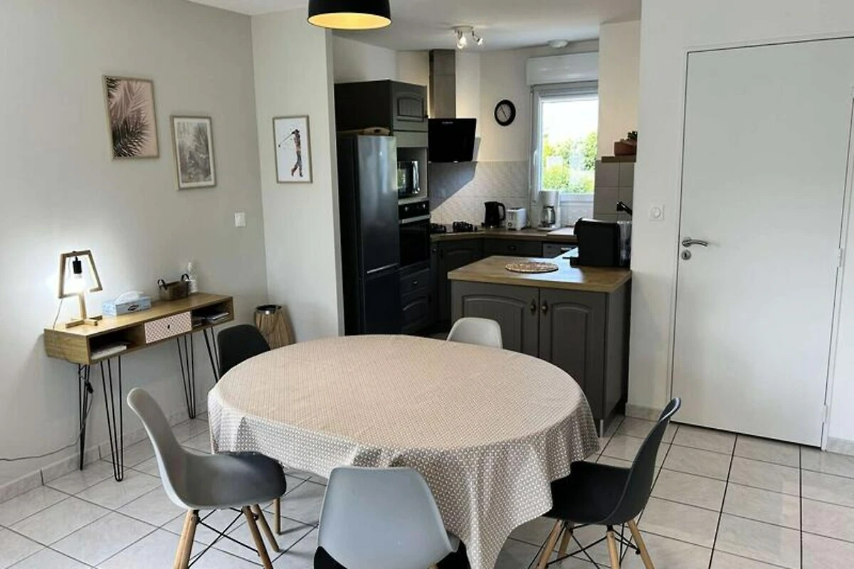 Nur wenige Schritte vom renommierten Golfplatz Pléneuf-Val-André entfernt, bietet dieses charmante Doppelhaus einen ruhigen Rückzugsort in einem privaten Anwesen mit Zugang zu einem gemeinschaftlichen Hallenbad. Die perfekte Lage für Entspannung und Abenteuer gleichermaßen macht dieses Haus zum idealen Ziel. Hier können Sie inmitten der Schönheit der bretonischen Küste die Seele baumeln lassen und gleichzeitig modernen Komfort und die Nähe zum Strand von Vallées genießen. Ob Sie ein begeisterter Golfer sind oder einfach nur eine friedliche Auszeit suchen – dieses Haus bietet den perfekten Rahmen für unvergessliche Momente. Das 57 m² große Haus ist durchdacht gestaltet und besticht durch Komfort und Funktionalität. Im Erdgeschoss befindet sich ein geräumiges und lichtdurchflutetes Wohnzimmer mit einer gemütlichen Sitzecke, ausgestattet mit Sofa, Sesseln und Fernseher, sowie ein Essbereich für bis zu fünf Personen. Die offene Küche ist komplett ausgestattet mit allem, was Sie benötigen, darunter Gasherd, Backofen, Mikrowelle, Kühl-/Gefrierkombination, Geschirrspüler und Kaffeemaschine für Ihren morgendlichen Kaffee. Im Obergeschoss befinden sich zwei einladende Schlafzimmer: eines mit einem Queensize-Bett und das andere mit einem Doppelbett und einem zusätzlichen Einzelbett – ideal für Familien oder kleine Gruppen. Ein modernes Badezimmer mit Dusche und Waschmaschine sorgt für zusätzlichen Komfort. WLAN und kostenlose Parkplätze direkt vor dem Haus sind inklusive und garantieren einen unbeschwerten Aufenthalt. \n\nDie Umgebung des Hauses bietet zahlreiche Attraktionen. Spielen Sie eine Runde Golf auf dem nahegelegenen Golfplatz, spazieren Sie am Sandstrand von Vallées entlang oder erkunden Sie die charmanten Dörfer und malerischen Wanderwege der Bretagne. Der gemeinschaftlich genutzte Innenpool des Anwesens lädt im Sommer zu einer erfrischenden Abkühlung ein, während das reiche kulturelle Erbe und die kulinarischen Köstlichkeiten der Region unzählige Entdeckungen versprechen. \n\nOb Sie einen Golfurlaub, eine Auszeit am Meer oder einfach nur Entspannung suchen – dieses charmante Haus ist Ihr Tor zu den schönsten Seiten der Bretagne. Buchen Sie Ihren Aufenthalt und schaffen Sie unvergessliche Erinnerungen in dieser idyllischen Umgebung.