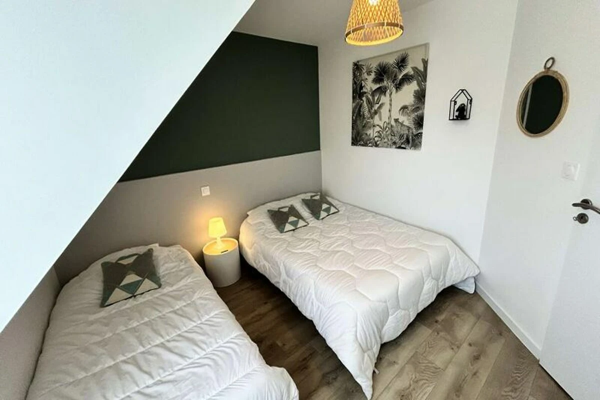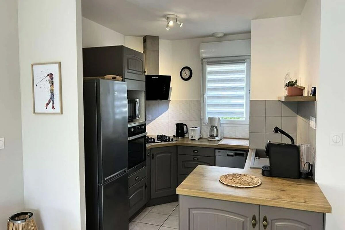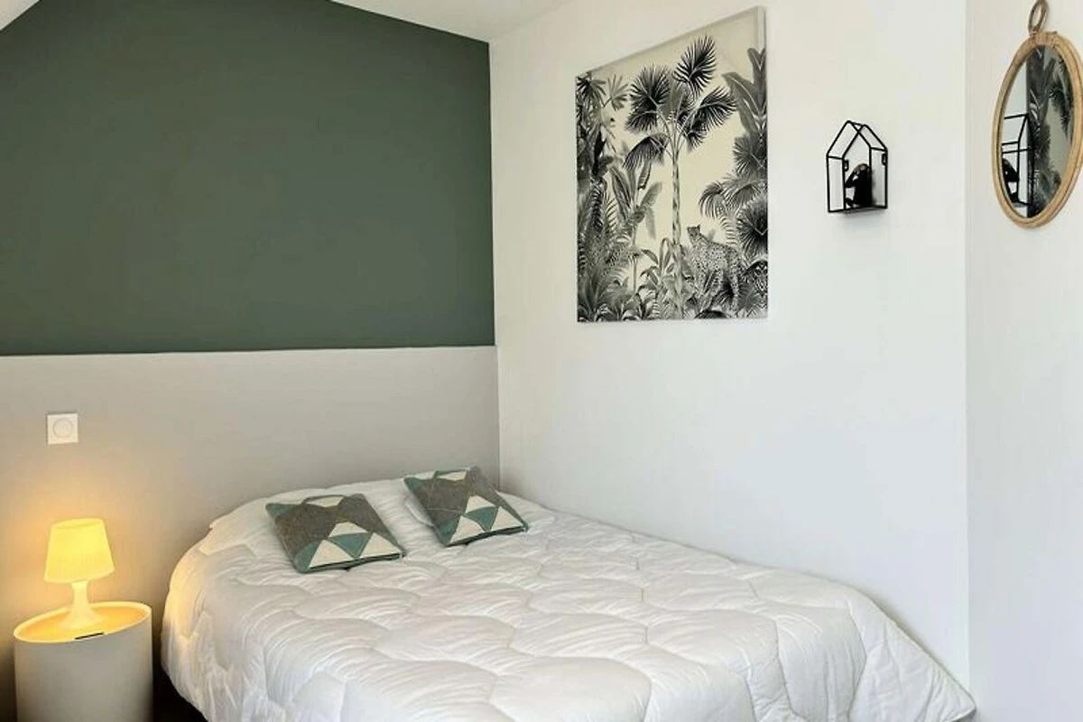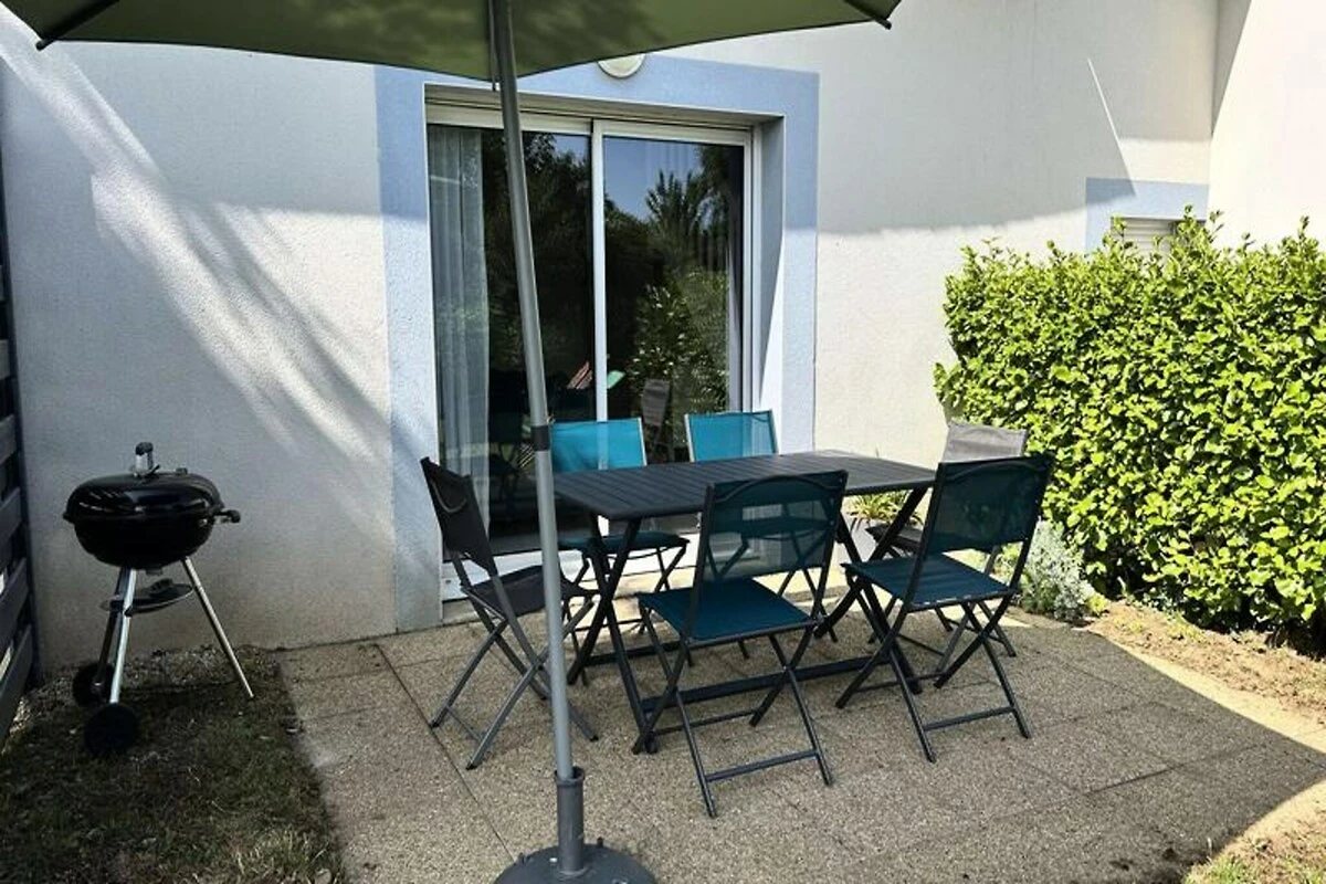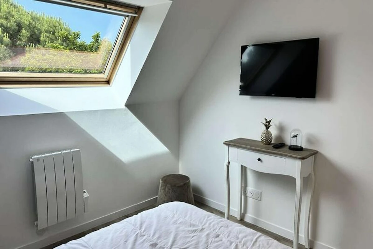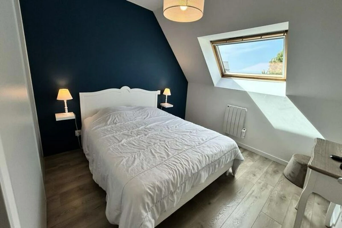 Nur wenige Schritte vom renommierten Golfplatz Pléneuf-Val-André entfernt, bietet dieses charmante Doppelhaus einen ruhigen Rückzugsort in einem privaten Anwesen mit Zugang zu einem gemeinschaftlichen Hallenbad. Die perfekte Lage für Entspannung und Abenteuer gleichermaßen macht dieses Haus zum idealen Ziel. Hier können Sie inmitten der Schönheit der bretonischen Küste die Seele baumeln lassen und gleichzeitig modernen Komfort und die Nähe zum Strand von Vallées genießen. Ob Sie ein begeisterter Golfer sind oder einfach nur eine friedliche Auszeit suchen – dieses Haus bietet den perfekten Rahmen für unvergessliche Momente. Das 57 m² große Haus ist durchdacht gestaltet und besticht durch Komfort und Funktionalität. Im Erdgeschoss befindet sich ein geräumiges und lichtdurchflutetes Wohnzimmer mit einer gemütlichen Sitzecke, ausgestattet mit Sofa, Sesseln und Fernseher, sowie ein Essbereich für bis zu fünf Personen. Die offene Küche ist komplett ausgestattet mit allem, was Sie benötigen, darunter Gasherd, Backofen, Mikrowelle, Kühl-/Gefrierkombination, Geschirrspüler und Kaffeemaschine für Ihren morgendlichen Kaffee. Im Obergeschoss befinden sich zwei einladende Schlafzimmer: eines mit einem Queensize-Bett und das andere mit einem Doppelbett und einem zusätzlichen Einzelbett – ideal für Familien oder kleine Gruppen. Ein modernes Badezimmer mit Dusche und Waschmaschine sorgt für zusätzlichen Komfort. WLAN und kostenlose Parkplätze direkt vor dem Haus sind inklusive und garantieren einen unbeschwerten Aufenthalt. \n\nDie Umgebung des Hauses bietet zahlreiche Attraktionen. Spielen Sie eine Runde Golf auf dem nahegelegenen Golfplatz, spazieren Sie am Sandstrand von Vallées entlang oder erkunden Sie die charmanten Dörfer und malerischen Wanderwege der Bretagne. Der gemeinschaftlich genutzte Innenpool des Anwesens lädt im Sommer zu einer erfrischenden Abkühlung ein, während das reiche kulturelle Erbe und die kulinarischen Köstlichkeiten der Region unzählige Entdeckungen versprechen. \n\nOb Sie einen Golfurlaub, eine Auszeit am Meer oder einfach nur Entspannung suchen – dieses charmante Haus ist Ihr Tor zu den schönsten Seiten der Bretagne. Buchen Sie Ihren Aufenthalt und schaffen Sie unvergessliche Erinnerungen in dieser idyllischen Umgebung.