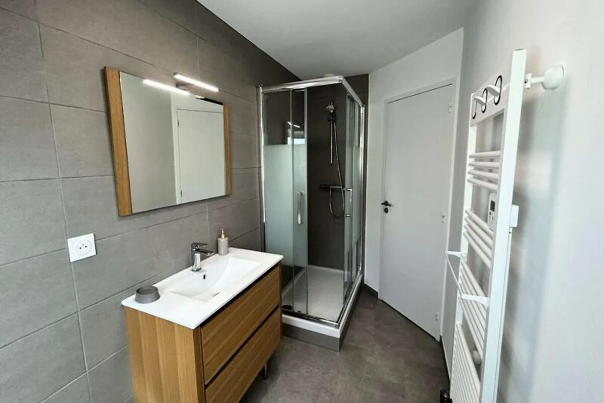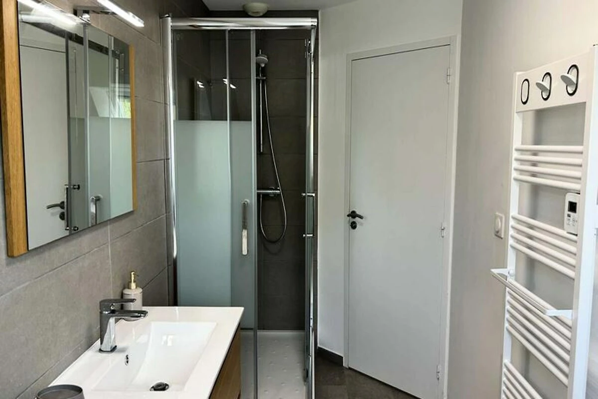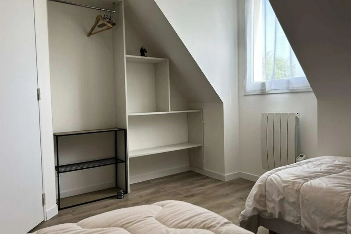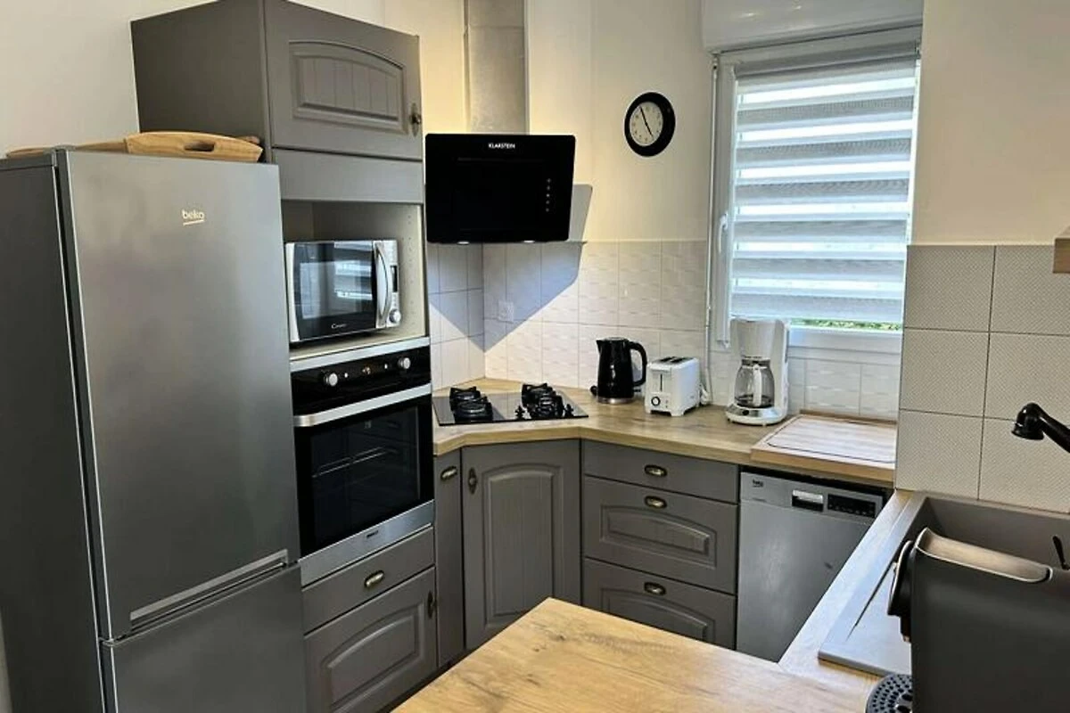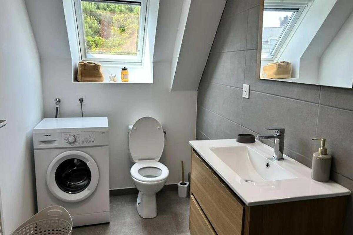 Nur wenige Schritte vom renommierten Golfplatz Pléneuf-Val-André entfernt, bietet dieses charmante Doppelhaus einen ruhigen Rückzugsort in einem privaten Anwesen mit Zugang zu einem gemeinschaftlichen Hallenbad. Die perfekte Lage für Entspannung und Abenteuer gleichermaßen macht dieses Haus zum idealen Ziel. Hier können Sie inmitten der Schönheit der bretonischen Küste die Seele baumeln lassen und gleichzeitig modernen Komfort und die Nähe zum Strand von Vallées genießen. Ob Sie ein begeisterter Golfer sind oder einfach nur eine friedliche Auszeit suchen – dieses Haus bietet den perfekten Rahmen für unvergessliche Momente. Das 57 m² große Haus ist durchdacht gestaltet und besticht durch Komfort und Funktionalität. Im Erdgeschoss befindet sich ein geräumiges und lichtdurchflutetes Wohnzimmer mit einer gemütlichen Sitzecke, ausgestattet mit Sofa, Sesseln und Fernseher, sowie ein Essbereich für bis zu fünf Personen. Die offene Küche ist komplett ausgestattet mit allem, was Sie benötigen, darunter Gasherd, Backofen, Mikrowelle, Kühl-/Gefrierkombination, Geschirrspüler und Kaffeemaschine für Ihren morgendlichen Kaffee. Im Obergeschoss befinden sich zwei einladende Schlafzimmer: eines mit einem Queensize-Bett und das andere mit einem Doppelbett und einem zusätzlichen Einzelbett – ideal für Familien oder kleine Gruppen. Ein modernes Badezimmer mit Dusche und Waschmaschine sorgt für zusätzlichen Komfort. WLAN und kostenlose Parkplätze direkt vor dem Haus sind inklusive und garantieren einen unbeschwerten Aufenthalt. \n\nDie Umgebung des Hauses bietet zahlreiche Attraktionen. Spielen Sie eine Runde Golf auf dem nahegelegenen Golfplatz, spazieren Sie am Sandstrand von Vallées entlang oder erkunden Sie die charmanten Dörfer und malerischen Wanderwege der Bretagne. Der gemeinschaftlich genutzte Innenpool des Anwesens lädt im Sommer zu einer erfrischenden Abkühlung ein, während das reiche kulturelle Erbe und die kulinarischen Köstlichkeiten der Region unzählige Entdeckungen versprechen. \n\nOb Sie einen Golfurlaub, eine Auszeit am Meer oder einfach nur Entspannung suchen – dieses charmante Haus ist Ihr Tor zu den schönsten Seiten der Bretagne. Buchen Sie Ihren Aufenthalt und schaffen Sie unvergessliche Erinnerungen in dieser idyllischen Umgebung.