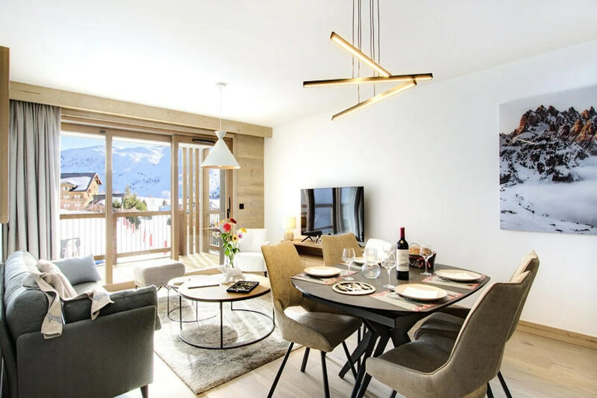 Am Rande der unberührten Pisten von Les Arcs 1800 bietet dieses elegante Ski-in/Ski-out-Apartment einen luxuriösen alpinen Rückzugsort mit direktem Zugang zu erstklassigen Skigebieten und atemberaubendem Bergpanorama. Stellen Sie sich vor, wie Sie morgens auf Ihrer nach Südosten ausgerichteten Terrasse Ihren Kaffee genießen und die Sonne tanken, während die schneebedeckten Gipfel vor Ihnen glitzern. Diese Unterkunft vereint modernen Komfort mit dem Charme der französischen Alpen und ist somit ein unvergesslicher Ort für Familien und Freunde. Treten Sie ein und entdecken Sie einen großzügigen Wohnbereich, der zum Entspannen und Beisammensein einlädt. Das Esszimmer mit Fernseher lädt nach einem erlebnisreichen Tag zu gemütlichen Abenden ein, während die voll ausgestattete Küche – mit Backofen, Mikrowelle, Geschirrspüler, Kühlschrank, Induktionskochfeld und Waschmaschine – die Zubereitung von Mahlzeiten zum Vergnügen macht. Das Apartment bietet bequem Platz für bis zu sechs Gäste, mit zwei Schlafzimmern mit Queensize-Betten und einer charmanten Hütte mit Etagenbetten. Ein separates Badezimmer und WC sorgen für Komfort, und der Skiraum bietet direkten Zugang zu den Pisten für mühelose Erkundungstouren in den Alpen. Die Residenz selbst ist eine Oase der Entspannung und Erholung mit Annehmlichkeiten wie Swimmingpool, Fitnessraum, Sauna, Dampfbad und Erlebnisduschen. Ob Sie nach einem Tag auf der Piste relaxen oder sich eine wohltuende Spa-Behandlung gönnen – hier ist jeder Moment ein Genuss. Bettwäsche, Handtücher und Willkommensprodukte sowie die Endreinigung sind inklusive, sodass Ihr Aufenthalt reibungslos und stressfrei verläuft. Wählen Sie diese außergewöhnliche Unterkunft für einen Urlaub voller Abenteuer, Entspannung und der unvergleichlichen Schönheit der französischen Alpen.
