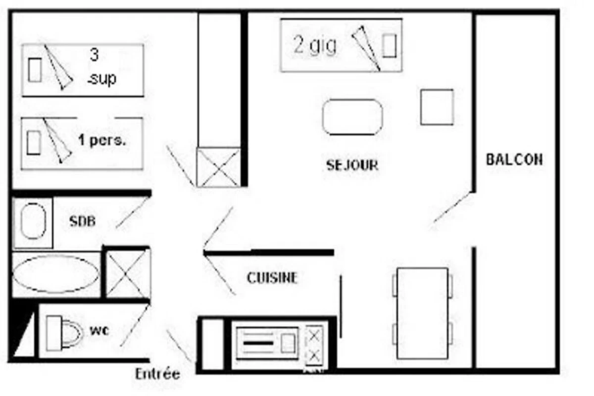 , Küche(Backofen, Spülmaschine, ), Schlafzimmer(Einzelbett, Etagenbett für 3 Personen), Badezimmer(Dusche, Waschbecken), Balkon, Heizung