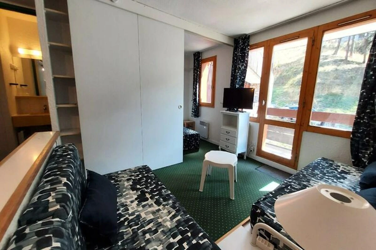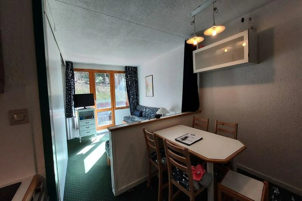 Hoch über dem charmanten Bergdorf Montchavin bietet dieses gemütliche 25 m² große Apartment einen ruhigen Rückzugsort für bis zu vier Gäste. Im dritten Stock der Residenz Le 4ème Dé gelegen, lädt es zum Entspannen nach einem Tag voller Bergabenteuer ein. Der nach Süden ausgerichtete Balkon bietet einen atemberaubenden Blick auf den Ort, wo die Schönheit der umliegenden Gipfel auf die lebendige Atmosphäre des Dorfes trifft. Ob Sie nun den Nervenkitzel des Skifahrens oder die Ruhe der Natur suchen – dieses Apartment ist der perfekte Ausgangspunkt. Im Inneren erwartet Sie eine durchdachte Raumaufteilung mit einem Schlafzimmer mit einem komfortablen Doppelbett und einer verschiebbaren Trennwand für mehr Privatsphäre. Das Wohnzimmer mit zwei Einzelbetten und einem Fernseher bietet einen gemütlichen Platz zum Entspannen. Die Küche ist komplett ausgestattet mit modernen Annehmlichkeiten wie Mikrowelle, Geschirrspüler, Induktionskochfeld, Kühlschrank und sogar einem Raclette- und Fondue-Set für authentische alpine Genusserlebnisse. Das Badezimmer mit separatem WC sorgt für Komfort, und die Bettdecken im Apartment versprechen eine erholsame Nachtruhe. Bitte beachten Sie, dass es sich um ein Nichtraucher-Apartment ohne Haustiere und WLAN handelt. So können Sie die Ruhe und die Bergatmosphäre in vollen Zügen genießen.