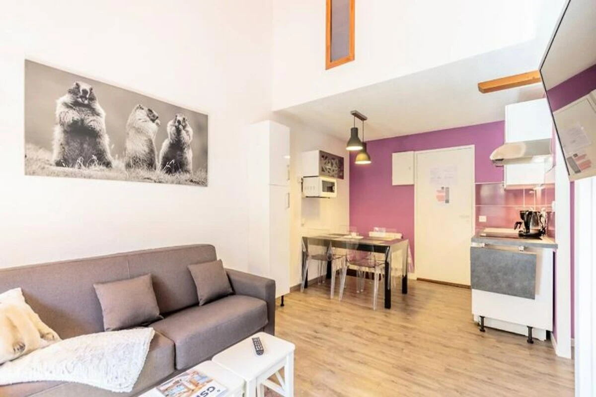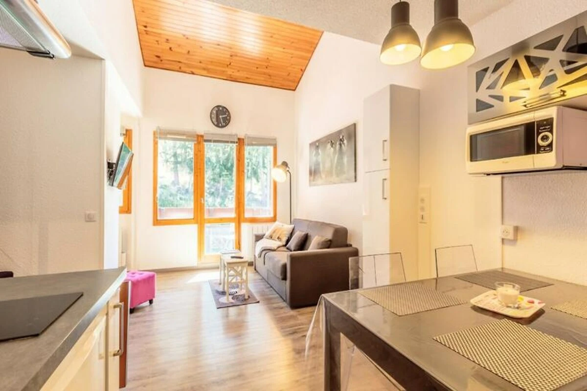 Hoch über dem charmanten Bergdorf Montchavin bietet dieses gemütliche Maisonette-Apartment einen ruhigen Rückzugsort für bis zu fünf Gäste und verbindet modernen Komfort mit traditionellem Bergflair. Die 38 m² große Wohnung befindet sich im 4. Stock der Residenz Le 4ème Dé und ist ideal für Familien oder kleine Gruppen, die inmitten der atemberaubenden Schönheit der französischen Alpen eine friedliche Auszeit suchen. Vom Südbalkon aus genießen Sie einen ungestörten Blick auf den Ort und die umliegenden Gipfel – ein Genuss für jeden Morgen.