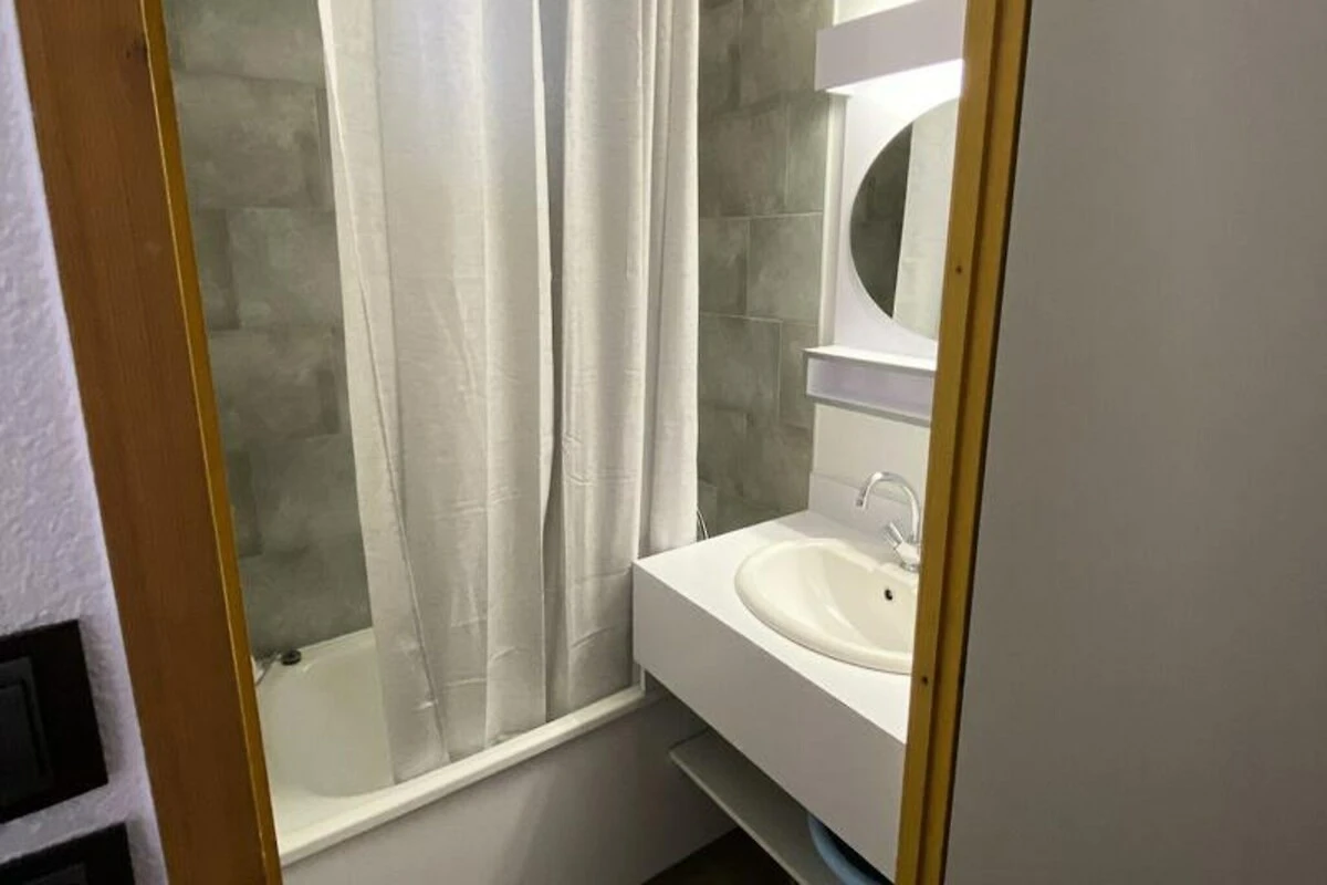 Das Badezimmer ist mit einem Waschbecken und einer Badewanne ausgestattet. Es gibt ein separates WC.