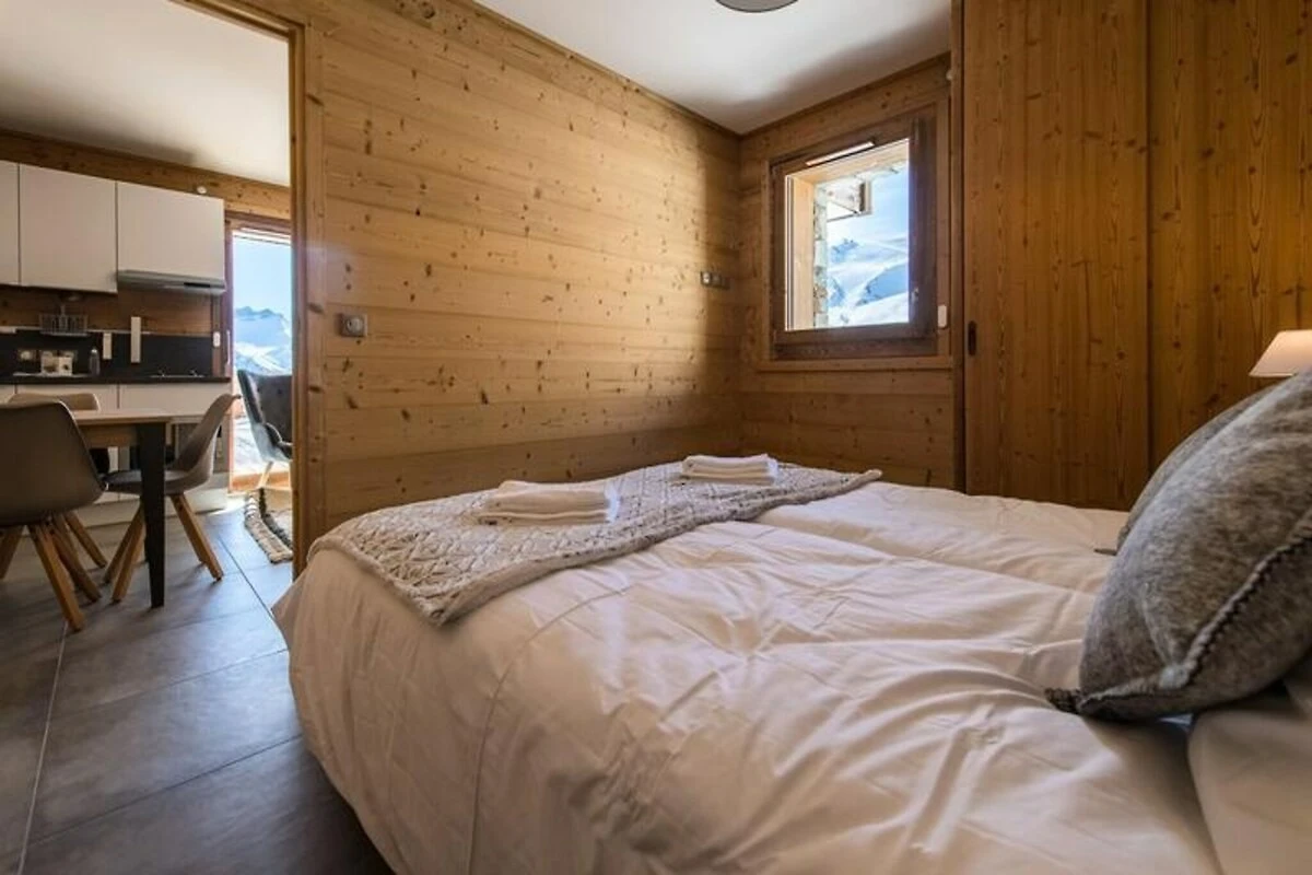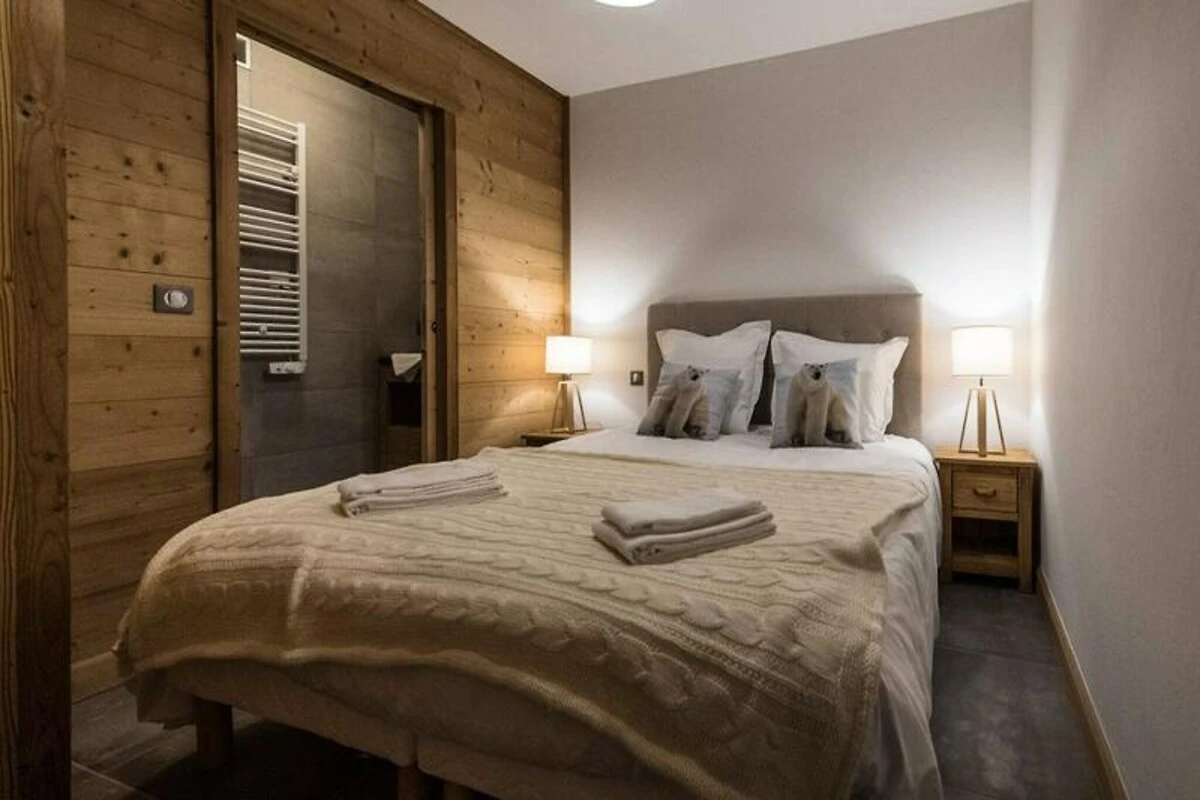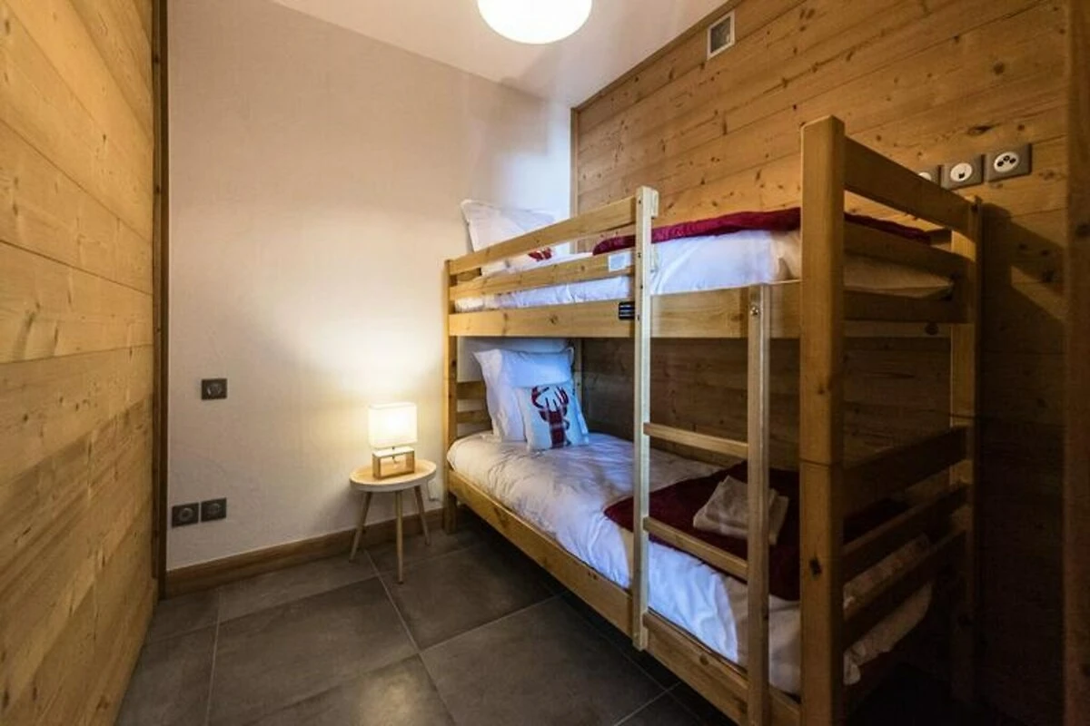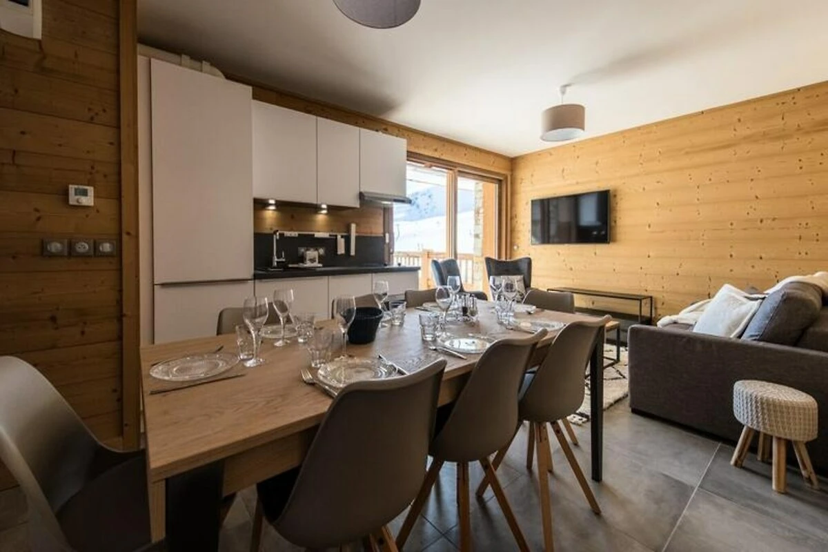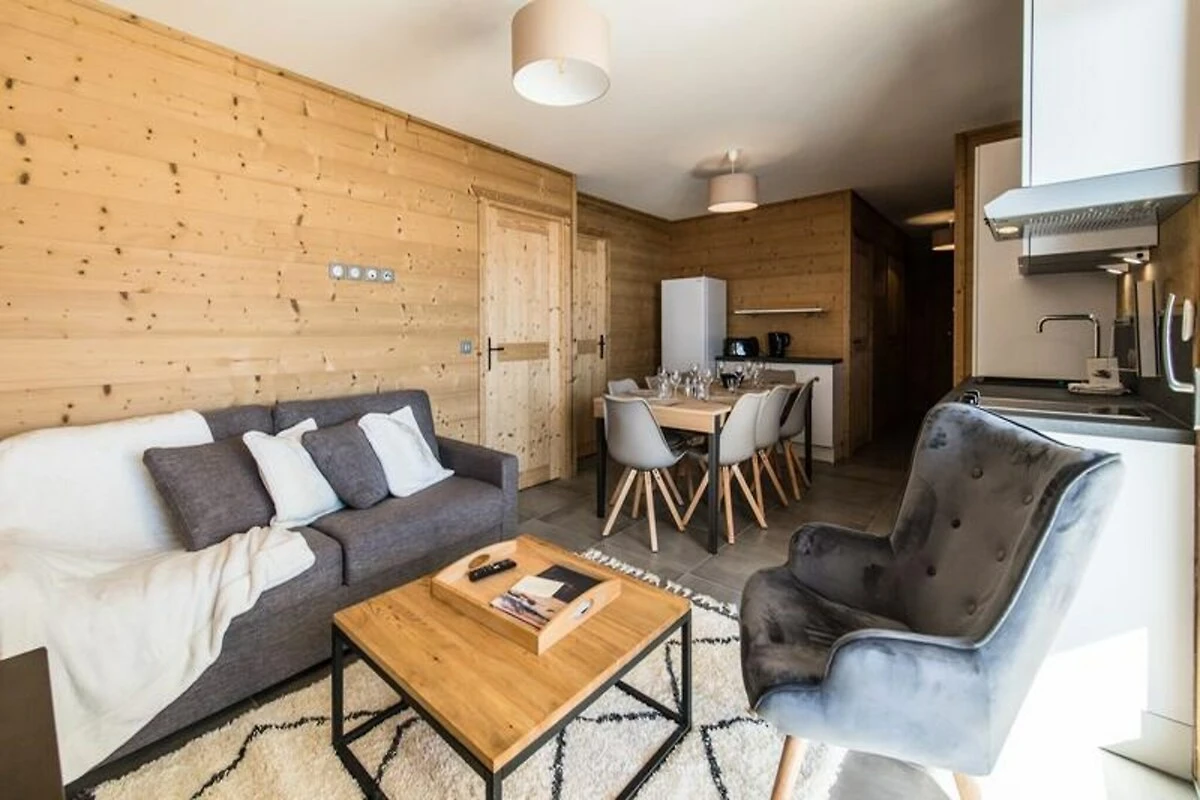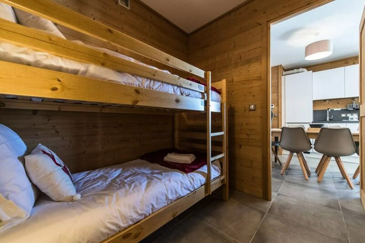 Das Apartment verfügt über ein Wohnzimmer mit Zugang zur Terrasse und einem herrlichen Blick auf die Aiguilles d'Arves. Das Wohnzimmer bietet einen Sitzbereich mit Schlafsofa, einen Essbereich und eine voll ausgestattete Küche. Das erste Schlafzimmer mit eigenem Bad ist mit einem 140 cm breiten Bett ausgestattet. Das zweite Schlafzimmer verfügt über zwei 80 cm breite Betten und teilt sich ein Badezimmer mit dem Schlafbereich und einem Etagenbett (das obere Etagenbett ist nicht für Kinder unter 6 Jahren geeignet). Ein separates WC rundet das Angebot ab.