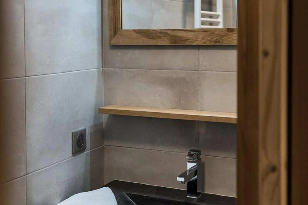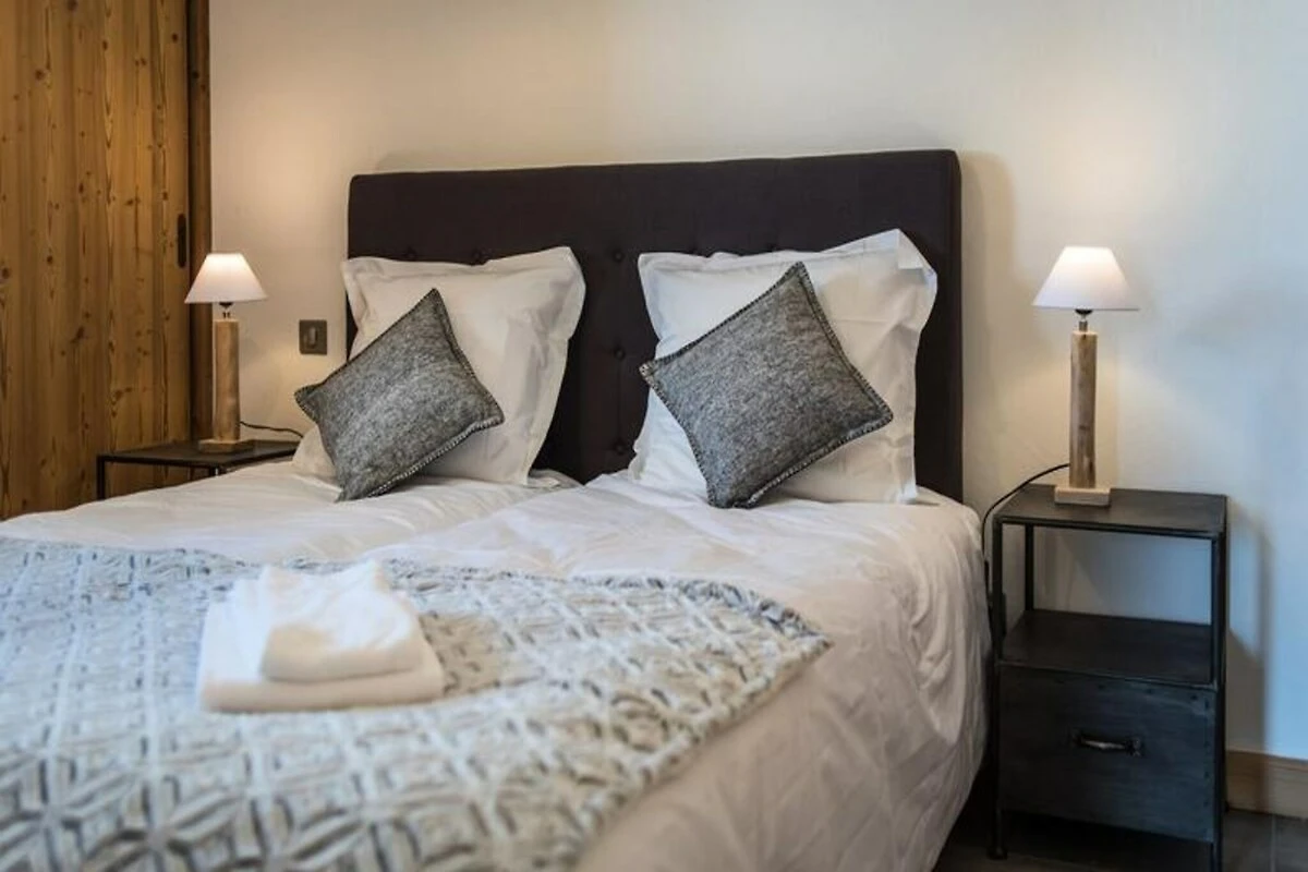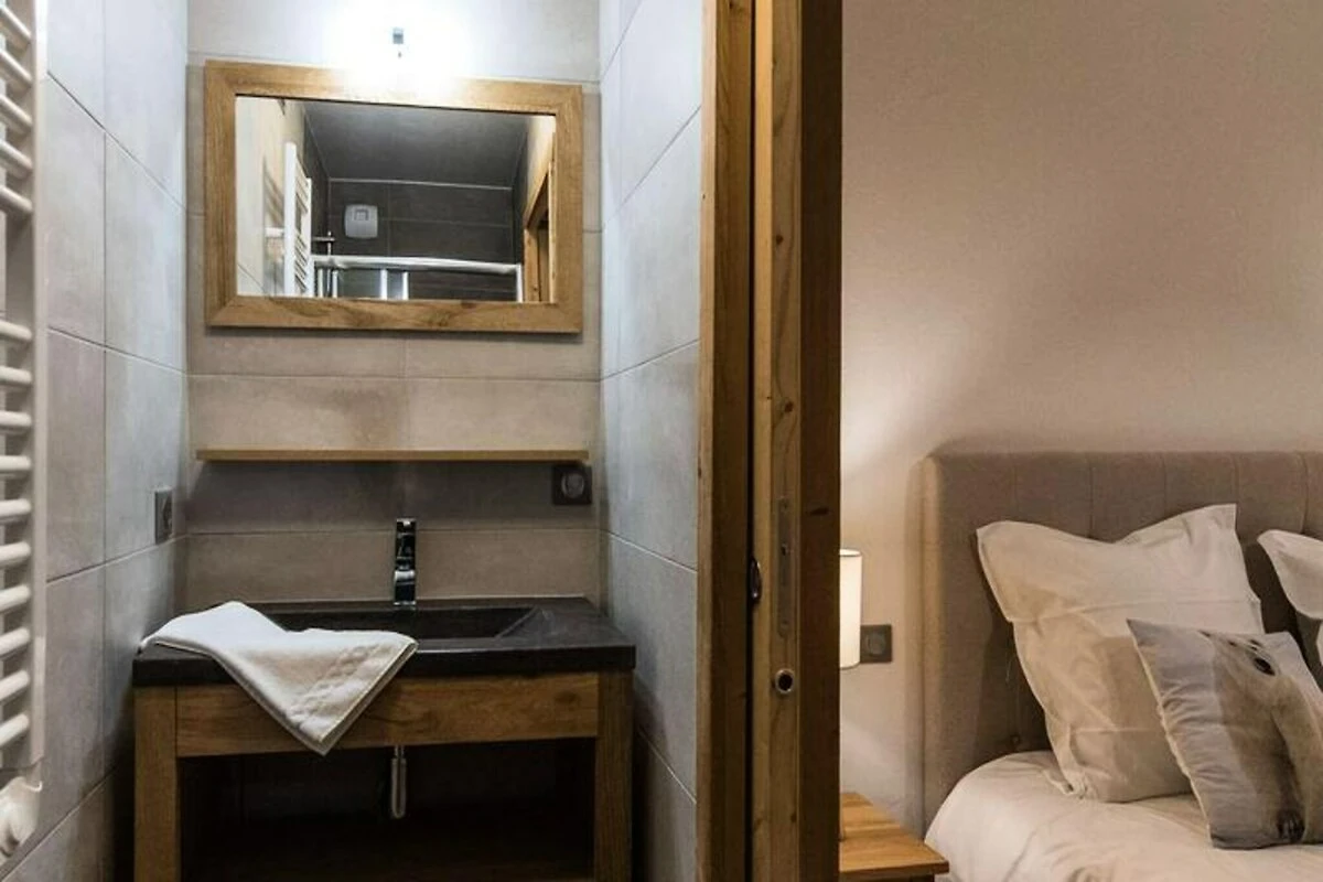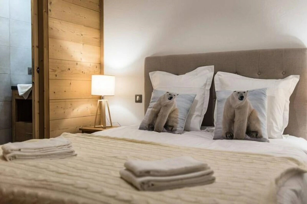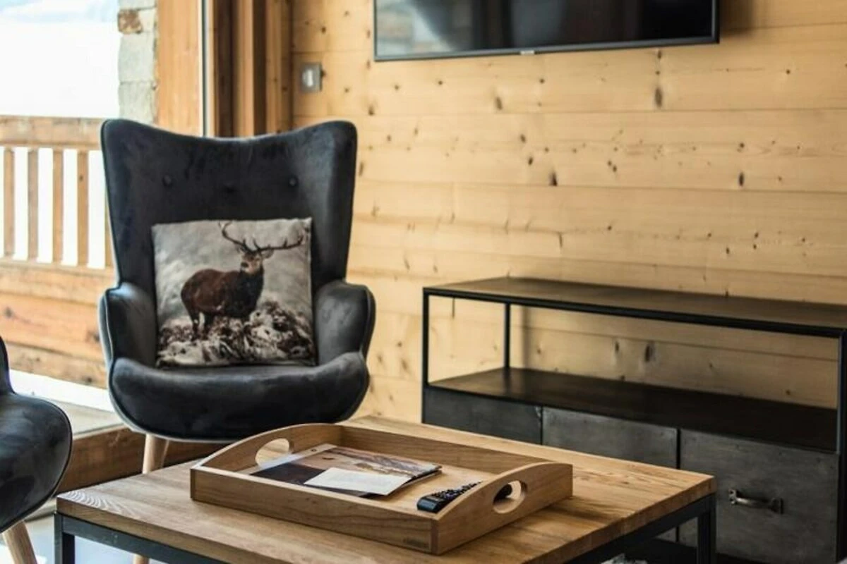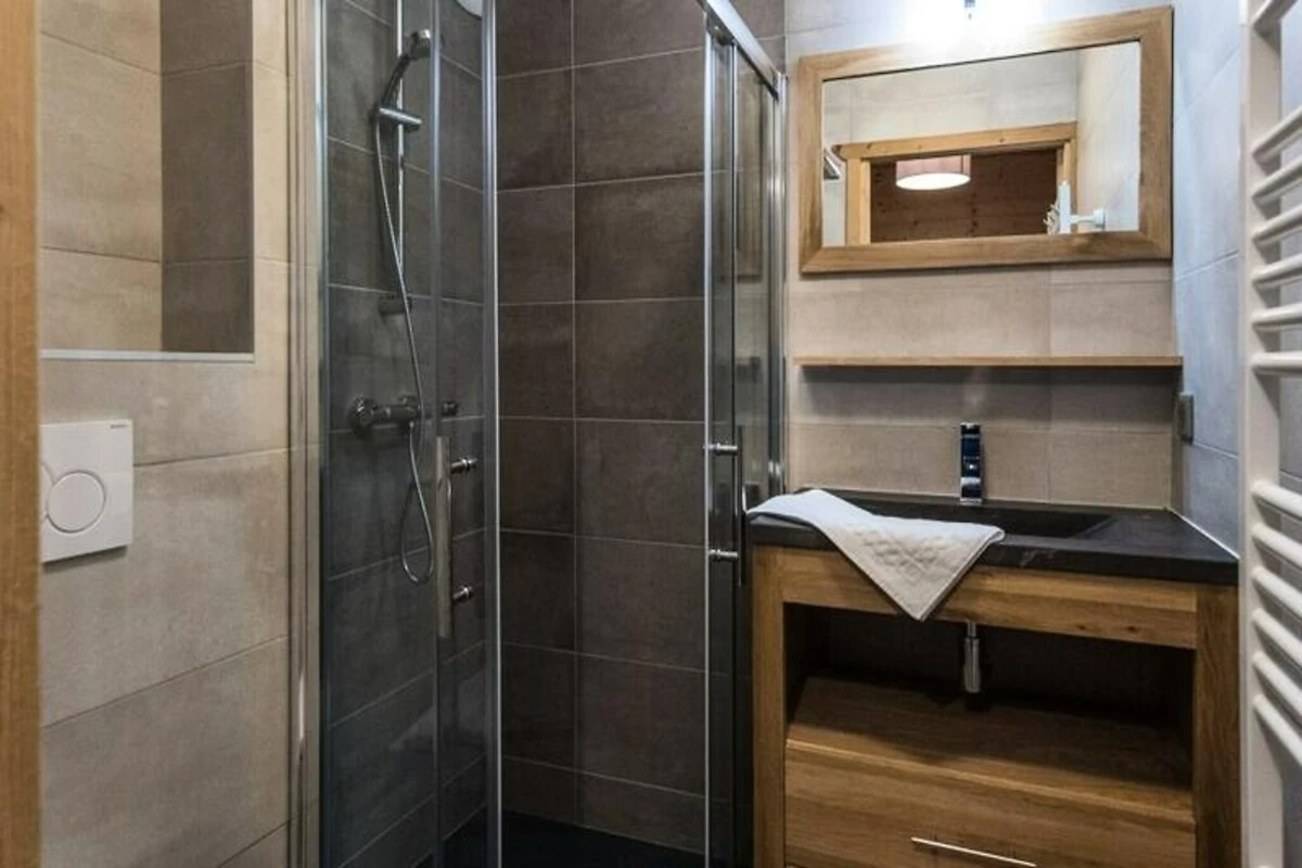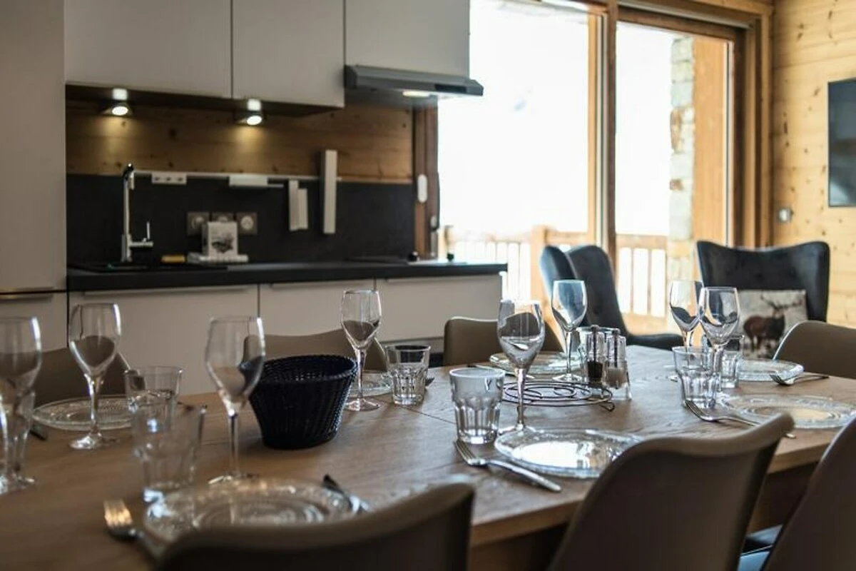 Das Apartment verfügt über ein Wohnzimmer mit Zugang zur Terrasse und einem herrlichen Blick auf die Aiguilles d'Arves. Das Wohnzimmer bietet einen Sitzbereich mit Schlafsofa, einen Essbereich und eine voll ausgestattete Küche. Das erste Schlafzimmer mit eigenem Bad ist mit einem 140 cm breiten Bett ausgestattet. Das zweite Schlafzimmer verfügt über zwei 80 cm breite Betten und teilt sich ein Badezimmer mit dem Schlafbereich und einem Etagenbett (das obere Etagenbett ist nicht für Kinder unter 6 Jahren geeignet). Ein separates WC rundet das Angebot ab.