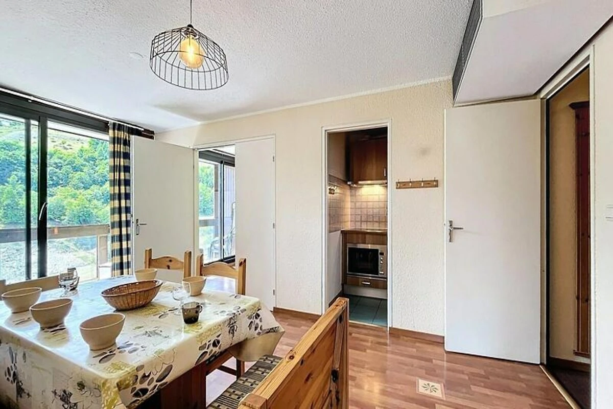 Das 47 m² große Apartment ist durchdacht gestaltet und bietet Platz für bis zu sieben Gäste. Das Wohnzimmer mit seinem gemütlichen Doppelschlafsofa und Fernseher öffnet sich zum Balkon und lädt zum Entspannen nach einem erlebnisreichen Tag ein. Die separate Küchenzeile ist komplett ausgestattet mit Geschirrspüler, Cerankochfeld, Minibackofen, Mikrowelle und einem großen Kühl-/Gefrierschrank – so wird die Zubereitung von Mahlzeiten zum Kinderspiel. Zwei komfortable Schlafzimmer, eines mit Doppelbett und das andere mit drei Einzelbetten, bieten direkten Zugang zum Balkon, sodass jeder den atemberaubenden Alpenblick genießen kann. Moderne Annehmlichkeiten wie eine Waschmaschine und ein Skischrank sorgen für zusätzlichen Komfort. Außerhalb des Apartments steht Gästen ein beheizter Swimmingpool zur Verfügung – ideal zum Entspannen nach einem Tag auf der Piste. Familien freuen sich über den nahegelegenen Kinderspielplatz, und das ruhige Gebäude garantiert erholsame Abende. Dank der erstklassigen Lage, der durchdachten Ausstattung und der traumhaften Aussicht ist diese Unterkunft der ideale Ausgangspunkt für unvergessliche Alpenerlebnisse – egal ob Sie durch den Pulverschnee gleiten oder die belebten Sommerwanderwege erkunden.