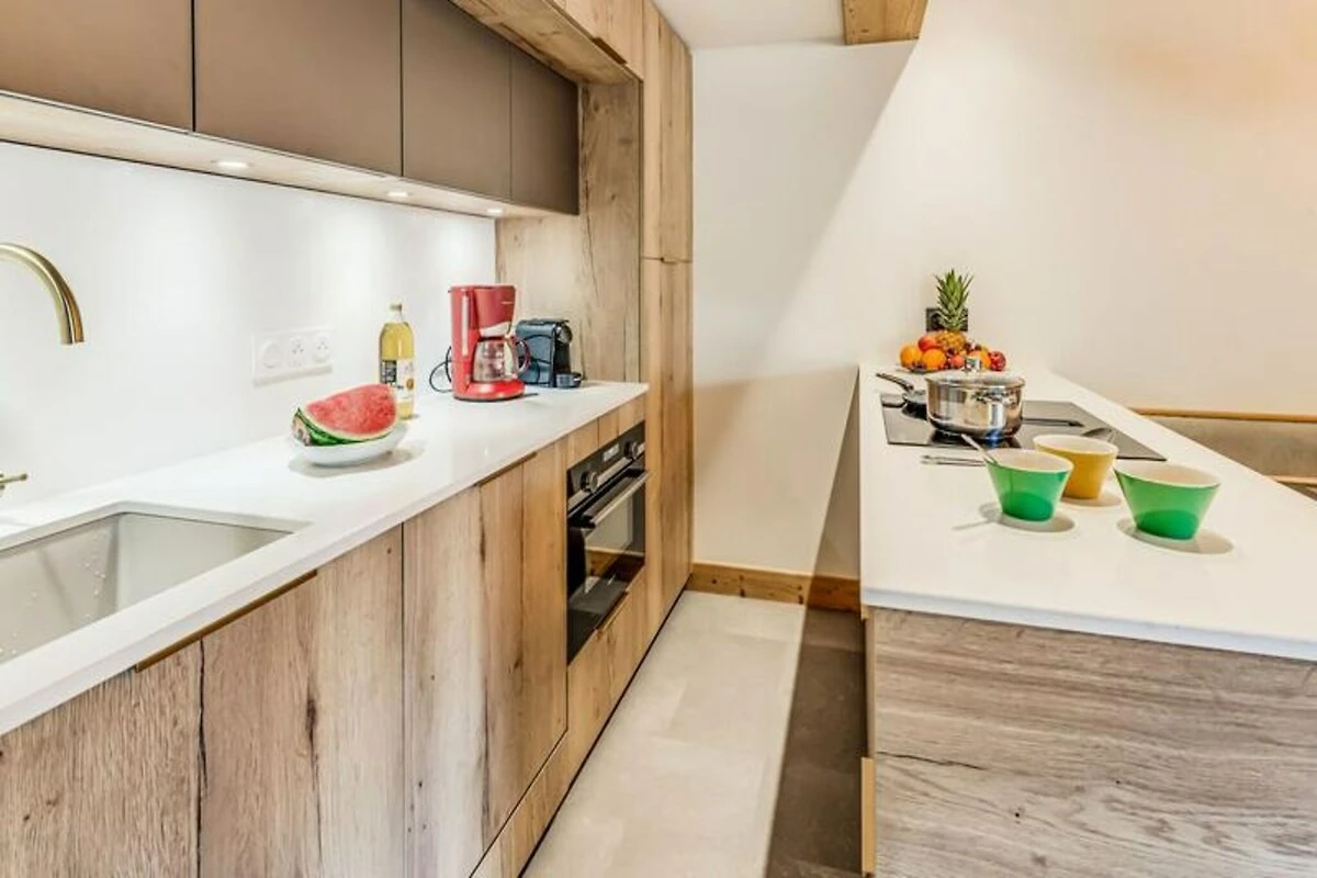 – Ausgestattete Küche mit Zugang zum Wohnzimmer mit Kühlschrank mit Gefrierfach, Herd, Backofen, Mikrowelle und Geschirrspüler
