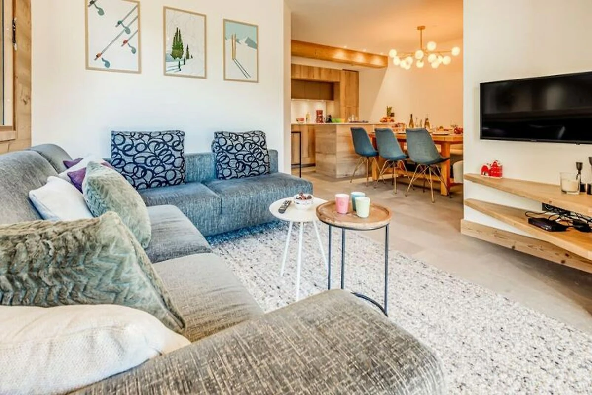 – Wohnzimmer, Sitzecke, Essbereich mit Zugang zur Südterrasse und großem Westfenster mit Sofa und TV