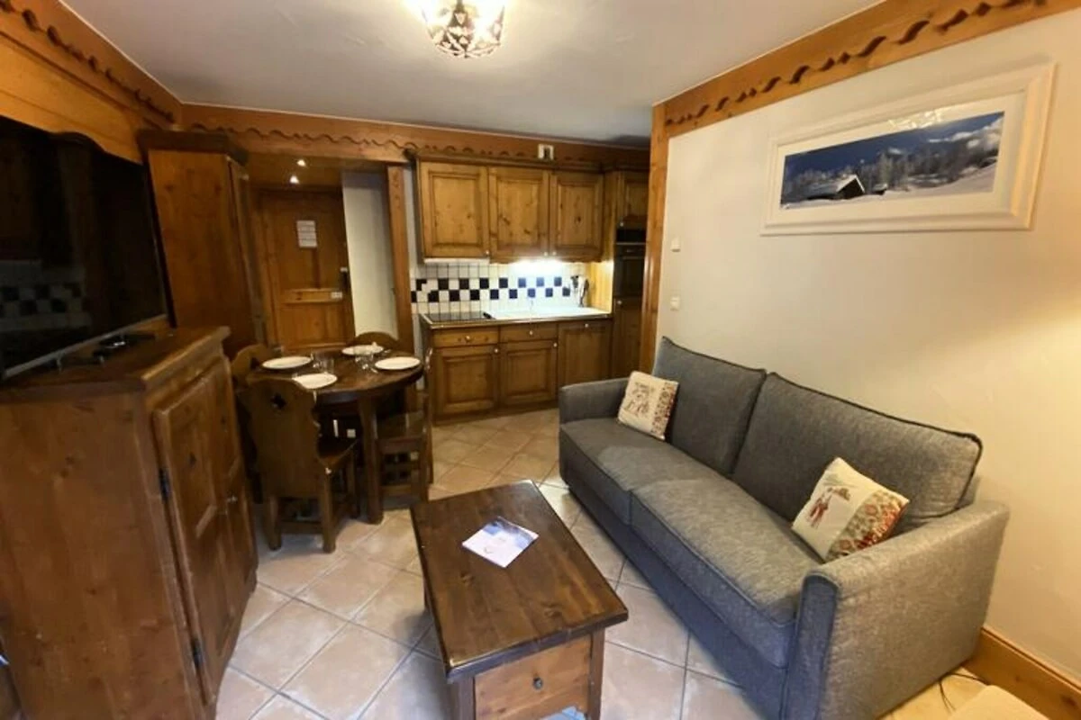 Das durchdacht gestaltete 30 m² große Apartment bietet Platz für bis zu vier Gäste und ist somit ideal für Paare oder kleine Familien. Das Wohnzimmer verfügt über ein bequemes Doppelschlafsofa, während das separate Schlafzimmer mit einem luxuriösen Doppelbett für erholsame Nächte ausgestattet ist. Die Küchenzeile ist komplett ausgestattet mit Elektroherd, Backofen mit Mikrowelle, Geschirrspüler und Kühlschrank, sodass Sie Ihre Mahlzeiten problemlos zubereiten können. Ein privater, nach Nordwesten ausgerichteter Balkon bietet einen ruhigen Ort, um die frische Bergluft und den Blick auf die umliegenden Unterkünfte zu genießen. Zur weiteren Ausstattung gehören ein Fernseher, ein Skischrank und ein überdachter Parkplatz.