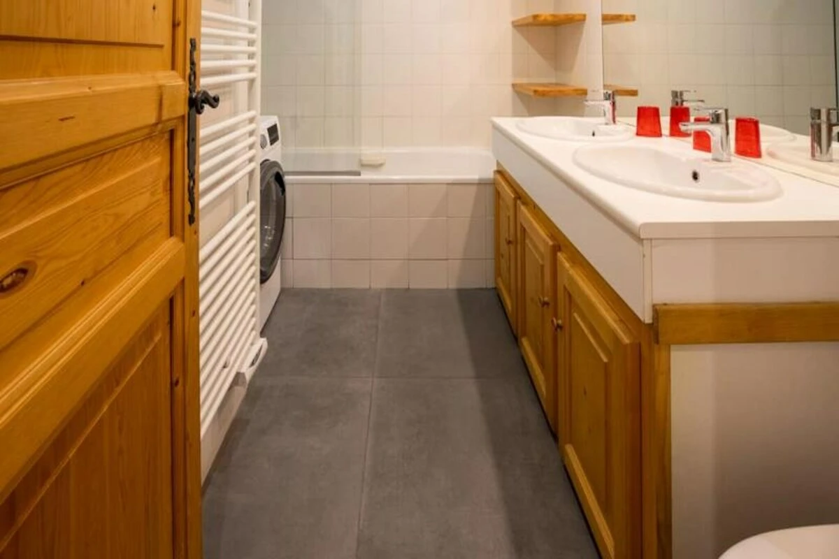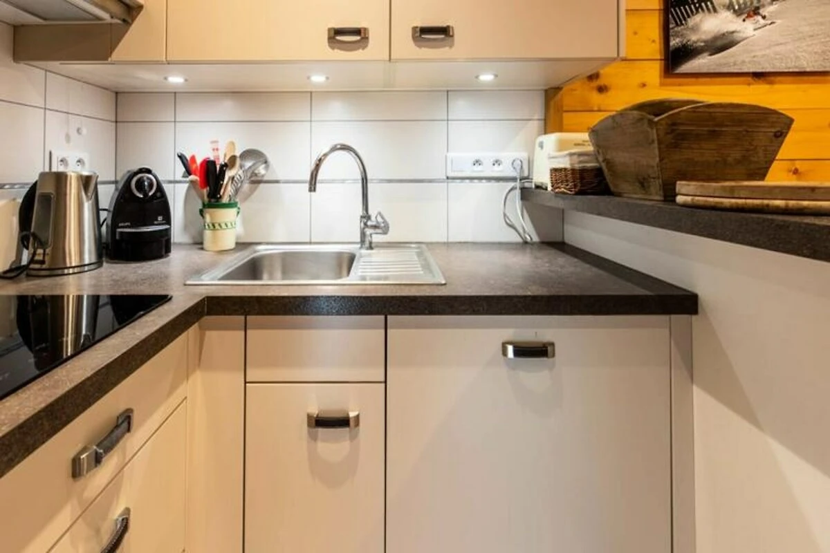 Im Inneren erwartet Sie ein geräumiger und einladender Wohnbereich, der zum Entspannen nach einem Tag auf der Piste einlädt. Die voll ausgestattete Küche bietet alles, was Sie für die Zubereitung leckerer Mahlzeiten benötigen: Geschirrspüler, Induktionskochfeld, Backofen, großer Kühlschrank, Nespresso-Kaffeemaschine, Wasserkocher und Toaster. Das Hauptschlafzimmer verfügt über ein komfortables Doppelbett und ein eigenes Duschbad, während das zweite Schlafzimmer ebenfalls mit einem Doppelbett ausgestattet ist. Ein drittes Schlafzimmer mit Etagenbetten macht dieses Apartment ideal für Familien oder Gruppen. Das geräumige Badezimmer ist mit Badewanne, Doppelwaschbecken, Waschmaschine und separatem WC ausgestattet. Ein privater Tiefgaragenstellplatz gehört ebenfalls dazu.
