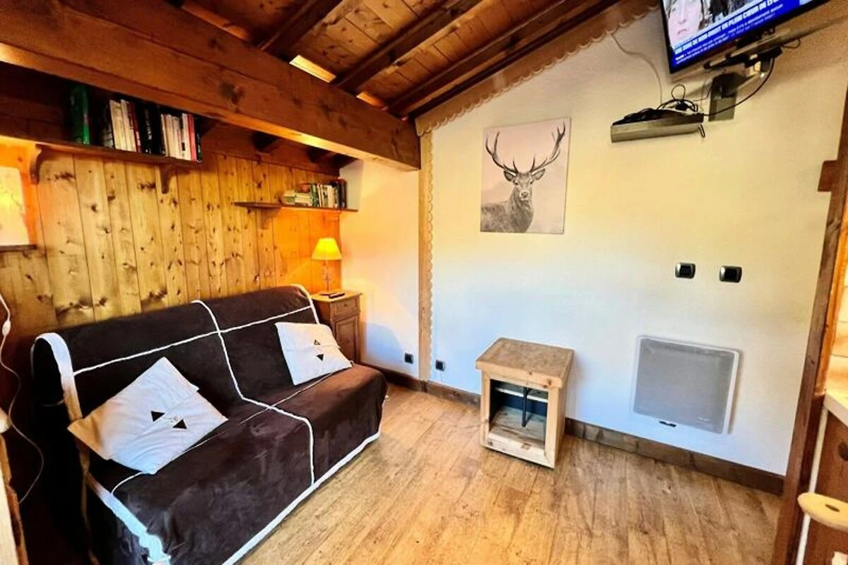 Im Inneren ist das Studio durchdacht gestaltet, um maximalen Komfort und Funktionalität zu bieten. Der Wohnbereich verfügt über ein Doppelschlafsofa, einen Fernseher und eine Küchenzeile mit allem Nötigen wie Minibackofen, Mikrowelle und Kühlschrank. Das Badezimmer ist mit Dusche und WC ausgestattet, während die savoyische Einrichtung unter den Dachschrägen eine warme und einladende Atmosphäre schafft. Ein privater Skischrank und ein Parkplatz im Freien sorgen für zusätzlichen Komfort, und Haustiere sind willkommen – ein Zuhause fernab von Zuhause für alle.