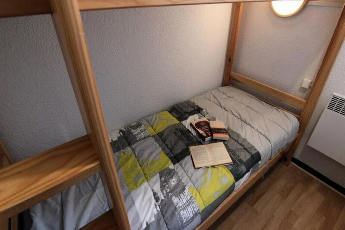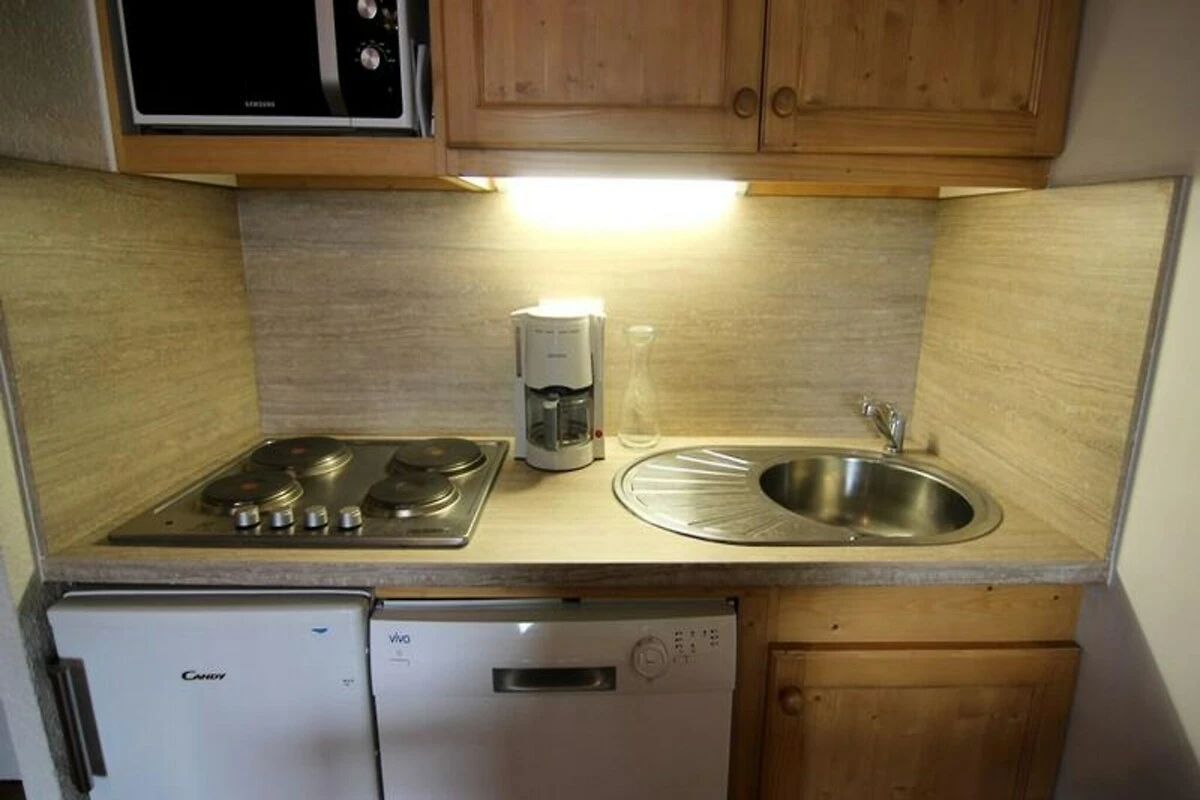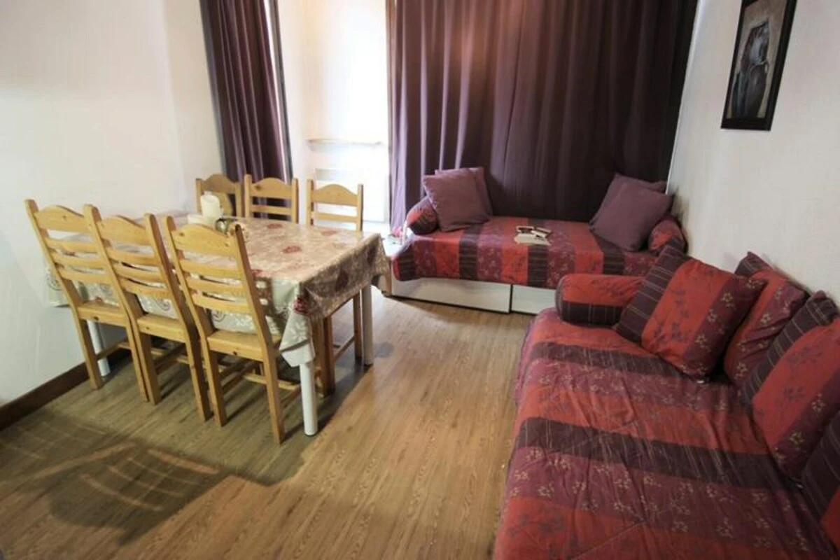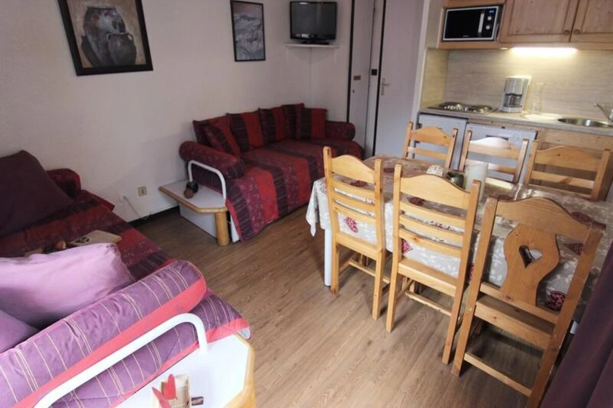 Hoch über dem pulsierenden Herzen von Val Thorens bietet dieses charmante Apartment im ruhigen Stadtteil Slalom einen friedlichen Rückzugsort mit direktem Zugang zu erstklassigen Skigebieten. Stellen Sie sich vor, wie Sie morgens mit der frischen Alpenluft erwachen und auf Ihren nach Osten ausgerichteten Balkon treten, um die Morgensonne und den atemberaubenden Bergblick zu genießen. Ob Sie den Nervenkitzel auf den Pisten oder die Ruhe der schneebedeckten Gipfel suchen – diese Unterkunft ist perfekt gelegen, um Ihren Aufenthalt unvergesslich zu machen. Dank des nur 50 Meter entfernten Pistenzugangs können Sie je nach Schneelage direkt bis zum Gebäude abfahren und so nahtlos in Ihren Abenteuertag starten. \n\nDas Apartment ist durchdacht gestaltet und bietet Platz für bis zu sechs Gäste, ideal für Familien oder kleine Gruppen. Das Wohnzimmer verfügt über zwei bequeme Schlafsofas und einen Fernseher und lädt zum gemütlichen Entspannen nach einem Tag auf der Piste ein. Die Küchenzeile ist mit Mikrowelle, Elektroherd, Kühlschrank und Geschirrspüler ausgestattet, sodass Sie Ihre Mahlzeiten problemlos zubereiten können. Das separate Schlafzimmer mit Doppelbett und die Kabine mit Etagenbetten bieten erholsame Schlafmöglichkeiten für alle. Ein Badezimmer mit Badewanne und Waschbecken sowie ein separates WC sorgen für Komfort während Ihres gesamten Aufenthalts. \n\nDas Viertel Slalom ist nur wenige Gehminuten vom Einkaufszentrum Péclet entfernt, wo Sie lokale Geschäfte, Restaurants und die Skiliftkasse finden. Skiausrüstung können Sie bei Skiset Goitschel Sport, nur 150 Meter entfernt, ausleihen. Garagenstellplätze oder Parkplätze in Slalom bieten zusätzlichen Komfort. Ob Sie das lebhafte Skigebiet erkunden oder durch den Tiefschnee carven möchten – alles, was Sie brauchen, ist in unmittelbarer Nähe. \n\nDieses Apartment besticht durch seine unschlagbare Lage, das gemütliche Ambiente und die Nähe zu den Pisten. Ob Sie ein Winterwunderland oder einen sommerlichen Alpenurlaub planen – diese Unterkunft verspricht einen unvergesslichen Aufenthalt im Herzen der französischen Alpen.