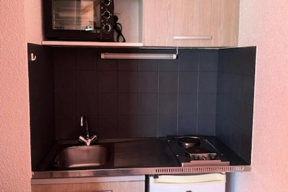Das Studio ist für bis zu drei Gäste ausgelegt und verfügt über eine praktische Aufteilung mit einem Schlafsofa, einem Einzelbett und einer gut ausgestatteten Küchenzeile mit Mikrowelle, Kühlschrank und Elektroherd. Im Wohnzimmer laden Fernseher und bequeme Sitzgelegenheiten zum Entspannen ein, während das Badezimmer mit Dusche und WC modern ausgestattet ist. Die Lage im sechsten Stock, der bequem mit dem Aufzug erreichbar ist, garantiert sowohl Privatsphäre als auch Komfort und macht das Studio zur idealen Wahl für Paare oder kleine Gruppen, die einen ruhigen und dennoch geselligen Aufenthalt suchen.