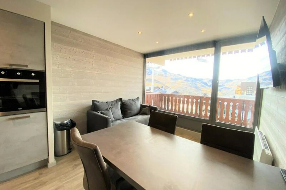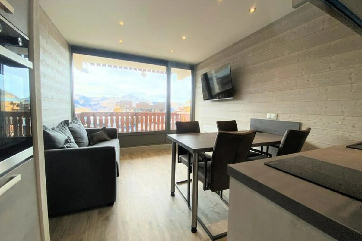 Mitten im lebhaften Ferienort gelegen, bietet die Residenz LES ETERLOUS die perfekte Mischung aus modernem Komfort und alpinem Charme. Direkt neben der berühmten Kirche und dem geschäftigen Einkaufszentrum Péclet gelegen, ist dieses gemütliche Studio der ideale Ausgangspunkt für unvergessliche Erlebnisse in den Bergen. Nur 30 Meter von den Pisten entfernt, sind Ihre alpinen Abenteuer stets in greifbarer Nähe – egal ob Sie durch frischen Pulverschnee gleiten oder die Sommerloipen genießen. Vom nach Südwesten ausgerichteten Balkon aus genießen Sie den atemberaubenden Blick auf den Ferienort und die majestätischen Gipfel, die Sie umgeben und eine traumhafte Kulisse für Ihren Aufenthalt bieten. \n\nDieses komplett renovierte, 28 m² große Studio im 4. Stock ist durchdacht gestaltet und bietet maximalen Komfort und Funktionalität. Das Wohnzimmer verfügt über ein bequemes Schlafsofa, während ein separater Schlafbereich mit Etagenbetten einen gemütlichen Rückzugsort für Familien oder kleine Gruppen bietet. Die gut ausgestattete Küche mit Kühlschrank, Herd, Backofen und Geschirrspüler macht die Zubereitung von Mahlzeiten zum Kinderspiel. Besondere Details wie elektrische Schuhtrockner sorgen für zusätzlichen Komfort und dafür, dass Ihre Ausrüstung für die Abenteuer des nächsten Tages bereit ist. Das Studio verfügt außerdem über ein separates WC und eine Dusche, die für mehr Privatsphäre und Bequemlichkeit sorgen.\n\nTreten Sie vor die Tür und tauchen Sie ein in die lebendige Atmosphäre des Resorts. Das nahegelegene Einkaufszentrum Péclet bietet eine Vielzahl an Geschäften, Restaurants und Après-Ski-Möglichkeiten, sodass Sie nie weit von Unterhaltung entfernt sind. Ob Sie ein erfahrener Skifahrer, ein Naturliebhaber oder einfach nur auf der Suche nach Entspannung sind – die Lage bietet die perfekte Balance zwischen Abenteuer und Erholung.\n\nWählen Sie LES ETERLOUS für einen unvergesslichen Alpenurlaub, bei dem jedes Detail darauf ausgelegt ist, Ihnen ein reibungsloses und angenehmes Erlebnis zu bieten. Von der atemberaubenden Aussicht bis zur unschlagbaren Lage ist dieses Studio Ihr idealer Ausgangspunkt, um die Schönheit der französischen Alpen zu entdecken.