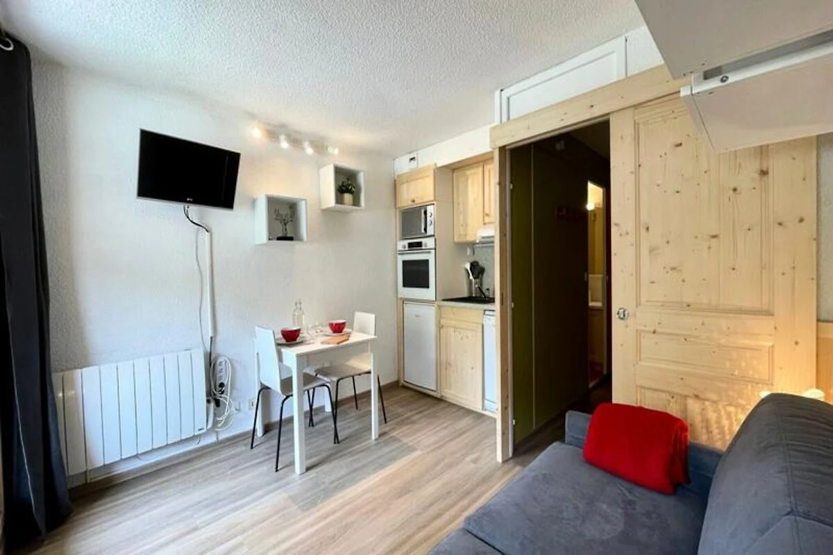 Hoch über den majestätischen Gipfeln der französischen Alpen bietet dieses charmante Studio in der Residenz LA ROCHE BLANCHE einen gemütlichen Rückzugsort für Paare, die Abenteuer und Ruhe suchen. Nur 50 Meter von den Pisten entfernt, können Sie direkt vor die Tür treten und in die aufregende Welt des Skifahrens oder Snowboardens eintauchen – mit direktem Zugang zu den unberührten Loipen von Val Thorens. Die Residenz liegt in unmittelbarer Nähe zum Einkaufszentrum und Sportkomplex Caron, sodass Sie alles Notwendige bequem erreichen können. Genießen Sie vom Balkon im fünften Stock den atemberaubenden Panoramablick auf die schneebedeckten Berge und atmen Sie die frische Alpenluft ein, die Ihre Sinne belebt. Das 2021 renovierte, 18 m² große Studio ist durchdacht gestaltet und bietet maximalen Komfort und Funktionalität. Im Eingangsbereich befinden sich ausklappbare Etagenbetten, während das Wohnzimmer mit einem Schlafsofa mit Doppelmatratze ausgestattet ist – für erholsame Nächte nach aktiven Tagen. Die kompakte Küche ist mit modernen Geräten wie Backofen, Mikrowelle und Geschirrspüler ausgestattet und ermöglicht Ihnen die einfache Zubereitung leckerer Mahlzeiten. Das Badezimmer ist mit einer Toilette ausgestattet, und die Nordausrichtung des Studios sorgt für eine ruhige Atmosphäre abseits des geschäftigen Treibens im Ferienort. \n\nOb Sie im Winter die Pisten hinunterwedeln oder im Sommer malerische Wanderwege erkunden möchten – die erstklassige Lage der Residenz bringt Sie mitten ins Geschehen. Schlendern Sie zu den nahegelegenen Geschäften, genießen Sie Après-Ski-Aktivitäten oder entspannen Sie sich nach einem erlebnisreichen Tag im Sportzentrum. Mit seiner gelungenen Kombination aus Komfort und Charme ist dieses Studio der perfekte Ausgangspunkt für unvergessliche Erinnerungen in den Alpen. \n\nEntfliehen Sie dem Alltag und tauchen Sie ein in die idyllische Schönheit von Val Thorens. Die LA ROCHE BLANCHE Residence ist Ihr Tor zu den Wundern der französischen Alpen.