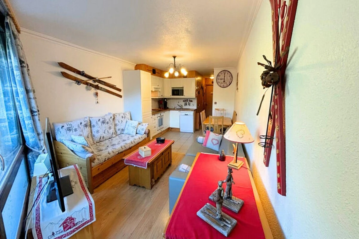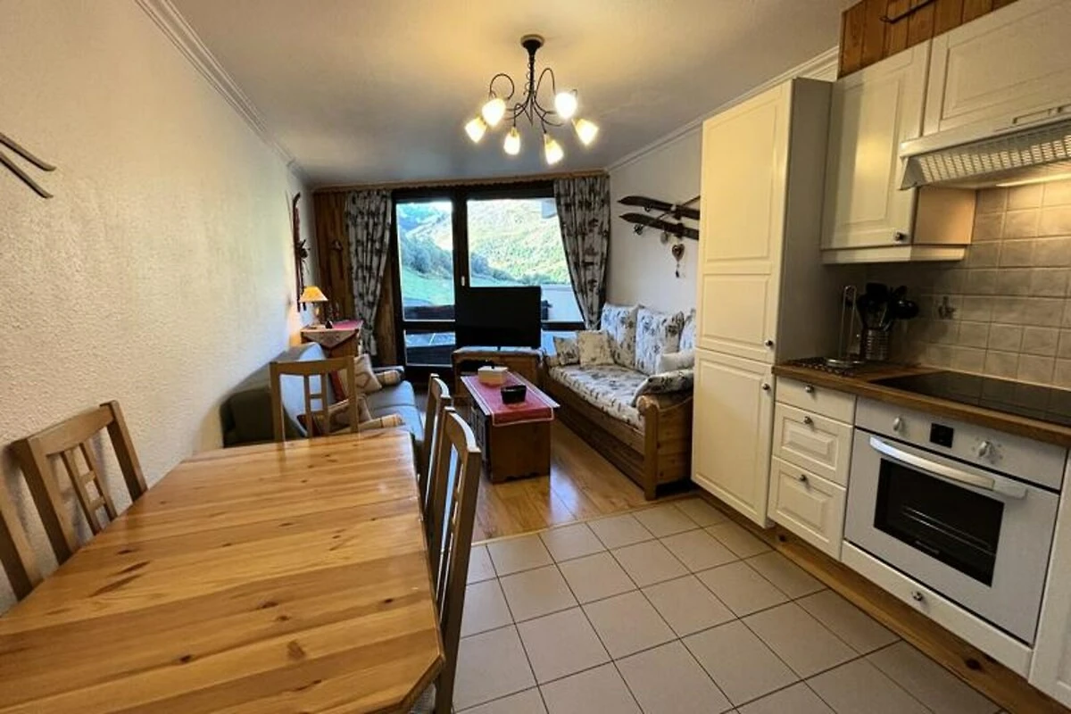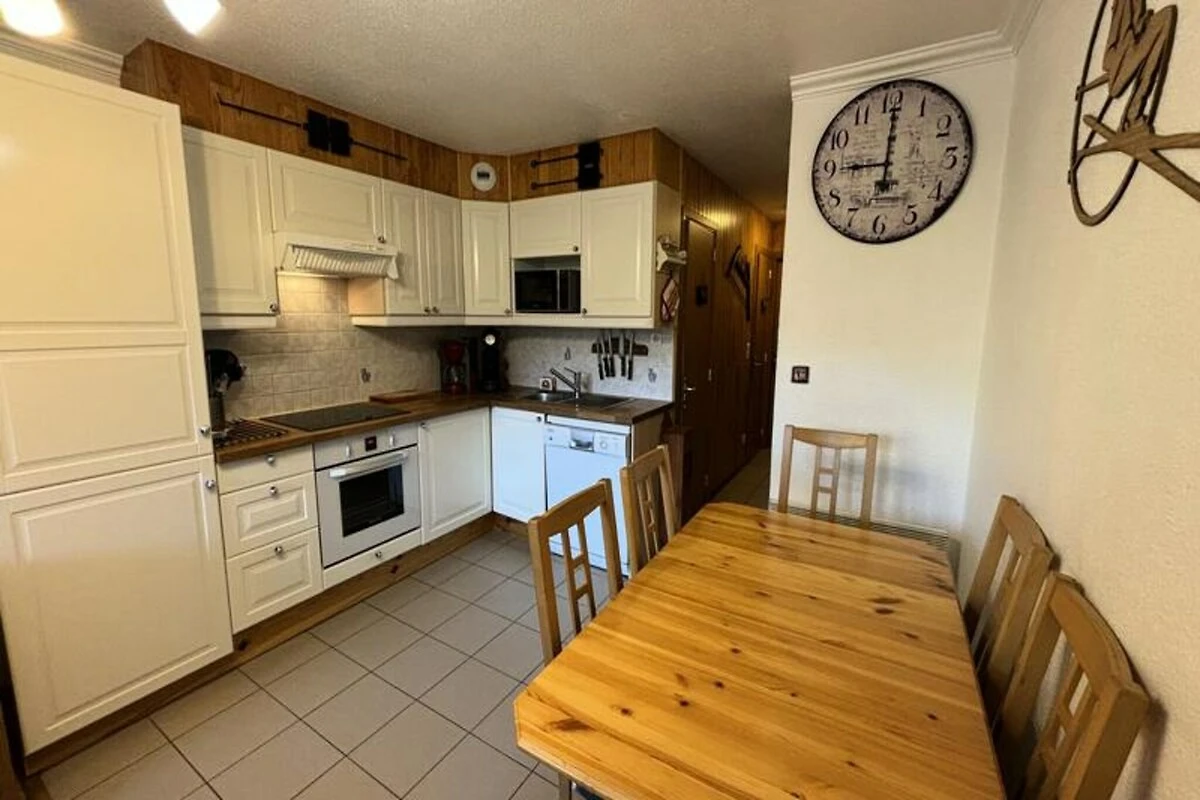 Im ruhigen Preyerand-Viertel von Les Menuires bietet dieses charmante Zwei-Zimmer-Apartment einen gemütlichen Rückzugsort in den Alpen mit direktem Zugang zu den Pisten. Stellen Sie sich vor: Sie treten aus Ihrer Unterkunft und fahren direkt mit den Skiern ins Herz der Trois Vallées, einem der größten Skigebiete der Welt. Dank des nach Süden ausgerichteten Balkons genießen Sie jeden Morgen einen atemberaubenden Bergblick und können den ganzen Tag die Sonne genießen – die perfekte Kulisse für Ihren Urlaub. Die Caron Residence ist komfortabel und durchdacht gestaltet und verfügt über mehrere Aufzüge sowie einen großen Parkplatz im Freien, sodass Sie von der Ankunft bis zur Abreise alles reibungslos erleben. \n\nDas Apartment bietet bequem Platz für bis zu fünf Gäste und ist somit ideal für Familien oder kleine Gruppen. Die offene Küche mit angrenzendem Wohnbereich, der durch eine Frühstücksbar abgetrennt ist, ist komplett mit modernen Geräten ausgestattet, darunter ein Cerankochfeld, ein Backofen, eine Mikrowelle, ein Kühlschrank und ein Geschirrspüler. Nach einem Tag auf der Piste können Sie im gemütlichen Wohnzimmer mit Schlafsofa und Fernseher entspannen oder sich für eine erholsame Nacht in das Schlafzimmer mit Etagenbetten zurückziehen. Das Badezimmer ist mit Badewanne und Waschmaschine ausgestattet, ein separates WC sorgt für zusätzlichen Komfort. Elektrische Rollläden und eine individuell regulierbare Heizung garantieren einen angenehmen Aufenthalt, und der Skischrank im Erdgeschoss bietet sicheren und griffbereiten Stauraum für Ihre Ausrüstung.\n\nDie Residenz Caron liegt ideal in der Nähe von Geschäften, Skiverleih und einer kostenlosen Gondelbahn, die Sie von morgens bis spät abends mit dem lebhaften Zentrum von Les Menuires verbindet. Ob Sie nun den Nervenkitzel des Skifahrens, den Charme des Alpendorfs oder einfach nur Entspannung und die atemberaubende Landschaft genießen möchten – dieses Apartment ist der ideale Ausgangspunkt. Mit optionalen Hotel-Services und zusätzlichen Annehmlichkeiten, die auf Anfrage verfügbar sind, verspricht Ihr Aufenthalt ebenso unkompliziert wie unvergesslich zu werden. Entdecken Sie die Magie der französischen Alpen und schaffen Sie unvergessliche Erinnerungen in diesem einladenden Bergrefugium.