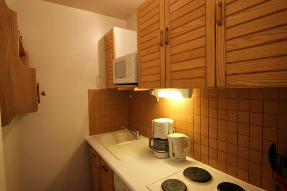 Hoch über dem pulsierenden Herzen von Val Thorens bietet die Residenz Les Trois Vallées einen gemütlichen Rückzugsort im begehrten Viertel Péclet. Stellen Sie sich vor, Sie erwachen mit der klaren Alpenluft und genießen den atemberaubenden Blick auf schneebedeckte Gipfel – und das nur wenige Schritte vom lebhaften Treiben des Ortes entfernt. Ob Sie aufregende Skiabenteuer oder eine erholsame Auszeit in den Bergen suchen, diese Residenz bringt Sie mitten hinein. Gegenüber erwartet Sie das Einkaufszentrum Péclet mit seinen zahlreichen lokalen Geschäften, einem Sherpa-Supermarkt, charmanten Bäckereien und lebhaften Restaurants – alles, was Sie brauchen, ist in unmittelbarer Nähe. \n\nDieses durchdacht gestaltete 42 m² große Studio-Apartment bietet bequem Platz für bis zu vier Gäste und ist somit ideal für Paare oder kleine Familien. Der nach Südosten ausgerichtete Wohnbereich ist lichtdurchflutet und schafft eine warme und einladende Atmosphäre. Die Küchenzeile ist mit Mikrowelle, Herd, Kühlschrank und Geschirrspüler ausgestattet und bietet alles, was Sie für die Zubereitung leckerer Mahlzeiten nach einem Tag auf der Piste benötigen. Entspannen Sie sich im Wohnzimmer mit Fernseher und einem ausziehbaren Schlafsofa, das sich in zwei Einzelbetten verwandeln lässt. Ein separates Doppelbett im Eingangsbereich sorgt für erholsame Nächte, während das Badezimmer mit Badewanne zum Entspannen einlädt. Nur 50 Meter von der Residenz entfernt finden Sie die Skiliftkasse und direkten Zugang zu den Pisten. So können Sie ganz einfach in das Weltklasse-Skigebiet von Val Thorens eintauchen. Skiverleihe befinden sich direkt gegenüber, sodass Sie im Handumdrehen startklar sind. Neben dem Skifahren können Sie die lebhafte Après-Ski-Szene erkunden, lokale Savoyer Spezialitäten genießen oder einfach den majestätischen Bergblick auf sich wirken lassen. Ob Sie Abenteuer oder Entspannung suchen – die Residenz Les Trois Vallées ist Ihr Tor zu unvergesslichen alpinen Erlebnissen im Herzen der Drei Täler.