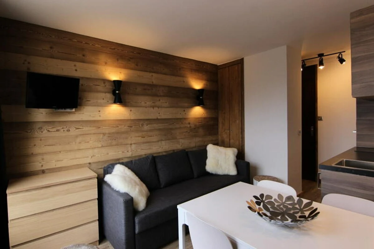 Hoch über den lebhaften Straßen von Val Thorens, im begehrten Viertel Péclet, bietet dieses moderne Apartment einen gemütlichen Rückzugsort im Herzen des weltberühmten Skigebiets Les Trois Vallées. Nur 50 Meter von den Pisten und der Skiliftkasse entfernt, beginnen Ihre alpinen Abenteuer direkt vor der Tür. Gegenüber dem Einkaufszentrum Péclet finden Sie alles, was Sie brauchen: von lokalen Geschäften und einem Sherpa-Supermarkt bis hin zu charmanten Restaurants, Bars und einer Bäckerei, die sich perfekt für einen kleinen Genuss am Morgen eignet. Die lebendige Atmosphäre von Val Thorens umgibt Sie und macht diesen Ort ideal zum Entspannen und Erkunden. \n\nDas 2019 komplett renovierte Apartment vereint modernen Komfort mit praktischen Annehmlichkeiten. Die 25 m² große Wohnung ist durchdacht gestaltet und bietet Platz für bis zu vier Gäste. Sie verfügt über eine Küchenzeile mit Backofen, Mikrowelle, Cerankochfeld, Kühlschrank und Geschirrspüler. Im Wohnzimmer laden Fernseher und ein gemütliches Schlafsofa zum Entspannen ein, während das Schlafzimmer mit einem einzigartigen Doppelstockbett für erholsame Nächte sorgt. Das elegante Badezimmer mit ebenerdiger Dusche, Waschbecken und WC bietet Komfort nach einem Tag auf der Piste. \n\nTritt vor die Tür und tauche ein in die lebendige Atmosphäre von Val Thorens. Ob du dir Skiausrüstung in den nahegelegenen Verleihgeschäften holst oder den Après-Ski in einem der Pubs genießt – alles ist bequem erreichbar. Abends kannst du durch die belebten Straßen des Ortes schlendern oder in einem der vielen Restaurants ein köstliches Essen genießen. \n\nDieses Apartment ist ideal für Skibegeisterte und alle, die einen abwechslungsreichen Bergurlaub suchen, und bietet die perfekte Kombination aus Komfort, Bequemlichkeit und Abenteuer. Schaffe unvergessliche Erinnerungen im Herzen der französischen Alpen, wo die Pisten und der Charme von Val Thorens auf dich warten.