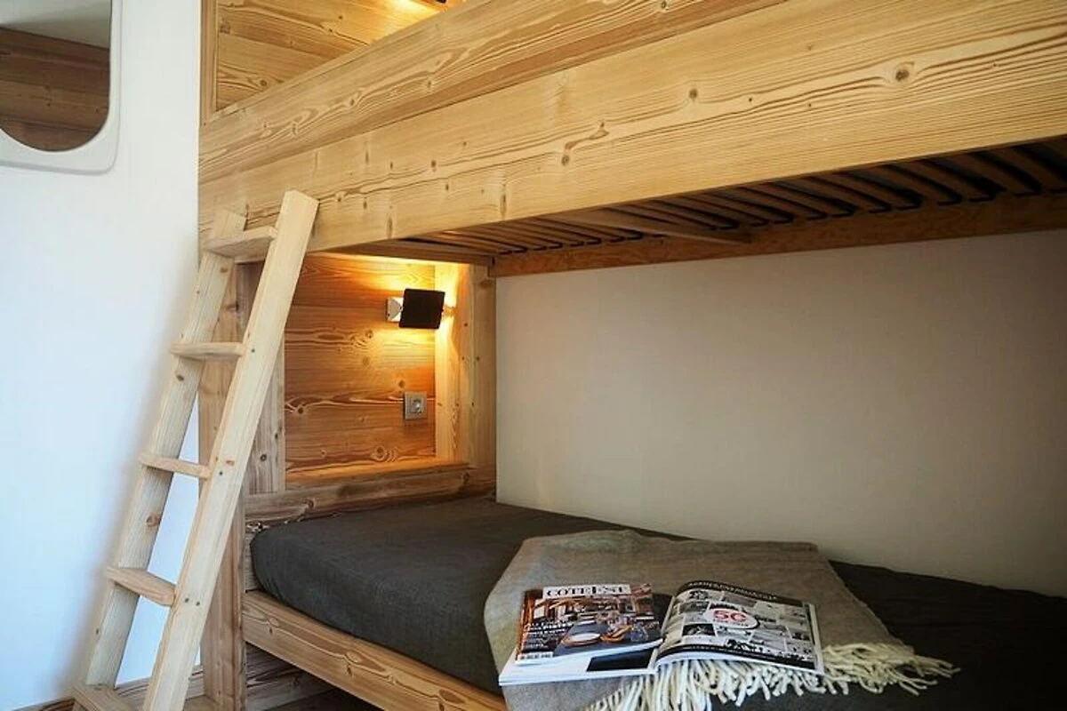 Hoch über dem beschaulichen Preyerand-Viertel bietet dieses stilvolle Maisonette-Apartment die perfekte Kombination aus modernem Komfort und alpinem Charme. Direkt an den Pisten gelegen, ist es ein Traum für Skibegeisterte: Mit der kostenlosen Preyerand-Seilbahn, die täglich von morgens bis spät abends verkehrt, gelangen Sie direkt ins lebhafte Viertel La Croisette. Schon beim Betreten des Apartments empfangen Sie warme Holztöne und ein Dekor im Vintage-Stil, die eine einladende, zugleich schicke und gemütliche Atmosphäre schaffen. Die nach Süden ausgerichteten Balkone im 8. Stock bieten einen atemberaubenden Blick auf die majestätische Masse-Bergkette und machen jeden Moment hier unvergesslich. Das 80 m² große, 2018 komplett renovierte Apartment bietet bequem Platz für bis zu 8 Gäste. Im Erdgeschoss befinden sich ein Schlafzimmer mit Doppelbett, eine voll ausgestattete Küche mit modernen Geräten und ein elegantes Badezimmer mit ebenerdiger Dusche. Im Obergeschoss dient das Wohnzimmer mit zwei Einzelbetten und einem Etagenbett auch als Schlafbereich. Hier befinden sich außerdem ein weiteres Schlafzimmer mit Doppelbett und ein zweites Badezimmer. Mit WLAN, Fernseher und durchdachten Details wie Baumwollbettwäsche im Winter garantiert dieses Nichtraucher-Refugium einen unbeschwerten Aufenthalt.