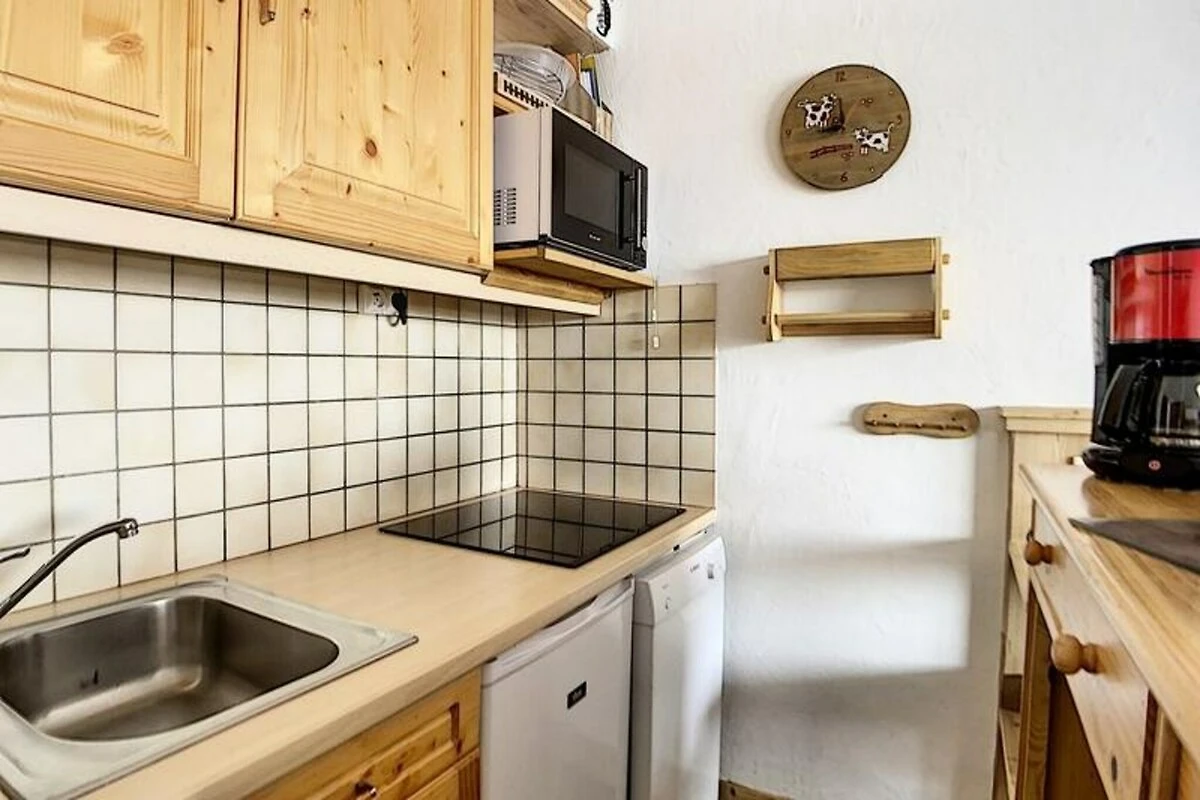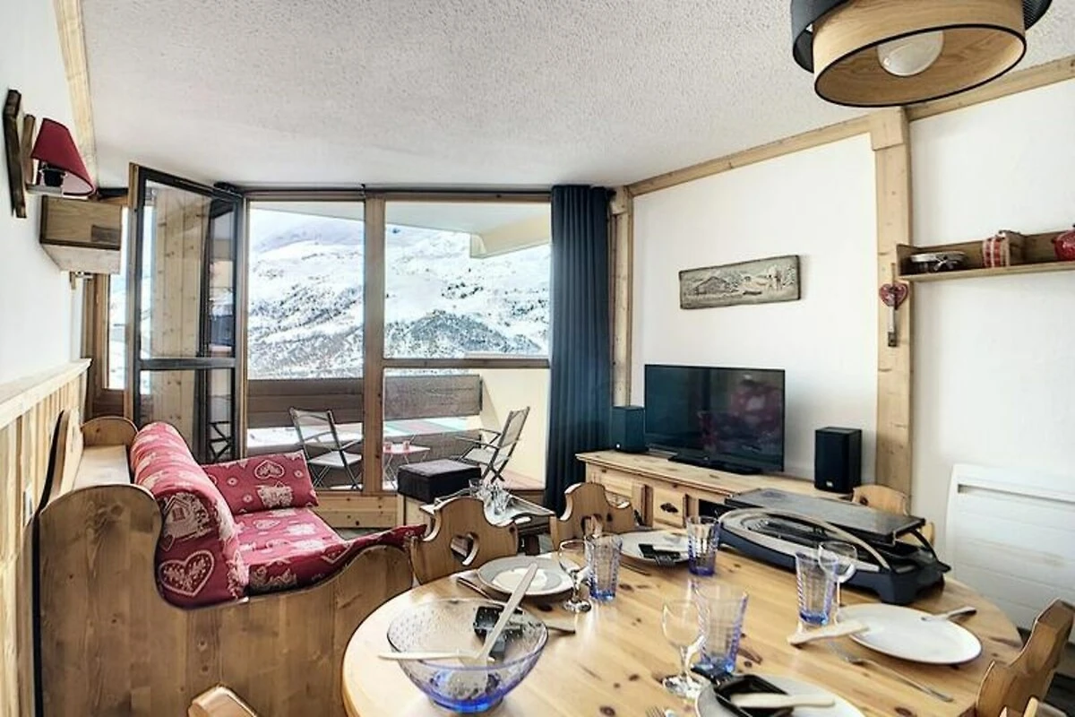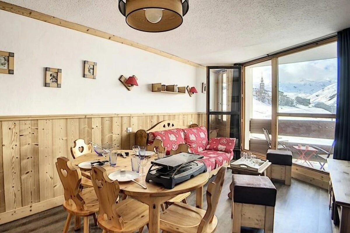 Im charmanten Viertel Preyerand in Les Menuires bietet dieses wunderschön renovierte Zweizimmer-Apartment einen gemütlichen Rückzugsort direkt an der Piste. Dank der kostenlosen Seilbahn TéléPreyerand, die täglich von 8:00 bis 23:00 Uhr verkehrt, erreichen Sie das Zentrum von La Croisette schnell und bequem. Ob Sie nun die Pisten hinunterwedeln oder einfach nur die alpine Atmosphäre genießen möchten – diese Unterkunft verspricht einen unvergesslichen Bergurlaub. \n\nDas 40 m² große Apartment befindet sich im 4. Stock und ist bequem mit dem Aufzug erreichbar. Es bietet Platz für bis zu sechs Gäste. Der nach Süden ausgerichtete Balkon lädt zum Sonnenbaden ein und bietet einen atemberaubenden Blick auf die umliegenden Gipfel. Im Wohnzimmer finden Sie ein Schlafsofa für zwei Personen, einen Fernseher und einen DVD-Player – der perfekte Ort zum Entspannen nach einem Tag auf der Piste. Das Schlafzimmer ist mit einem Doppelbett und zwei Etagenbetten ausgestattet und somit ideal für Familien oder Gruppen. Das moderne Badezimmer ist mit Badewanne, Handtuchwärmer und Waschmaschine ausgestattet, während das separate WC zusätzlichen Komfort bietet.\n\nDie voll ausgestattete Küche lässt keine Wünsche offen und bietet Induktionskochfeld, Kühlschrank, Geschirrspüler, Raclette-Grill, Fondue-Set, Steingrill, Kombi-Backofen/Mikrowelle und eine Nespresso-Maschine. Dank Fliesen- und Linoleumböden ist das Apartment stilvoll und praktisch zugleich. Internet ist inklusive, sodass Sie während Ihres gesamten Aufenthalts in Verbindung bleiben können. Bitte beachten Sie, dass das Apartment rauchfrei und haustierfrei ist und mit Bettdecken für einen erholsamen Schlaf ausgestattet ist.\n\nAbseits des Apartments bietet Les Menuires eine Fülle an Aktivitäten und Annehmlichkeiten. Vom lebhaften Viertel La Croisette mit seinen Geschäften, Restaurants und Après-Ski-Angeboten bis hin zu den atemberaubenden Skipisten der Trois Vallées – hier ist für jeden etwas dabei. Ob Sie zum Skifahren, Wandern oder einfach nur zum Entspannen kommen möchten, dieses Apartment ist Ihr Tor zu den schönsten Seiten der französischen Alpen.