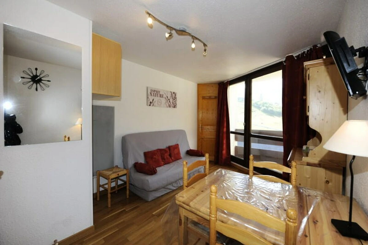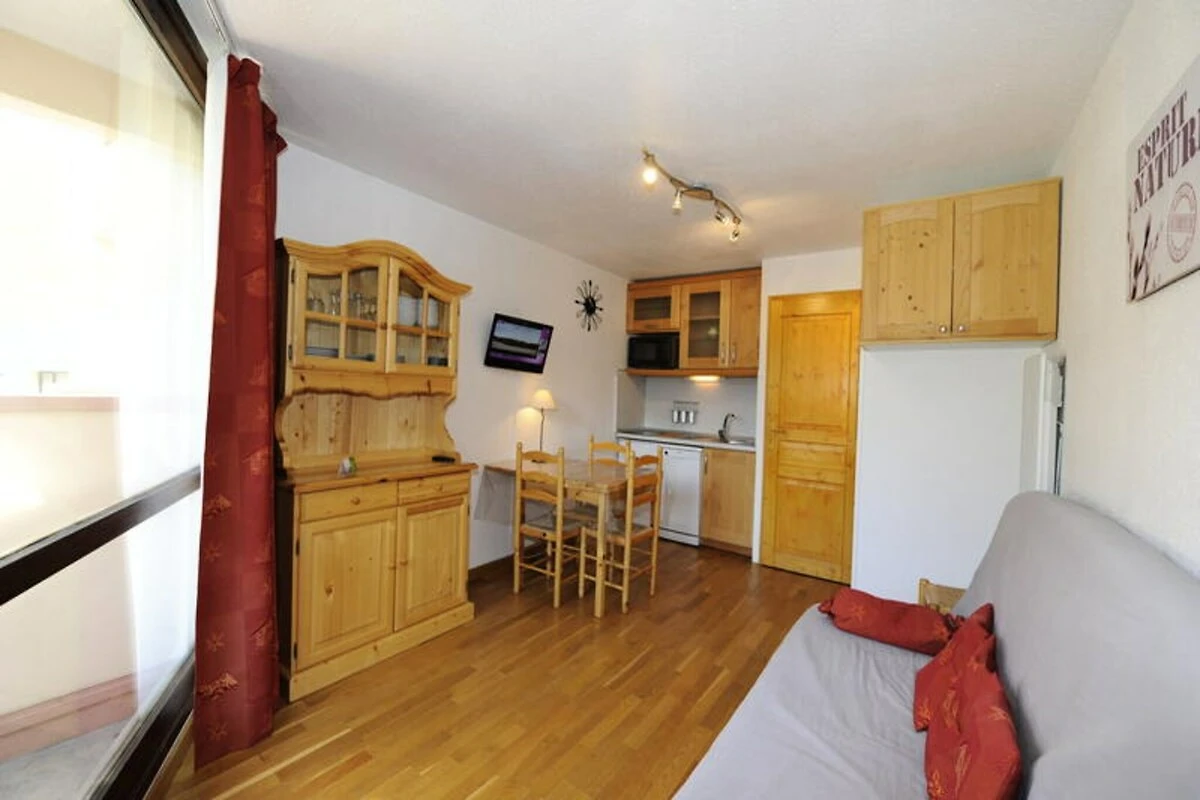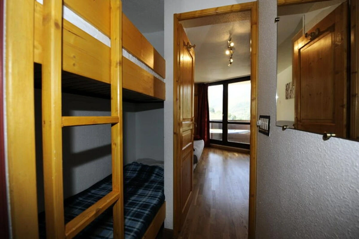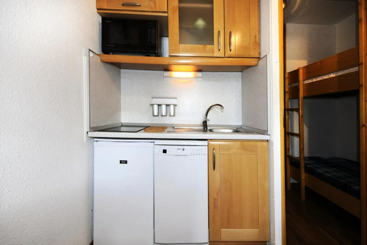 Hoch über dem lebhaften Viertel Preyerand lädt dieses charmante Studio-Apartment Sie ein, die Magie der französischen Alpen mit direktem Zugang zu den Pisten zu erleben. Genießen Sie von Ihrem Südbalkon die frische Bergluft und die atemberaubende Aussicht, während Sie Ihre alpinen Abenteuer planen. Die Residenz Grande Masse bietet dank der kostenlosen Seilbahn TéléPreyerand, die täglich von morgens bis spät abends verkehrt, eine nahtlose Anbindung an das Zentrum von La Croisette und garantiert so Komfort und Barrierefreiheit während Ihres gesamten Aufenthalts. Ob Sie zum Skifahren, Wandern oder einfach nur zum Entspannen hier sind – dieses gemütliche Refugium ist Ihr Tor zur Schönheit von Les Menuires. Das 20 m² große Studio ist für bis zu drei Gäste ausgelegt und bietet eine praktische Aufteilung mit einem Schlafsofa für zwei Personen im Wohnbereich und einer separaten Bergecke mit zwei Etagenbetten. Die gut ausgestattete Küche verfügt über moderne Annehmlichkeiten wie Mikrowelle mit Grillfunktion, Geschirrspüler, Kühlschrank und Kaffeemaschine, sodass Sie nach einem Tag auf der Piste problemlos herzhafte Mahlzeiten zubereiten können. Das Badezimmer bietet eine Badewanne und einen Handtuchwärmer für zusätzlichen Komfort, während der Wohnbereich mit einem Fernseher für entspannte Abende ausgestattet ist. Bitte beachten Sie, dass das obere Bett nicht für Kinder unter sechs Jahren geeignet ist. \n\nTreten Sie hinaus und befinden Sie sich direkt am Fuße der Pisten, bereit, das weitläufige Skigebiet Les Menuires zu erkunden. Das nahegelegene Viertel La Croisette bietet eine Vielzahl an Geschäften, Restaurants und Après-Ski-Aktivitäten, sodass Sie alles Notwendige in unmittelbarer Nähe haben. Im Sommer verwandelt sich die Region in ein Paradies für Wanderer und Naturliebhaber mit atemberaubenden Wanderwegen und Panoramablicken. \n\nOb Sie aufregende Wintersportarten oder eine ruhige Sommerauszeit suchen, dieses Studio in Grande Masse verspricht ein unvergessliches alpines Erlebnis, das Komfort, Bequemlichkeit und den zeitlosen Charme der französischen Berge vereint.