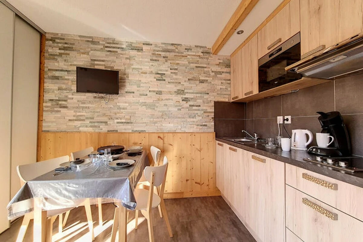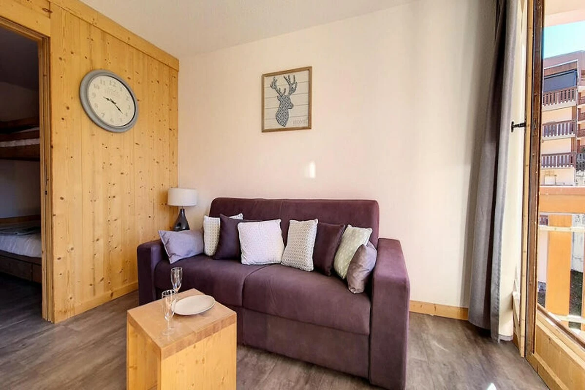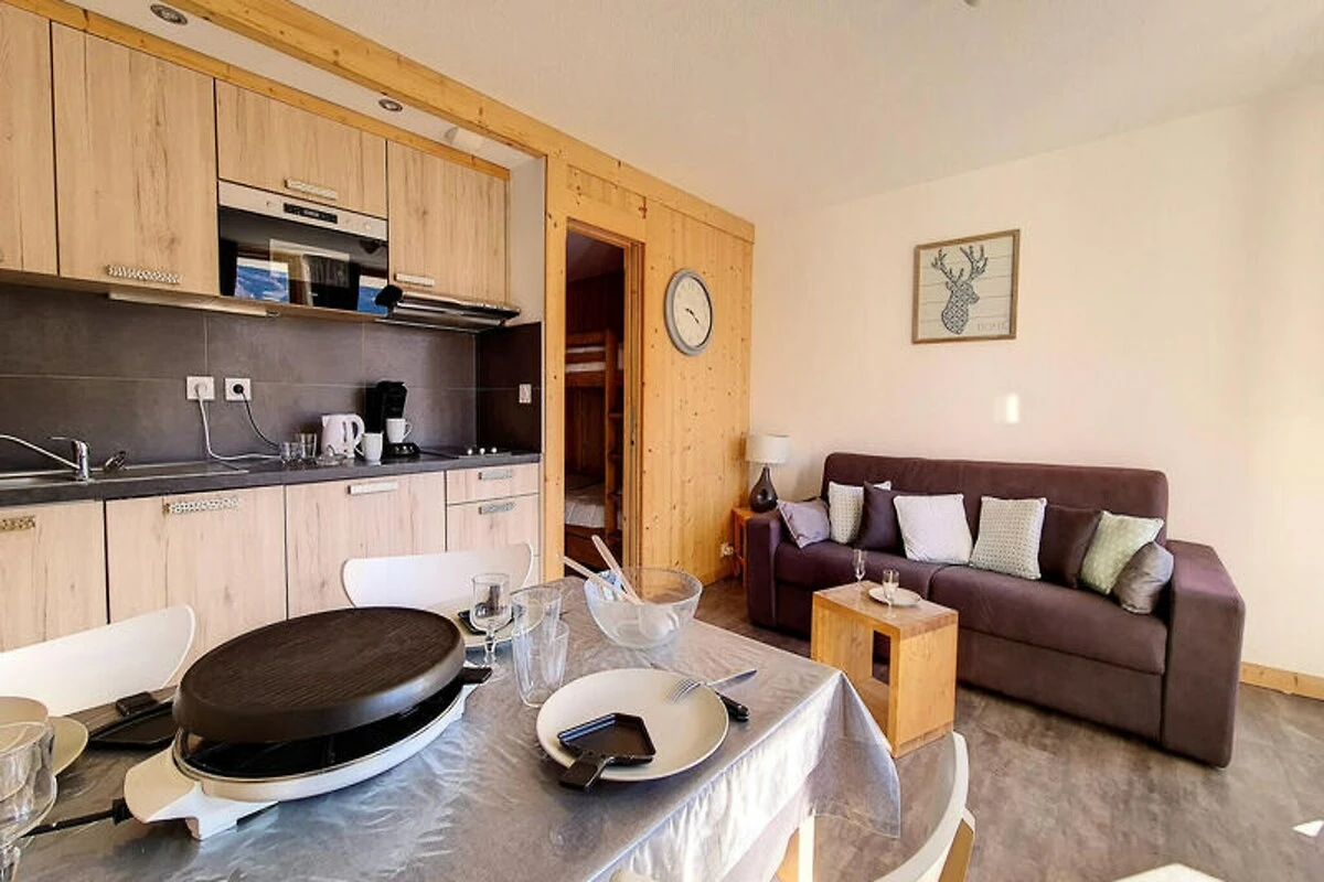 Über dem lebhaften Viertel Bruyères bietet dieses stilvolle Studio-Apartment einen gemütlichen Rückzugsort für bis zu vier Gäste und vereint modernen Komfort mit alpinem Charme. Im 7. Stock gelegen, eröffnet der nach Süden ausgerichtete Balkon einen atemberaubenden Blick auf die Pisten und lädt zum Genießen der Bergidylle ein, während Sie gleichzeitig nur wenige Schritte vom pulsierenden Zentrum des Viertels entfernt sind. Ob Sie zum Skifahren oder für einen Sommerurlaub hier sind, diese Unterkunft verspricht einen unvergesslichen Aufenthalt. Das Apartment wurde wunderschön renoviert und verfügt über eine intelligente Raumaufteilung, die auf Entspannung und Komfort ausgelegt ist. Das Wohnzimmer ist mit einem bequemen Doppelschlafsofa und einem Flachbildfernseher ausgestattet – perfekt zum Entspannen nach einem Tag im Freien. Eine separate Schlafnische, geschickt hinter einer Schiebetür verborgen, bietet zwei Einzelbetten (Etagenbetten) und damit Privatsphäre und Komfort für Familien oder kleine Gruppen. Die Küche ist komplett mit modernen Geräten ausgestattet, darunter eine Senseo-Kaffeemaschine, eine Mikrowelle mit Grillfunktion und ein Geschirrspüler, sodass die Zubereitung von Mahlzeiten zum Kinderspiel wird. Das Badezimmer ist elegant und funktional mit Dusche und WC ausgestattet. Laminatboden verleiht dem Raum eine elegante Note. Treten Sie vor die Tür und Sie befinden sich im lebhaften Viertel Bruyères mit seinen vielfältigen Restaurants, Geschäften und Unterhaltungsmöglichkeiten. Von der Skischule und Rodelbahn bis zum Wasserpark und Wellnesscenter – alles, was Sie brauchen, ist bequem zu Fuß erreichbar. Familien freuen sich über den Kinderspielplatz, während Kinofans einen gemütlichen Abend im örtlichen Kino genießen können. Abenteuerlustige finden die Pisten direkt vor der Tür und haben somit direkten Zugang zu erstklassigen Skigebieten. Ob Sie nun der Nervenkitzel der Piste oder der Charme des Alpendorfs lockt – dieses Studio ist Ihr Tor zu einem unvergesslichen Bergurlaub. Dank seiner erstklassigen Lage, der durchdachten Ausstattung und der atemberaubenden Aussicht ist es die perfekte Wahl für Paare, Familien oder Freunde, die die Magie der französischen Alpen erleben möchten.