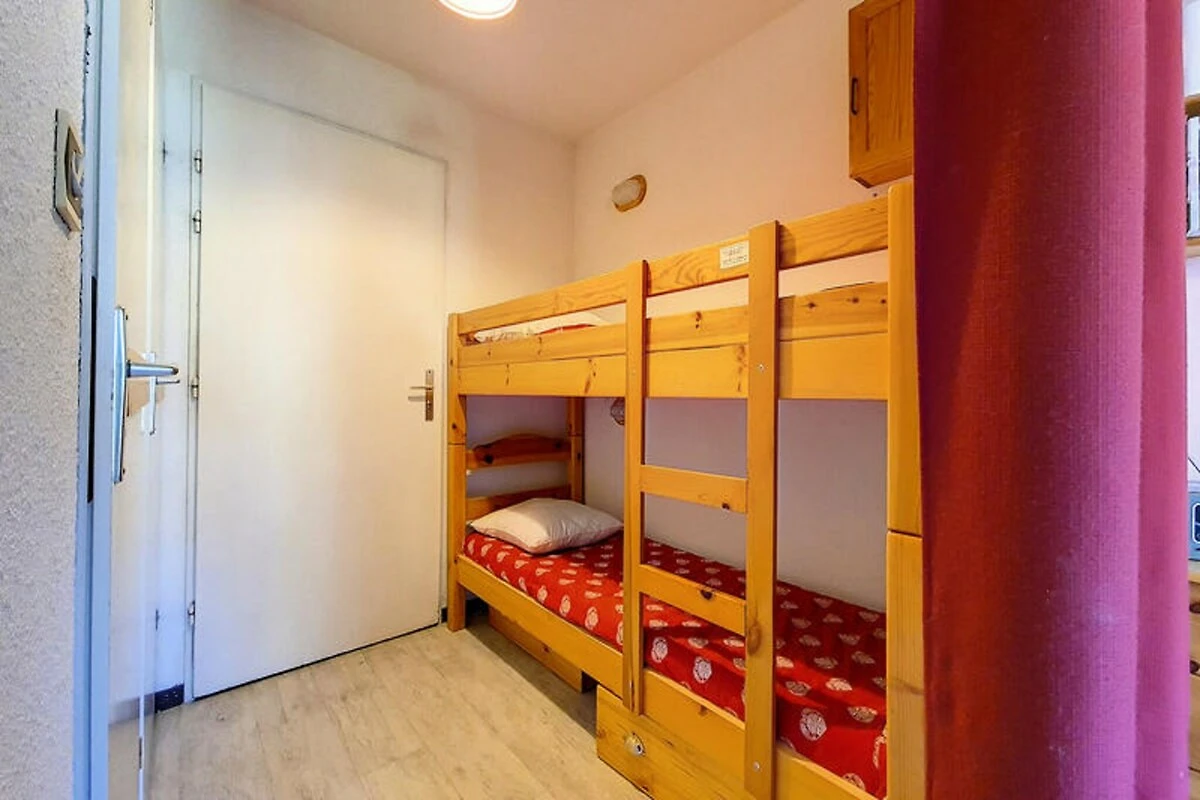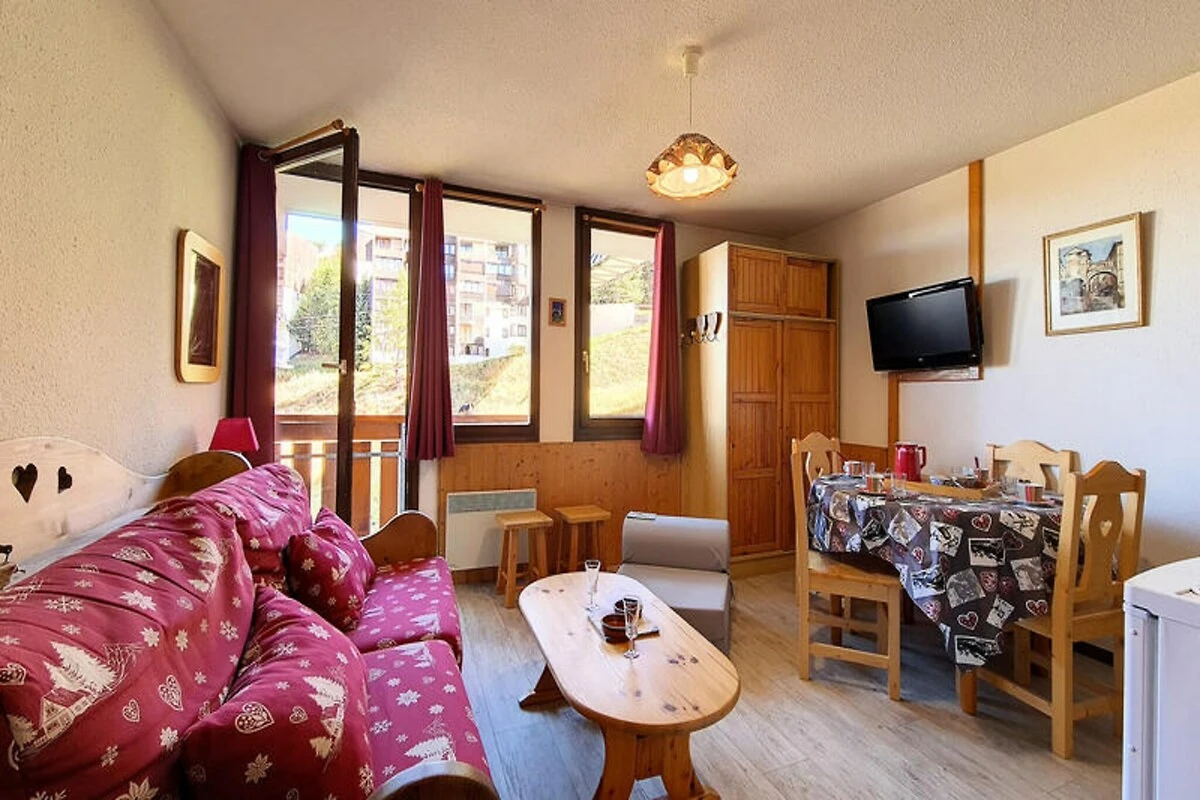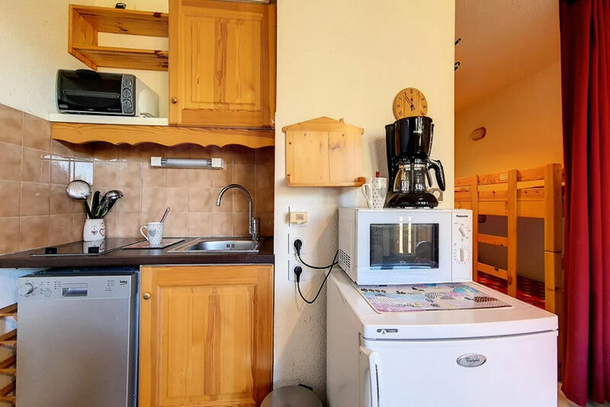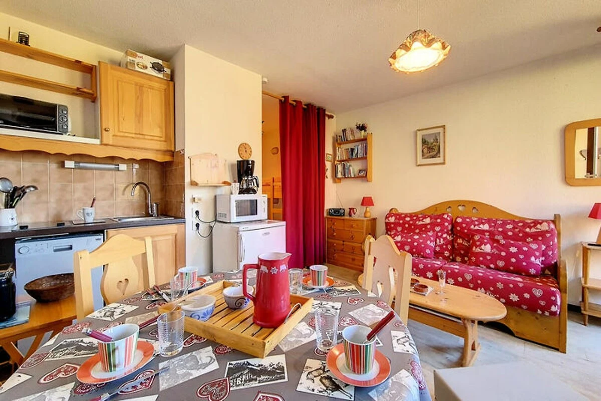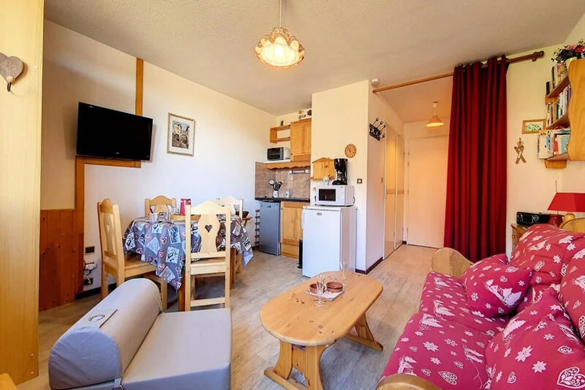 Hoch oben im Herzen der französischen Alpen, wo schneebedeckte Gipfel auf den Charme von Bergdörfern treffen, bietet dieses gemütliche Studio-Apartment in der Ski Soleil Residence einen einladenden Rückzugsort für Ihre Bergabenteuer. Die Residence liegt im Bezirk Bruyères, direkt am Fuße der Pisten, sodass Sie sowohl Wintersport als auch Sommerwanderungen mühelos genießen können. Stellen Sie sich vor, wie Sie morgens auf Ihrem nach Norden ausgerichteten Balkon Ihren Kaffee trinken und den Blick über die friedliche Alpenlandschaft schweifen lassen. Ob Sie nun aufregende Abfahrten oder erholsame Auszeiten in den Bergen suchen – diese Unterkunft verspricht einen unvergesslichen Aufenthalt. \n\nDas 23 m² große Studio ist durchdacht gestaltet und bietet Platz für bis zu vier Gäste. Das Wohnzimmer verfügt über ein bequemes Doppelschlafsofa, während eine Schlafnische mit zwei Einzelbetten zusätzlichen Platz bietet. Eine gut ausgestattete Küche mit Cerankochfeld, Minibackofen, Mikrowelle, Geschirrspüler und vielem mehr lädt zum Kochen und Genießen ein. Das Badezimmer ist mit einer entspannenden Badewanne ausgestattet, und ein separates WC sorgt für zusätzlichen Komfort. Mit Laminatboden, Fernseher, DVD-Player und kostenpflichtigem WLAN wurde an jedes Detail gedacht, um Komfort und Funktionalität zu gewährleisten. Bitte beachten Sie, dass Haustiere nicht erlaubt sind und die Etagenbetten für Kinder unter sechs Jahren ungeeignet sind. \n\nEntdecken Sie das lebendige Viertel Bruyères mit seinen zahlreichen Annehmlichkeiten für einen gelungenen Aufenthalt. Von Restaurants und Geschäften bis hin zu Kino und Wellnesscenter – alles, was Sie brauchen, ist nur wenige Schritte entfernt. Familien freuen sich über die Skischule, die Rodelbahn und den Kinderspielplatz, während Abenteurer die Pisten und Wanderwege direkt vor der Tür erkunden können. Ob Sie alpine Abenteuer oder erholsame Ruhe suchen – dieses Studio ist der perfekte Ausgangspunkt für Ihren Urlaub in den französischen Bergen.