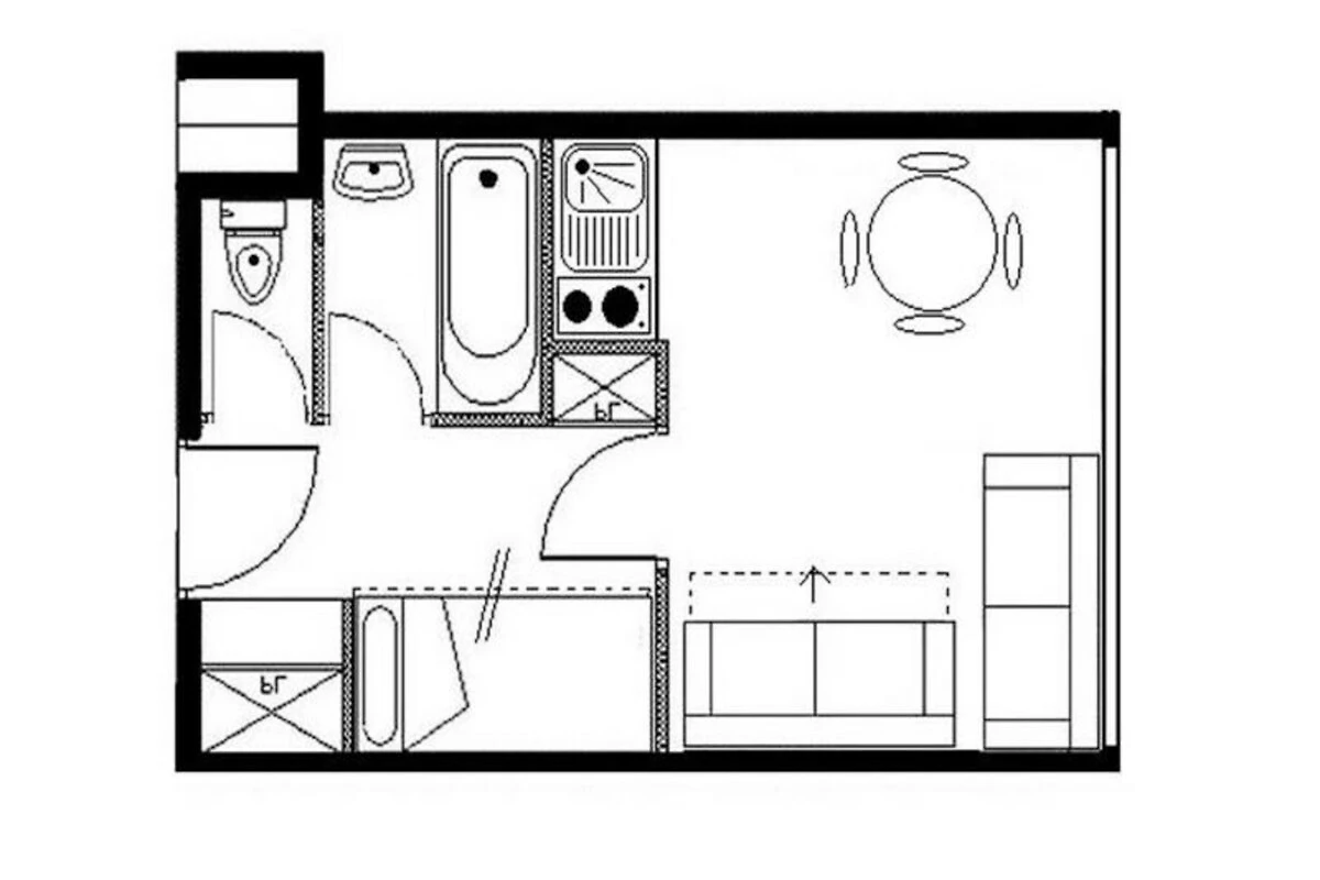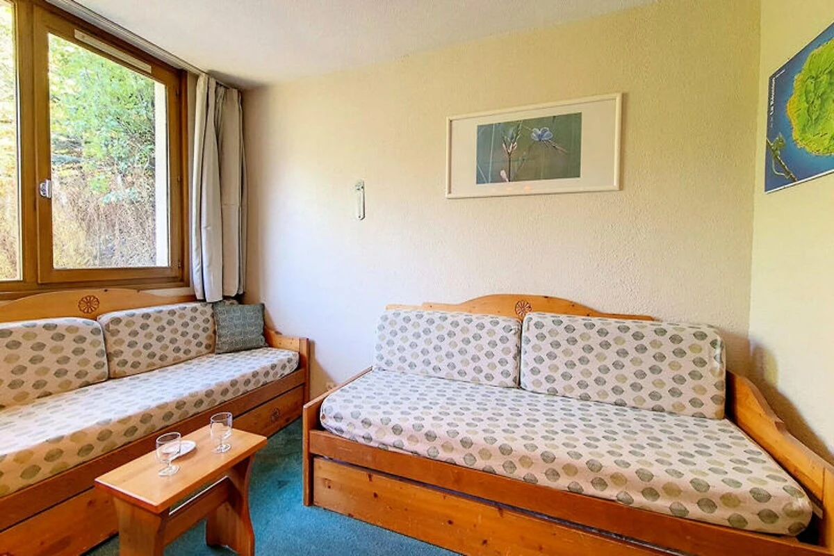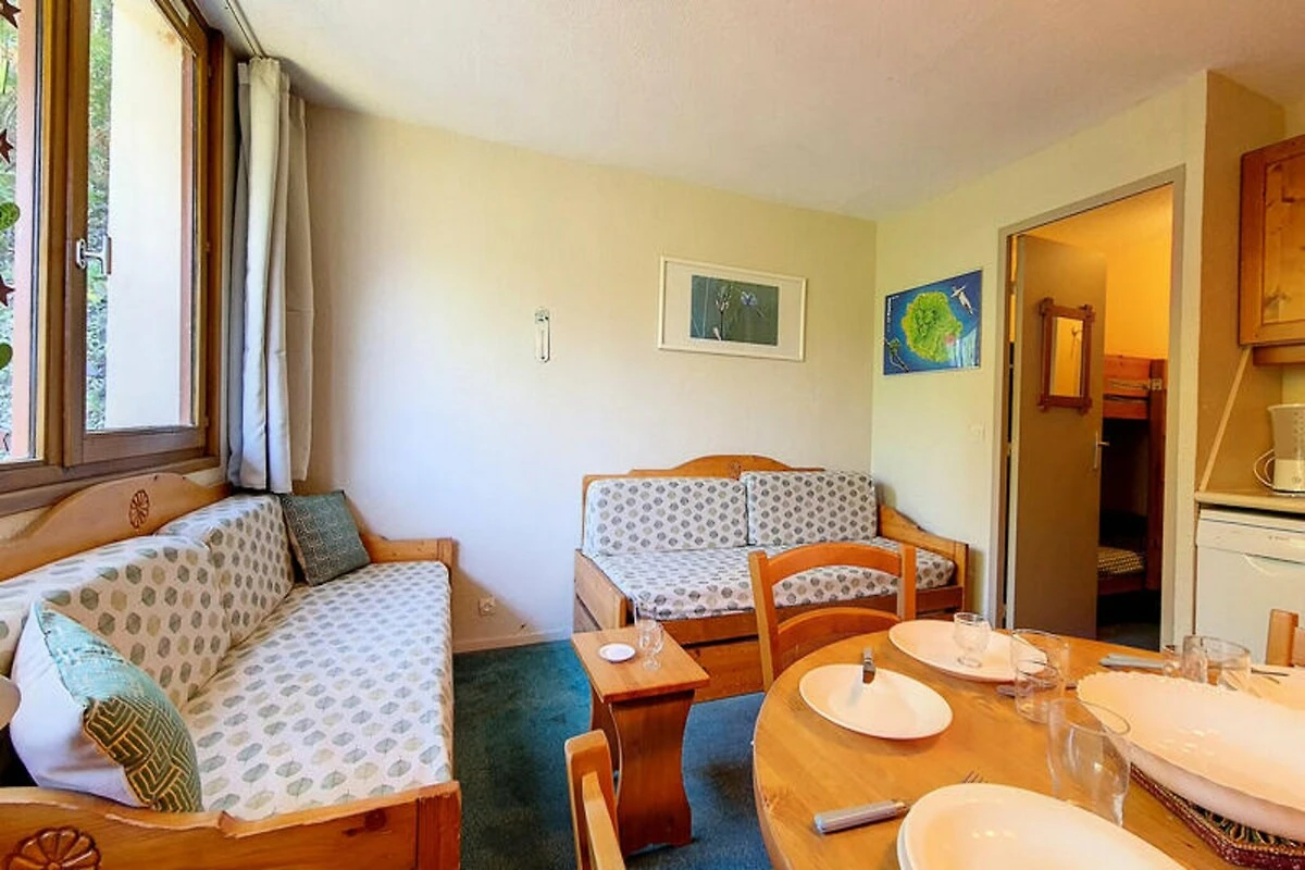 Das kompakte, aber gut ausgestattete 22 m² große Studio bietet bequem Platz für bis zu vier Gäste. Das Wohnzimmer verfügt über ein Schlafsofa und ein Ausziehbett, während eine separate Schlafnische mit zwei Etagenbetten ausgestattet ist und sich somit ideal für Familien oder kleine Gruppen eignet. Die durchdacht gestaltete Küche bietet moderne Annehmlichkeiten wie Elektroherd, Minibackofen, Mikrowelle, Kühlschrank, Geschirrspüler, Kaffeemaschine und Toaster, sodass Sie sich nach einem Tag auf der Piste leckere Mahlzeiten zubereiten können. Das Apartment verfügt außerdem über ein Badezimmer mit Badewanne, ein separates WC und einen Fernseher. Bitte beachten Sie, dass das obere Bett nicht für Kinder unter sechs Jahren geeignet ist.