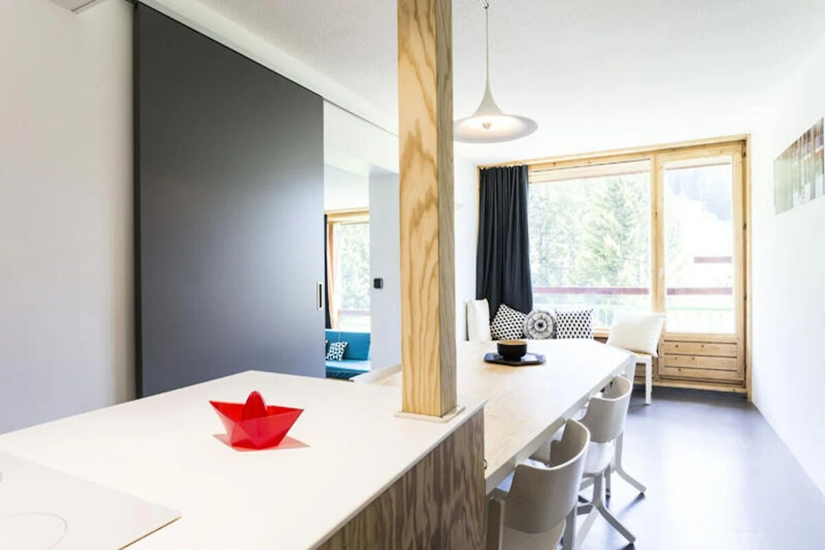 Hoch über dem geschäftigen Einkaufszentrum Charvet bietet dieses renovierte Alpenapartment eine einzigartige Kombination aus Komfort und Bequemlichkeit für Ihren nächsten Bergurlaub. Dank des direkten Zugangs zur Piste (Ski-in/Ski-out) direkt vor der Tür sind Sie bestens positioniert, um die Pisten von Les Arcs 1800 zu erkunden. Ob Sie von den nach Süden ausgerichteten Balkonen den Blick über die schneebedeckten Pisten schweifen lassen oder den majestätischen Mont Blanc von der Nordostseite aus bewundern – jeder Moment hier ist von atemberaubender alpiner Schönheit umrahmt. Dies ist der ideale Rückzugsort für alle, die Abenteuer und Entspannung im Herzen der französischen Alpen suchen. \n\nDas 54 m² große Apartment ist durchdacht gestaltet und bietet Platz für bis zu sieben Gäste. Das Wohnzimmer verfügt über zwei gemütliche Schlafsofas und einen Fernseher und lädt zum Entspannen nach einem Tag auf der Piste ein. Zwei Schlafzimmer im Hüttenstil bieten flexible Schlafmöglichkeiten: ein Doppelbett, ein Einzelbett und Etagenbetten (nicht geeignet für Kinder unter sechs Jahren). Die voll ausgestattete Küche bietet moderne Geräte wie Backofen, Mikrowelle, Kühlschrank, Induktionskochfeld, Geschirrspüler, Wasserkocher, Kaffeemaschine und Toaster – alles, was Sie für die Zubereitung leckerer Mahlzeiten benötigen. Zwei Badezimmer, eines davon mit Dusche, sorgen für Komfort, insbesondere für größere Gruppen. \n\nIn der Umgebung des Apartments finden Sie zahlreiche Annehmlichkeiten und Attraktionen. Das Einkaufszentrum Charvet mit seinen Geschäften und Restaurants ist nur wenige Schritte entfernt, und der Kinderclub ESF Skimômes bietet Unterhaltung für die kleinen Gäste. Überdachte und offene Parkplätze stehen in der Nähe zur Verfügung, und die Shuttle-Haltestelle zwischen den Skigebieten ermöglicht Ihnen eine bequeme Erkundung der Umgebung. Im Winter locken die Pisten, und im Sommer verwandeln sich die Berge in ein Paradies für Wanderer und Naturliebhaber. \n\nOb Sie nun im Tiefschnee Ihre Spuren ziehen oder die ruhige Alpenatmosphäre genießen möchten – diese Unterkunft verspricht einen unvergesslichen Aufenthalt. Mit umweltfreundlicher Bettwäsche, kostenlosem WLAN im Resort und atemberaubender Aussicht ist sie der perfekte Ausgangspunkt für Ihre Abenteuer in Les Arcs.