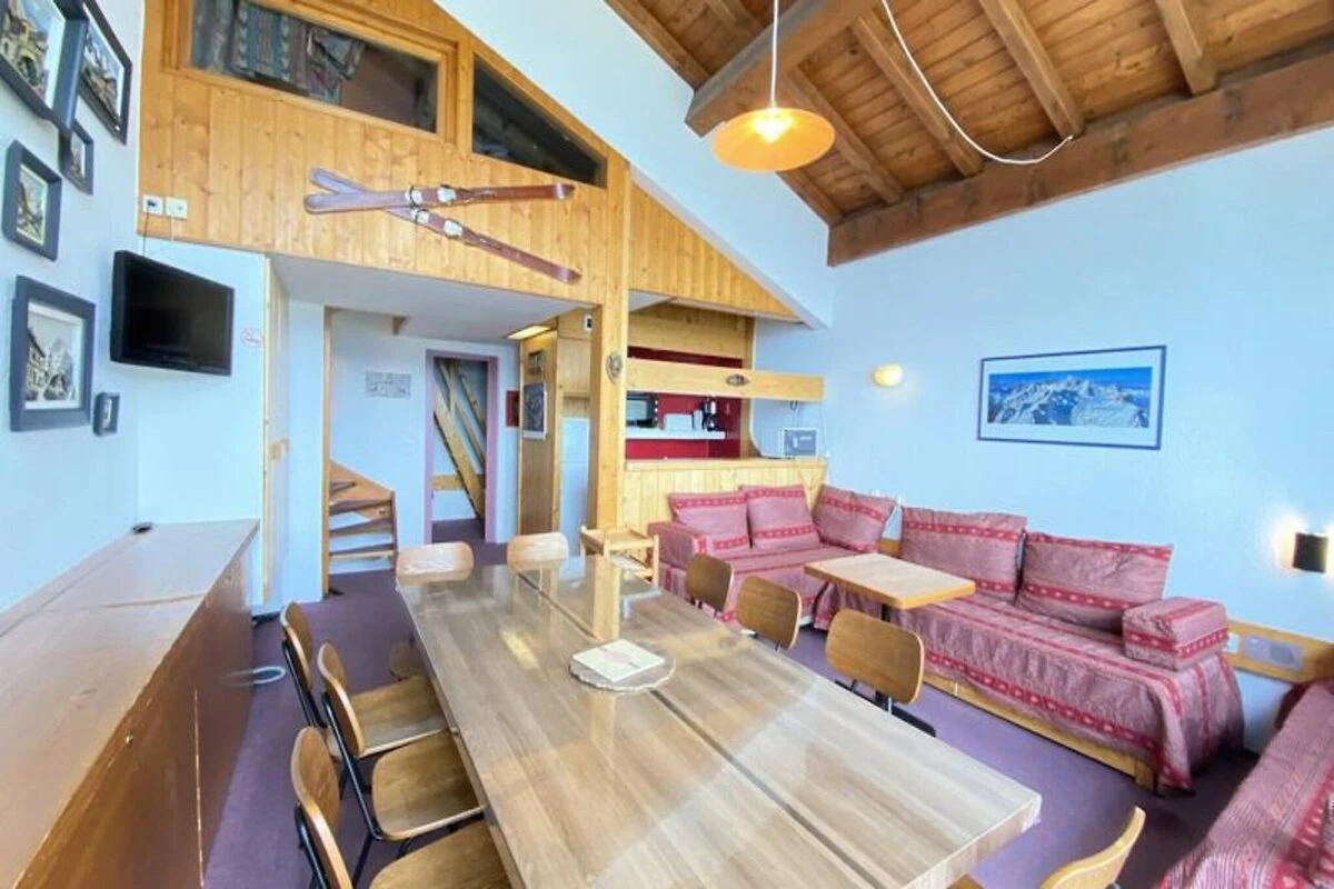 Hoch über dem charmanten Village des Villards in Les Arcs 1800 bietet dieses geräumige Alpenrefugium die perfekte Kombination aus Komfort und Bequemlichkeit für Ihren Bergurlaub. Dank der beneidenswerten Lage direkt an den Pisten gelangen Sie von hier aus direkt auf die Skipisten – ideal für Wintersportler und Naturliebhaber gleichermaßen. Ob Sie den Sonnenaufgang über den Hängen bewundern oder einen goldenen Sonnenuntergang von Ihrem Westbalkon genießen – jeder Moment hier ist von alpiner Schönheit durchdrungen. \n\nDas beeindruckende 90 m² große Duplex-Apartment bietet Platz für bis zu 10 Gäste und ist somit perfekt für Familien oder Freundesgruppen. Die durchdachte Raumaufteilung umfasst drei gemütliche Schlafzimmer, eine Schlafnische und eine Galerie, sodass jeder seinen eigenen Rückzugsort zum Entspannen hat. Die voll ausgestattete Küche mit Geschirrspüler, Mikrowelle und Kaffeemaschine lädt dazu ein, nach einem Tag auf der Piste leckere Mahlzeiten zuzubereiten. Moderne Annehmlichkeiten wie kostenloses WLAN, ein Flachbildfernseher und zwei Badezimmer sorgen für einen komfortablen und entspannten Aufenthalt. Die Residenz liegt oberhalb des Einkaufszentrums Village des Villards und bietet bequemen Zugang zu Geschäften, Restaurants und Après-Ski-Angeboten. Die Haltestelle des Shuttlebusses zwischen den Skigebieten ist nur wenige Schritte entfernt, sodass Sie das gesamte Paradiski-Gebiet bequem erkunden können. Im Sommer verwandelt sich die Region in ein Paradies für Wanderer und Mountainbiker mit Wegen, die zu atemberaubenden Aussichten und Almwiesen führen. Ob Sie nun im Tiefschnee die Pisten hinunterziehen oder die Ruhe der Berge genießen möchten – diese Residenz verspricht einen unvergesslichen Alpenurlaub. Mit ihrer unschlagbaren Lage, dem großzügigen Platzangebot und dem gemütlichen Ambiente ist sie der perfekte Ausgangspunkt, um unvergessliche Erinnerungen im Herzen der französischen Alpen zu schaffen.