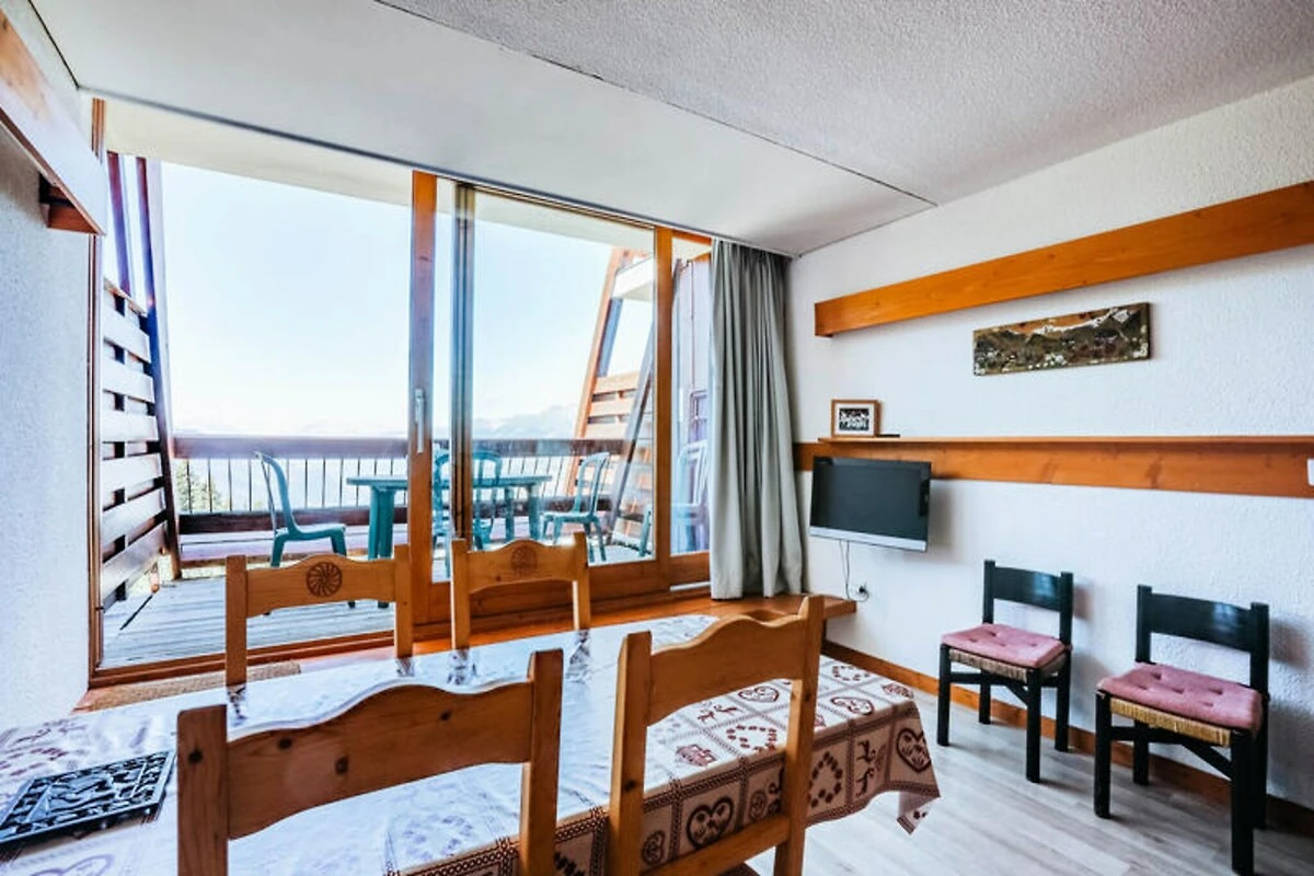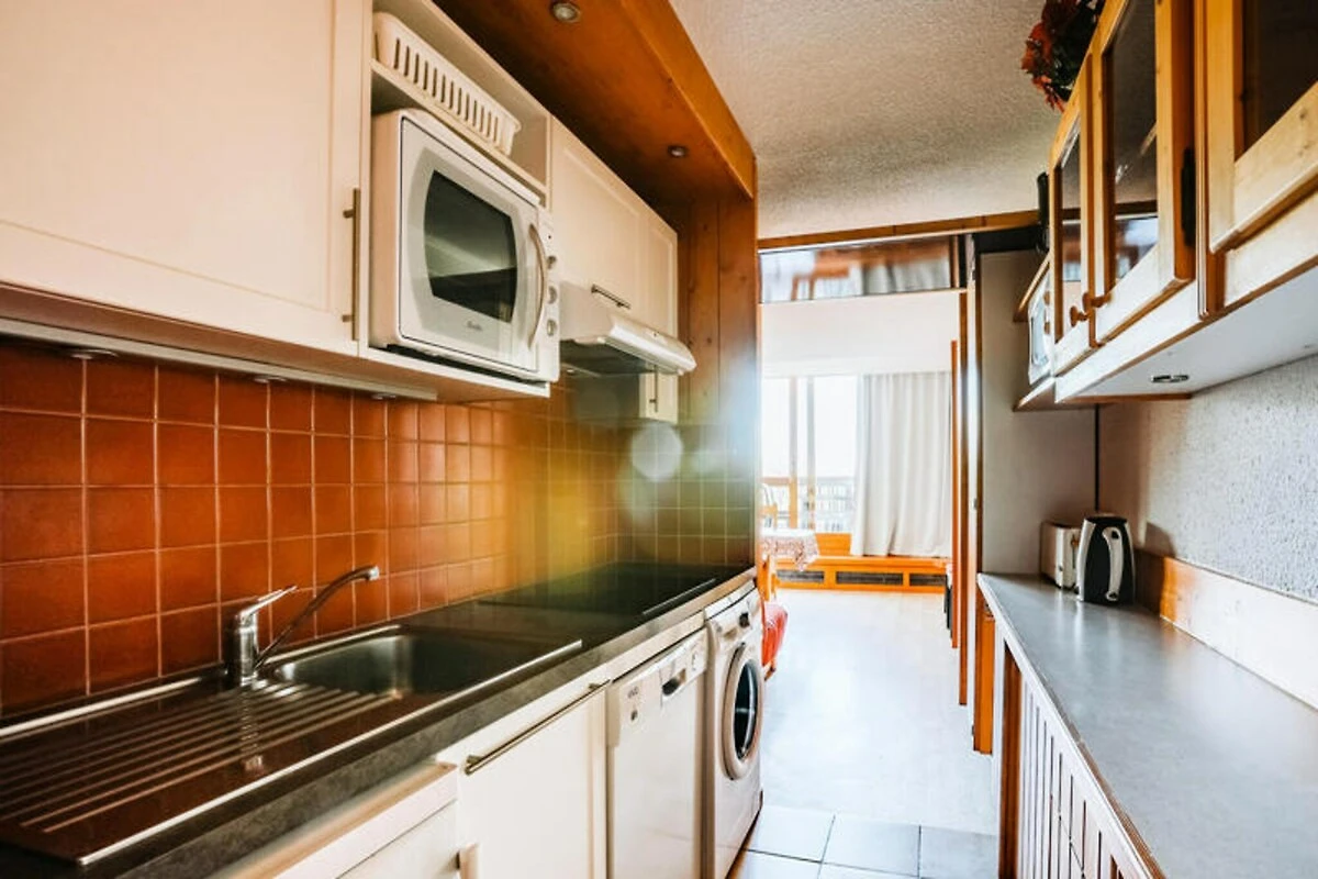 Hoch über dem Tarentaise-Tal bietet dieses charmante Studio in Arc 1600 einen ruhigen Rückzugsort in den Alpen mit atemberaubendem Blick auf die umliegenden Berge und das Tal. Die Residenz, erbaut im ikonischen Stil von Arc 1600, liegt ideal in einer friedlichen Gegend, nur 150 Meter von den Pisten und nur 5 Gehminuten vom lebhaften Ortszentrum entfernt. Ob Sie einen Winterurlaub zum Skifahren oder eine Sommerauszeit planen – diese Unterkunft befindet sich mitten im Herzen der französischen Alpen und bietet vielfältige Outdoor-Aktivitäten. Das 37 m² große Studio ist durchdacht gestaltet und bietet Platz für bis zu fünf Gäste. Das Wohnzimmer verfügt über ein bequemes Schlafsofa für zwei Personen, während der Schlafbereich mit Etagenbetten ausgestattet ist – ideal für Familien oder kleine Gruppen. Der nach Südwesten ausgerichtete Balkon lädt zum Entspannen ein und bietet einen herrlichen Blick auf das Tal und die Berge – die perfekte Kulisse für Ihren Morgenkaffee oder zum abendlichen Ausklang. Die Küche ist komplett mit modernen Geräten ausgestattet, darunter ein Induktionskochfeld, ein Backofen, eine Mikrowelle, ein Geschirrspüler und ein Kühlschrank, sodass Sie alles für einen komfortablen Aufenthalt haben. Ein Badezimmer mit Badewanne und separatem WC sorgt für Komfort, während Annehmlichkeiten wie WLAN, Fernseher und Waschmaschine Ihren Aufenthalt noch angenehmer gestalten. \n\nTreten Sie vor die Tür und tauchen Sie ein in den alpinen Lebensstil. Die Pisten sind nur wenige Gehminuten entfernt und machen Skifahren zum Kinderspiel. Im Sommer verwandelt sich die Gegend in ein Paradies für Wanderer und Radfahrer mit Wegen, die die atemberaubende Landschaft der Region präsentieren. Das Ortszentrum bietet Geschäfte, Restaurants und Unterhaltungsmöglichkeiten, sodass Sie alles Notwendige bequem erreichen können. \n\nOb Sie aufregende Wintersportarten oder entspannte Sommerwanderungen suchen – dieses Studio in Arc 1600 ist der perfekte Ausgangspunkt für unvergessliche alpine Erlebnisse.