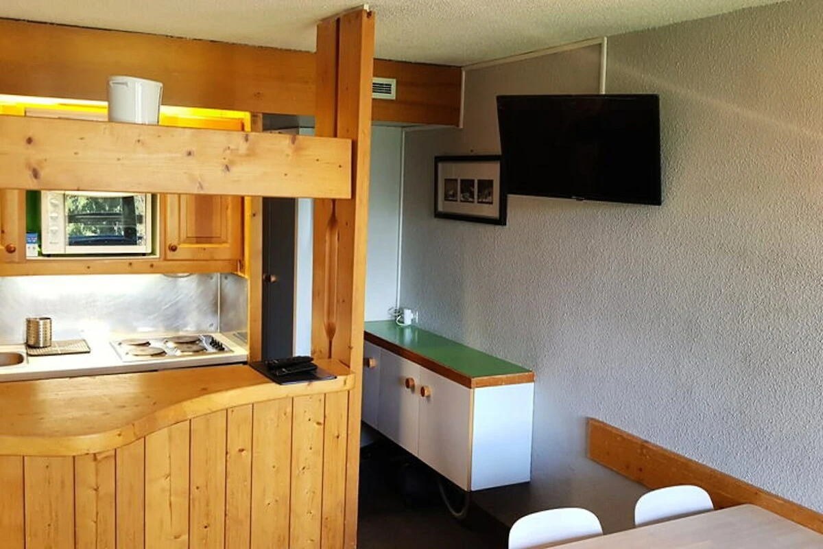 Das 29 m² große Studio ist durchdacht gestaltet und bietet Platz für bis zu fünf Gäste. Es ist somit ideal für Familien oder kleine Gruppen. Der Wohnbereich verfügt über zwei bequeme Einzelbetten, während eine separate Schlafnische mit Etagenbetten und einem Ausziehbett für erholsame Nächte sorgt. Die voll ausgestattete Küche mit Elektroherd, Backofen, Mikrowelle, Geschirrspüler und Kühlschrank ermöglicht es Ihnen, nach einem erlebnisreichen Tag leckere Mahlzeiten zuzubereiten. Entspannen Sie sich im gemütlichen Wohnzimmer mit Fernseher oder lassen Sie im Badezimmer mit Badewanne die Seele baumeln.