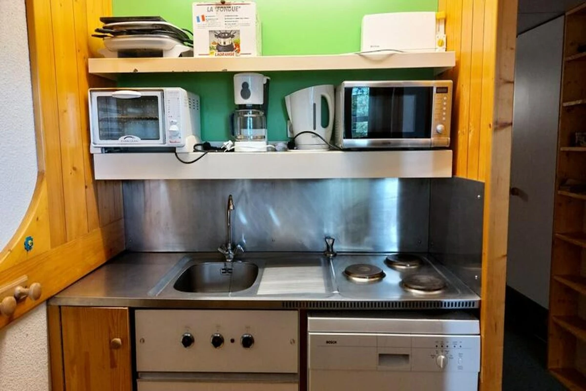 Das 29 m² große Studio bietet bequem Platz für bis zu fünf Gäste und ist somit ideal für Familien oder kleine Gruppen. Der Wohnbereich ist mit zwei Einzelbetten ausgestattet, während eine separate Schlafnische mit einem Etagenbett und einem Ausziehbett für erholsame Nächte sorgt. Die voll ausgestattete Küche mit Elektroherd, Backofen, Mikrowelle, Geschirrspüler und Kühlschrank lädt dazu ein, nach einem erlebnisreichen Tag leckere Mahlzeiten zuzubereiten. Weitere Annehmlichkeiten wie Fernseher, CD-Radio, Raclette-Grill und Fondue-Set sorgen für zusätzlichen Komfort.