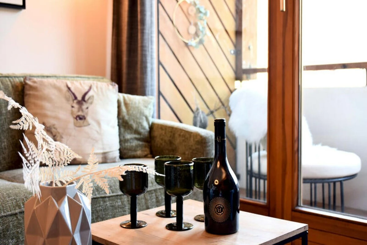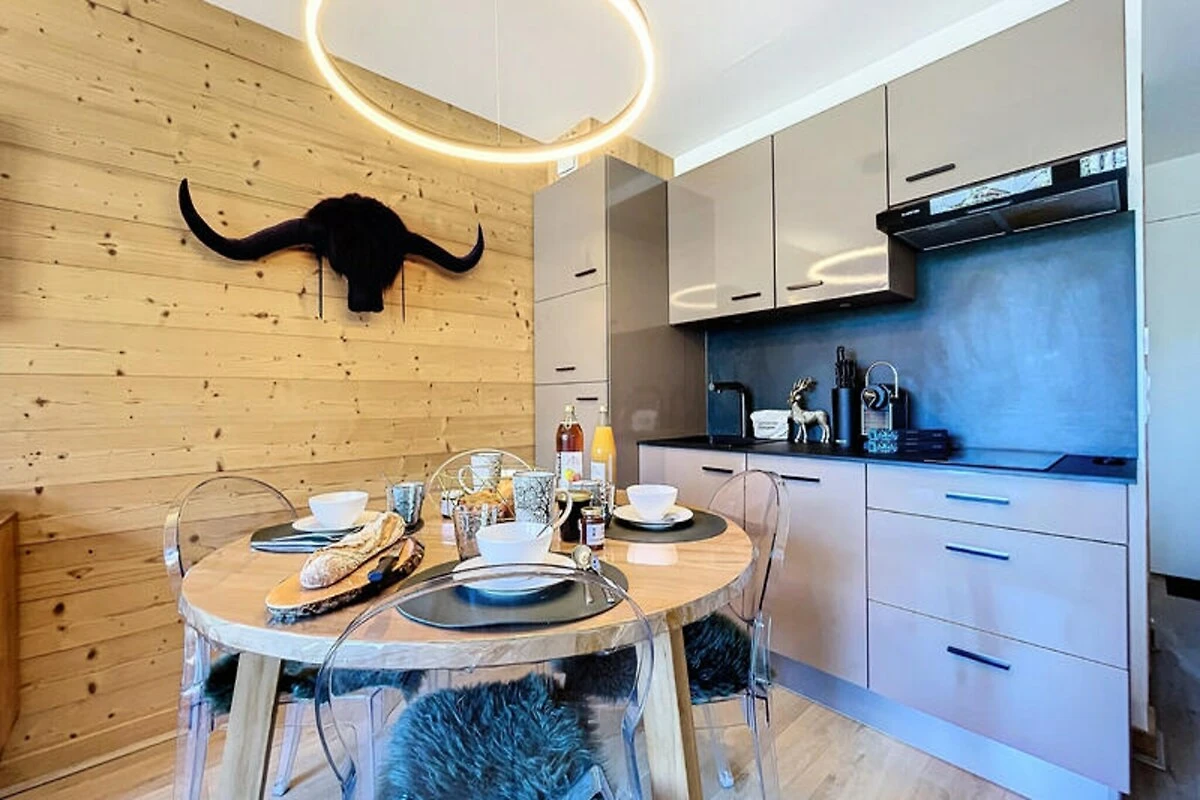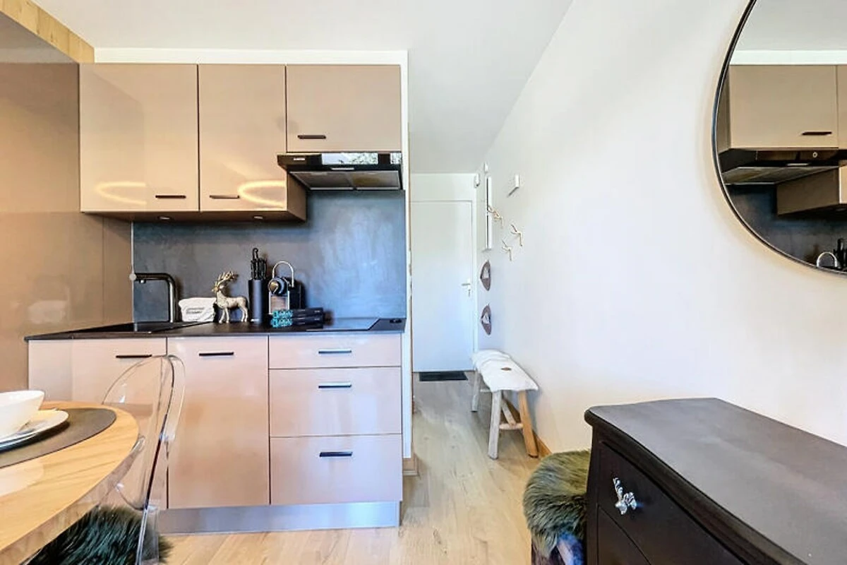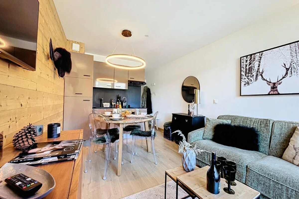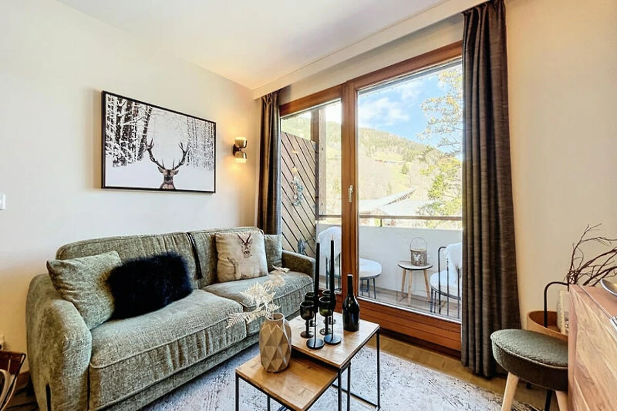 Im malerischen Dorf Les Gets bietet dieses charmante Apartment einen gemütlichen Rückzugsort für bis zu vier Gäste. Mit seinem modernen Design und liebevollen Details strahlt jede Ecke der 28 m² großen Wohnung Wärme und Behaglichkeit aus und ist somit der perfekte Ausgangspunkt für Ihre alpinen Abenteuer. Ob Sie im Winter die schneebedeckten Pisten oder im Sommer die saftig grünen Wanderwege genießen möchten – diese charmante Unterkunft lädt Sie zum stilvollen Entspannen ein. \n\nDas Apartment verfügt über ein geschmackvoll eingerichtetes Schlafzimmer und einen komfortablen Wohnbereich, ideal für Paare oder kleine Familien. In der voll ausgestatteten Küche können Sie Ihre Lieblingsgerichte zubereiten, vom herzhaften Frühstück bis zum Abendessen, während die elegante Einrichtung für ein einladendes Ambiente sorgt. Nach einem Tag in den Bergen können Sie sich in die bequemen Möbel zurückziehen und einen ruhigen Abend in Ihrem zweiten Zuhause genießen. \n\nDie perfekte Lage, nur wenige Schritte von den Skipisten und dem lebhaften Ortszentrum entfernt, ermöglicht es Ihnen, alles Notwendige bequem zu erreichen. Vom Supermarkt Carrefour Montagne bis hin zu charmanten Restaurants und Geschäften bietet Les Gets eine lebendige und zugleich gemütliche Atmosphäre. Der nahegelegene Busbahnhof ermöglicht eine bequeme Anbindung an die Umgebung und lädt dazu ein, die Schönheit der französischen Alpen zu entdecken. Ob Sie Abenteuer suchen oder sich erholen möchten – dieses Apartment in Les Gets verspricht einen unvergesslichen Aufenthalt, bei dem Komfort und Bequemlichkeit Hand in Hand gehen. Lassen Sie sich vom bezaubernden alpinen Charme dieses Dorfes und seiner atemberaubenden Umgebung verzaubern und schaffen Sie Erinnerungen, die Sie für immer in Ihrem Herzen bewahren werden.