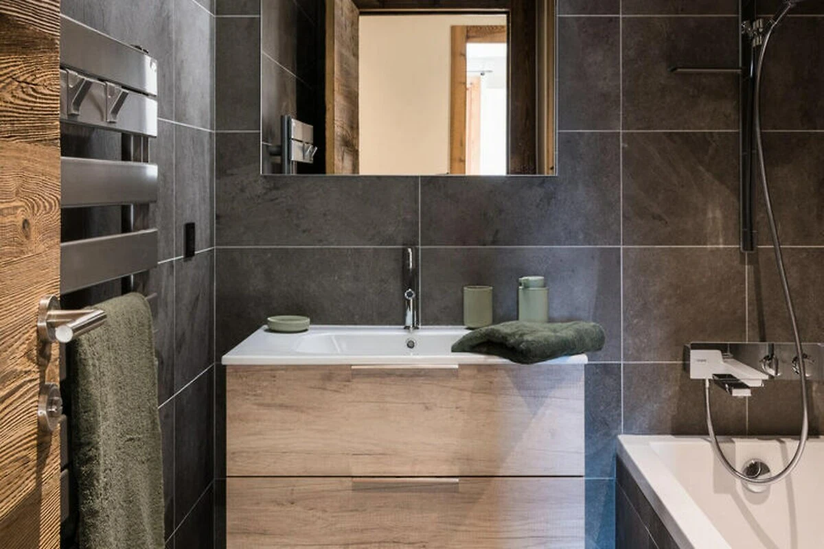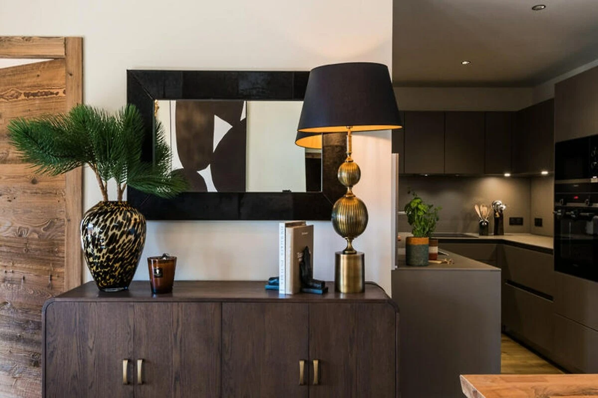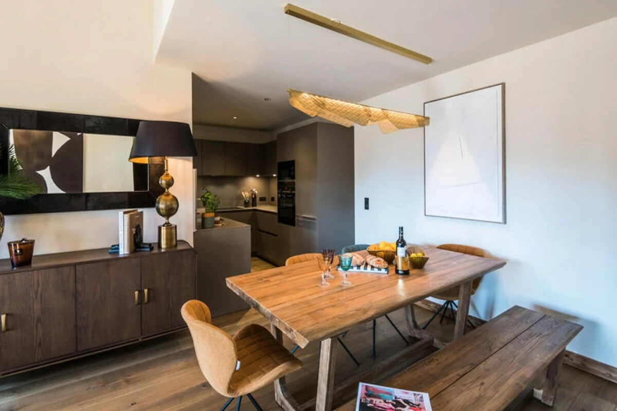 Treten Sie ein und entdecken Sie einen wunderschön gestalteten, 103 m² großen Raum mit hohen Decken und einer warmen, einladenden Atmosphäre. Das Apartment verfügt über drei geräumige Schlafzimmer, jeweils mit eigenem Bad, die Privatsphäre und Komfort für bis zu sieben Gäste gewährleisten. Der offene Wohnbereich mit einem gemütlichen Kamin geht nahtlos in eine voll ausgestattete Bulthaup-Küche über und ist somit ideal für gemeinsame Mahlzeiten und entspannte Abende. Die nach Südwesten ausgerichtete, 16 m² große Terrasse lädt zum Sonnenbaden und Genießen der atemberaubenden Alpenkulisse ein.