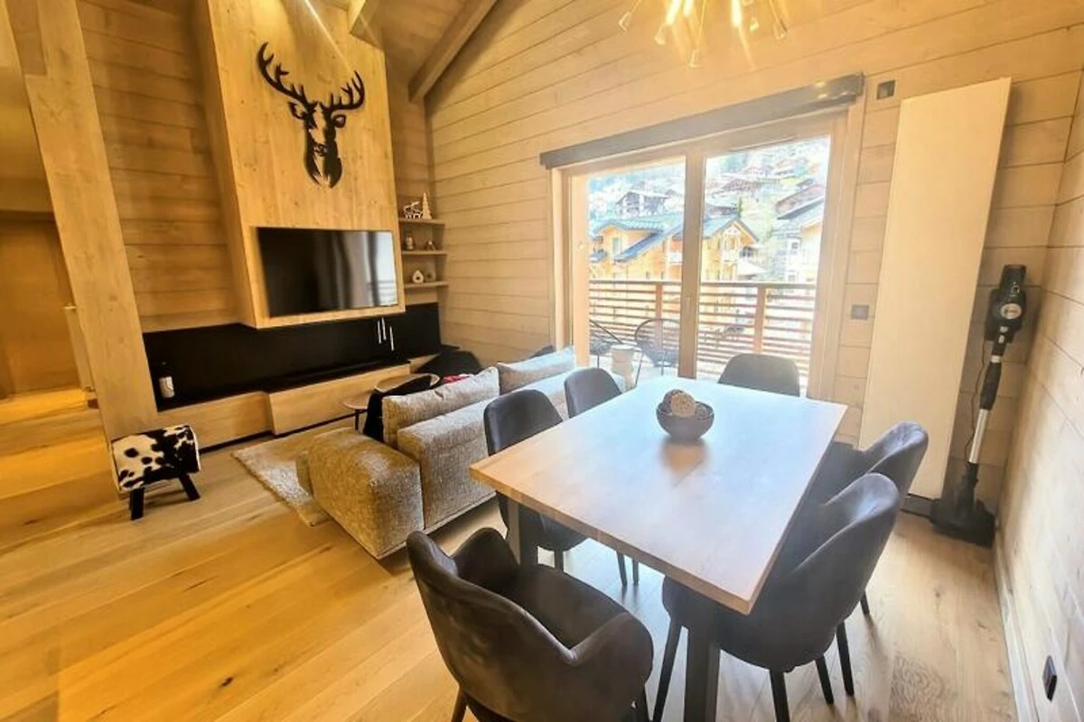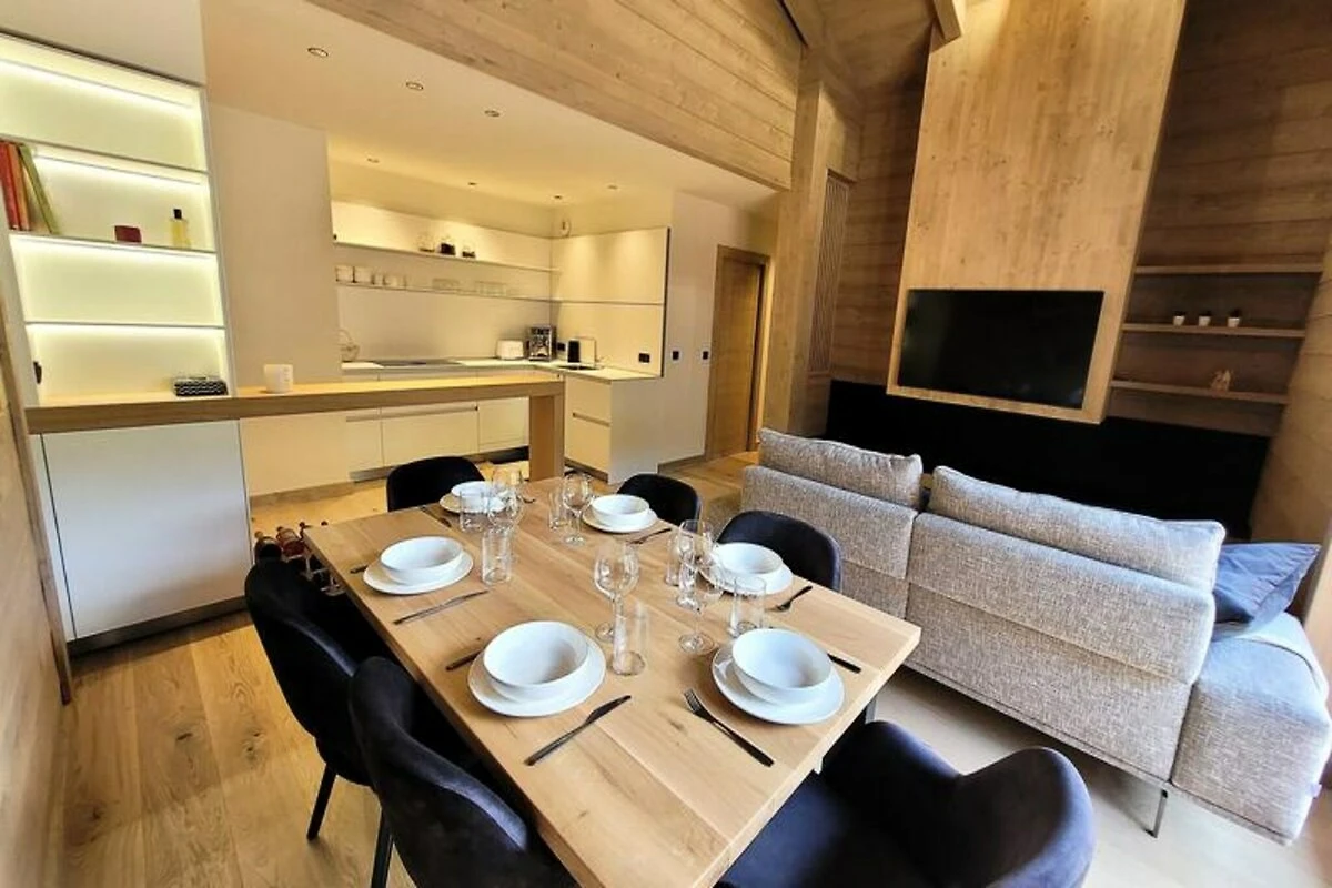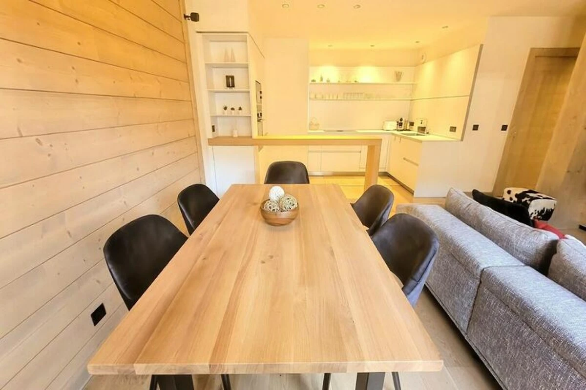 Im Herzen des charmanten Dorfes Les Gets bietet dieses luxuriöse Apartment die perfekte Mischung aus Eleganz und alpiner Gemütlichkeit. Stellen Sie sich vor, Sie erwachen mit der frischen Bergluft und treten auf Ihre sonnige Terrasse, um den atemberaubenden Blick auf die umliegenden Gipfel und Hänge zu genießen. Die Unterkunft ist ideal gelegen: Einkaufspassagen befinden sich direkt unterhalb und das lebhafte Ortszentrum liegt vor Ihrer Tür – so genießen Sie Komfort und eine lebendige Atmosphäre während Ihres gesamten Aufenthalts. Hier trifft moderne Eleganz auf die zeitlose Schönheit der französischen Alpen. \n\nDas mit viel Liebe zum Detail gestaltete Apartment verfügt über ein geräumiges Wohnzimmer mit hohen Decken und einem einzigartigen Dampfkamin, der für eine gemütliche Atmosphäre an entspannten Abenden nach einem Tag auf der Piste sorgt. Die voll ausgestattete Küche lädt zum Zubereiten köstlicher Mahlzeiten ein, während der elegante Essbereich und der Balkon den perfekten Rahmen bieten, um Momente mit Ihren Lieben zu teilen. Die Unterkunft bietet Platz für bis zu sechs Gäste und umfasst ein Hauptschlafzimmer mit eigenem Bad, ein charmantes Kinderzimmer mit Etagenbetten sowie ein zweites Badezimmer mit modernen Annehmlichkeiten wie Waschmaschine und Trockner. Treten Sie vor die Tür und Sie befinden sich nur 250 Meter von den nächsten Skipisten und 350 Meter von der renommierten französischen Skischule (ESF) entfernt. Ob Wintersport oder Sommerwanderungen – Les Gets bietet unzählige Möglichkeiten für Abenteuer und Entspannung. Die Unterkunft verfügt außerdem über Sauna, Dampfbad und Fitnesscenter, sodass Ihr Aufenthalt ebenso erholsam wie aufregend wird. Mit seiner erstklassigen Lage, der luxuriösen Ausstattung und durchdachten Serviceleistungen wie Endreinigung und frischer Bettwäsche ist dieses Apartment der perfekte Rückzugsort in den Alpen. Ob Sie aufregende Tage auf der Piste oder ruhige Abende am Kamin verbringen möchten – diese Unterkunft verspricht einen unvergesslichen Aufenthalt im Herzen der französischen Alpen.