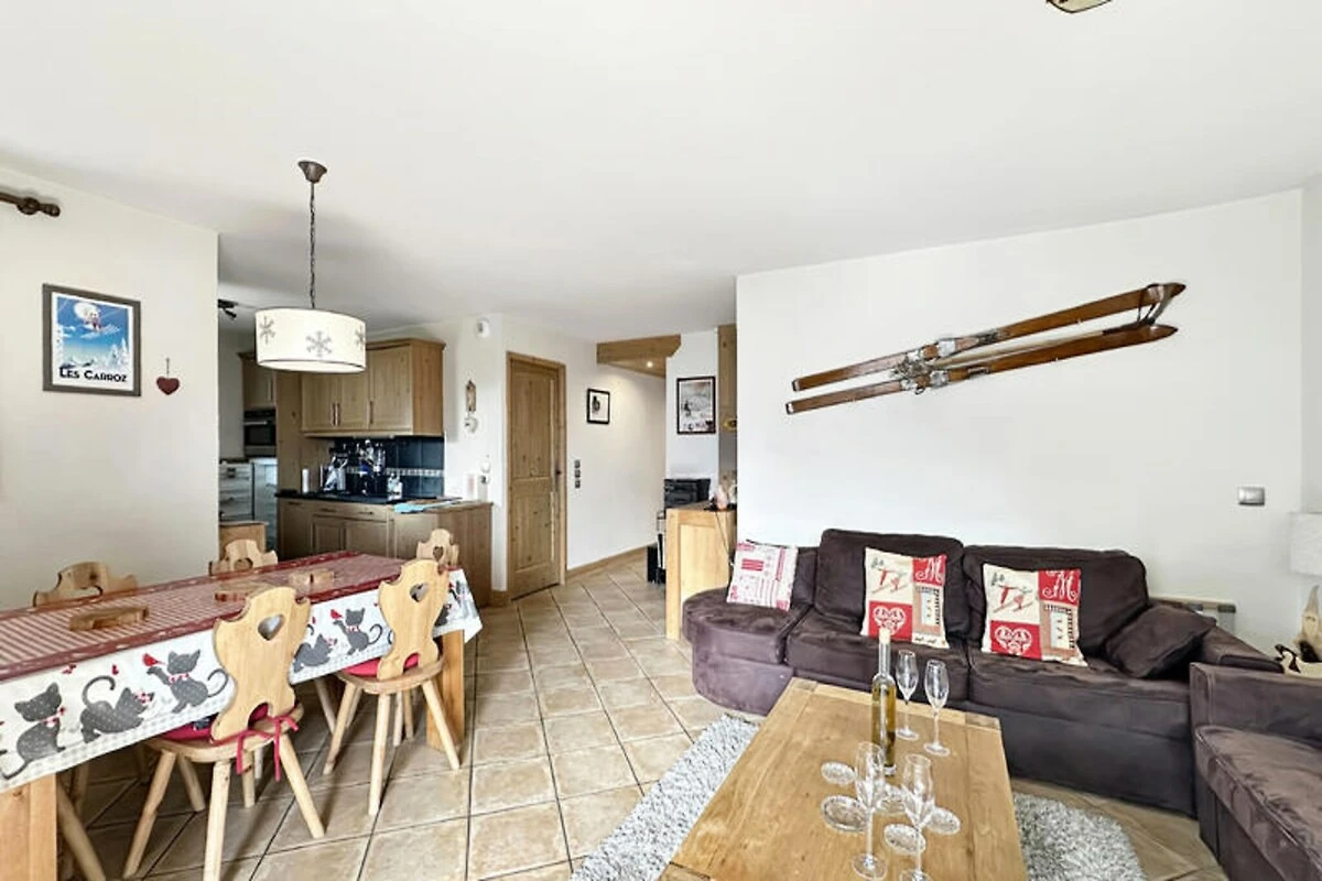 Mitten im charmanten Alpendorf bietet dieses moderne und geräumige 75 m² große Apartment den perfekten Rückzugsort für Familien und Freunde, die einen unvergesslichen Bergurlaub verbringen möchten. Dank der erstklassigen Lage, nur wenige Schritte vom Skibus und einen kurzen Spaziergang von der Seilbahn entfernt, genießen Sie direkten Zugang zu den Pisten und der atemberaubenden Schönheit der französischen Alpen. Das moderne Design und das warme Ambiente des Apartments schaffen eine einladende Atmosphäre, in der Entspannung und Abenteuer Hand in Hand gehen. \n\nIm Inneren erwarten Sie drei geschmackvoll eingerichtete Schlafzimmer, darunter eine Master-Suite mit Queensize-Bett und eigenem Duschbad sowie zwei weitere Schlafzimmer mit komfortablen Doppelbetten. Der offene Wohnbereich verfügt über eine voll ausgestattete Küche mit modernen Geräten, sodass Sie nach einem Tag auf der Piste ganz einfach Ihre Mahlzeiten zubereiten können. Ein geräumiges Badezimmer, ein separates WC und durchdachte Annehmlichkeiten wie Waschmaschine, Geschirrspüler und spezielles Kochgeschirr sorgen für einen stressfreien Aufenthalt. \n\nTreten Sie hinaus auf die großzügige 70 m² große Balkonterrasse – der perfekte Ort, um sonnige Nachmittage mit Familie oder Freunden zu genießen und die frische Bergluft einzuatmen. Ob Sie ein Raclette-Dinner genießen oder einfach nur die Aussicht bewundern – dieser Außenbereich verleiht Ihrem Alpenurlaub einen Hauch von Magie. Mit Tiefgarage, Skiraum und WLAN ist an alles gedacht. Außerhalb der Unterkunft bietet das Dorfzentrum eine reizvolle Auswahl an Geschäften, Restaurants und Après-Ski-Möglichkeiten, während die umliegenden Berge unzählige Möglichkeiten zum Skifahren, Wandern und Erkunden bieten. Fühlen Sie sich hier wie zu Hause und schaffen Sie unvergessliche Erinnerungen im Herzen der Alpen.