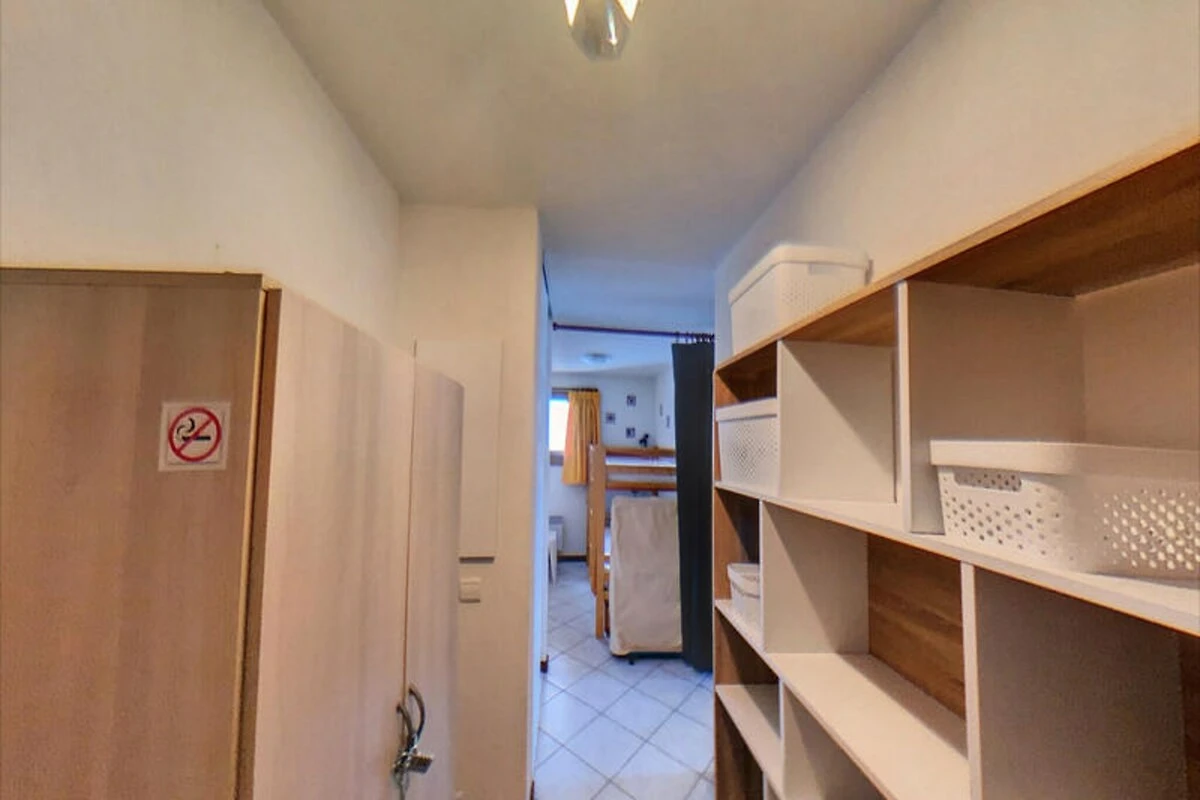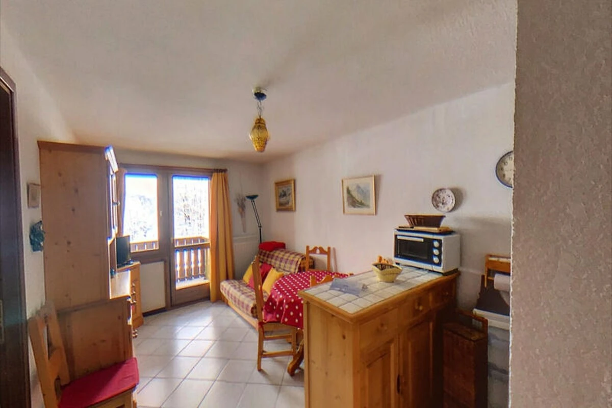 Apartment im 1. Stock (mit Aufzug) der Residenz „Sabaudia B“ im Ortszentrum mit einer Wohnfläche von 39,80 m². Das Apartment verfügt über drei Schlafbereiche für 5–6 Personen: ein Schlafzimmer (1 Doppelbett), eine Schlafnische (2 Etagenbetten) und ein Wohnzimmer (1 Schlafsofa). Der nach Westen ausgerichtete Balkon bietet einen wunderschönen Blick auf die Aravis-Bergkette.