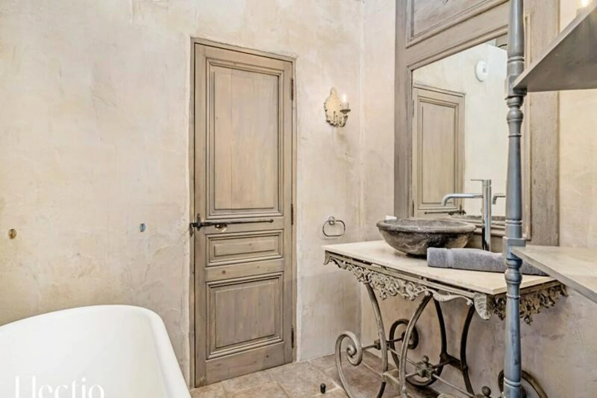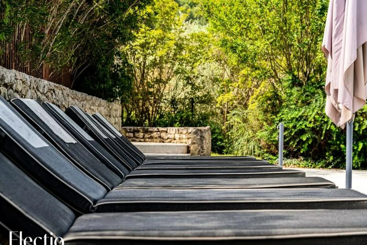 Die private Terrasse unter einer schmiedeeisernen Pergola ist der perfekte Ort, um den Morgenkaffee oder einen abendlichen Aperitif zu genießen und dabei den Panoramablick auf den Luberon zu bewundern. Direkt neben Ihrem Apartment erwartet Sie ein beheizter Swimmingpool, umgeben von duftenden mediterranen Gärten mit Lavendel und jahrhundertealten Olivenbäumen. Entspannen Sie sich auf einer Sonnenliege oder erkunden Sie die schattigen Pergolen und Steinbänke auf dem Gelände.