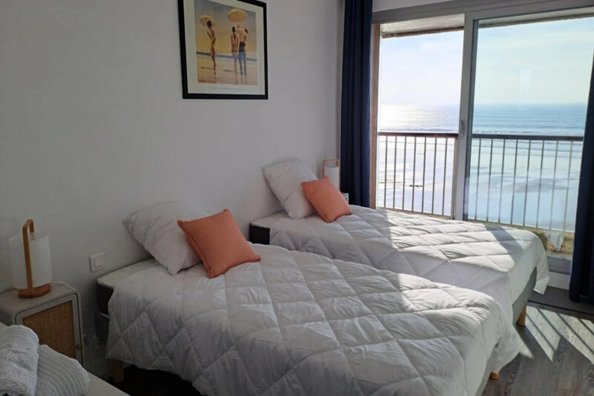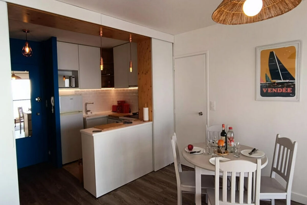 Mit dem glitzernden Atlantik vor Ihnen bietet dieses atemberaubende 4-Sterne-Apartment in Les Sables d'Olonne, Heimat einer der schönsten Buchten der Welt, einen unvergleichlichen Rückzugsort am Meer. Stellen Sie sich vor, Sie erwachen zum sanften Rauschen der Wellen und treten auf Ihren privaten Balkon, um den atemberaubenden 180°-Panoramablick auf den Ozean zu genießen. Hell und einladend, ist diese moderne Oase darauf ausgelegt, Sie in den Charme der Küste einzutauchen und Ihnen gleichzeitig alle Annehmlichkeiten von zu Hause zu bieten. Ob Sie einen romantischen Kurzurlaub oder eine entspannende Auszeit suchen, dieses Apartment ist Ihr Tor zur Magie der französischen Küste. \n\nIm Inneren erwartet Sie ein stilvoll renovierter, 42 m² großer Wohnraum, der Funktionalität und Stil perfekt vereint. Das Wohnzimmer mit Schlafsofa, Esstisch und Fernseher öffnet sich direkt zum Balkon, sodass Sie keinen Moment der atemberaubenden Aussicht verpassen. Die offene Küche ist mit hochwertigen Geräten ausgestattet, darunter eine Delonghi Kaffeemaschine, ein Backofen und ein Geschirrspüler, die die Zubereitung von Mahlzeiten zum Kinderspiel machen. Das Schlafzimmer bietet flexible Schlafmöglichkeiten mit einem Kingsize-Bett oder zwei Einzelbetten, während das Badezimmer mit einer entspannenden Badewanne ausgestattet ist. Glasfaser-WLAN und viel Stauraum sorgen für einen reibungslosen Aufenthalt. \n\nDas Apartment liegt direkt am Ufer und ist der ideale Ausgangspunkt, um das lebhafte Städtchen Les Sables d'Olonne zu erkunden. Schlendern Sie die Fußgängerzone entlang, genießen Sie die lokalen Restaurants oder entspannen Sie einfach in der Sonne am goldenen Sandstrand. Für Surfer und Radfahrer bietet der gemeinschaftliche Abstellraum zusätzlichen Komfort, und private Parkplätze garantieren stressfreie An- und Abreise. \n\nOb Sie frische Meeresfrüchte genießen, die nahegelegenen Sehenswürdigkeiten erkunden oder einfach bei einem Glas Wein den Sonnenuntergang über der Bucht ausklingen lassen – dieses Apartment verspricht ein unvergessliches Küstenerlebnis. Buchen Sie Ihren Aufenthalt und lassen Sie sich von der Schönheit von Les Sables d'Olonne verzaubern.