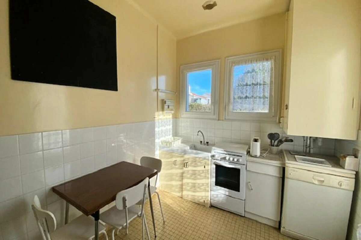 Nur 800 Meter vom goldenen Sandstrand der französischen Küste entfernt erwartet Sie ein charmantes Ferienhaus im Vintage-Stil. Auf einem privaten, umzäunten Grundstück von ca. 360 m² gelegen, lädt dieses ebenerdige Refugium zum Entspannen und Genießen der ruhigen Umgebung ein. Ob Sie im Garten Ihren Kaffee trinken oder unter dem Sonnenschirm die Sonne genießen – dieses Haus bietet die perfekte Mischung aus Komfort und Schlichtheit für einen unvergesslichen Urlaub. Die einladende Atmosphäre wird durch liebevolle Details abgerundet, die Ihnen ein echtes Zuhause fernab von Zuhause bieten. \n\nIm Inneren finden Sie eine gut ausgestattete Küche mit Kühl-/Gefrierschrank, Backofen, Mikrowelle und Geschirrspüler, sodass Sie alles haben, um köstliche Mahlzeiten zuzubereiten. Das gemütliche Wohnzimmer mit Schlafsofa, Sesseln und Fernseher lädt zum Verweilen ein. Zwei komfortable Schlafzimmer bieten Platz für bis zu sechs Gäste, eines mit einem Queensize-Bett und das andere mit zwei Einzelbetten. Das Badezimmer ist mit einer Waschmaschine und einem Handtuchtrockner ausgestattet, und ein separates WC sorgt für zusätzlichen Komfort. Für zusätzlichen Komfort ist Bettwäsche vorhanden, sodass Sie stressfrei anreisen können. Die Lage ist ideal, um die nahegelegenen Strände zu erkunden und Aktivitäten im Freien zu genießen. Dank der Parkplätze direkt am Haus und der Nähe zu lokalen Sehenswürdigkeiten finden Sie alles, was Sie für einen erholsamen Urlaub benötigen. Ob Sie am Strand entlangspazieren oder einen ruhigen Abend im Garten verbringen – diese Unterkunft bietet einen wunderbaren Rückzugsort für Familien und kleine Gruppen. Die Zahlung mit Urlaubsgutscheinen ist möglich, und optionale Services wie die Anmietung eines Babybetts oder die Endreinigung können nach Ihren Wünschen arrangiert werden. Wählen Sie dieses Ferienhaus im Vintage-Stil wegen seines Charmes, seines Komforts und seiner unschlagbaren Lage nahe der Küste. Es ist ein Ort, an dem unvergessliche Erinnerungen entstehen, umgeben von der Schönheit der französischen Küste.