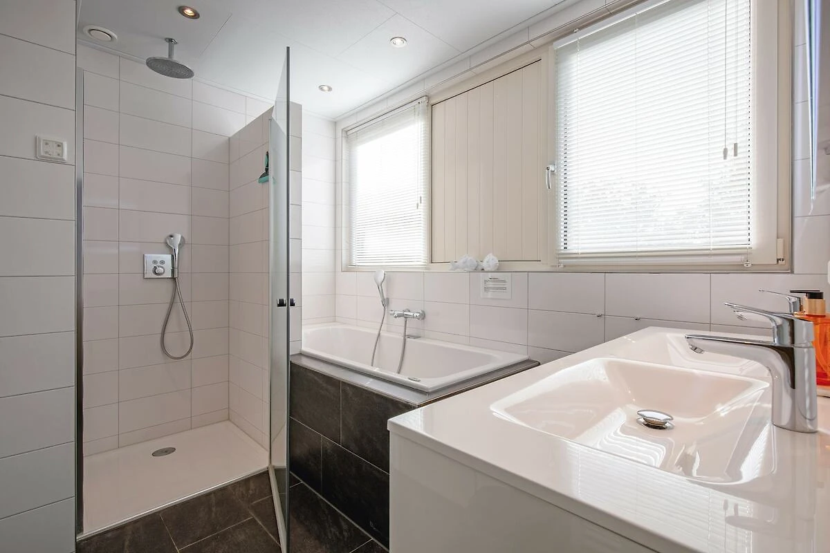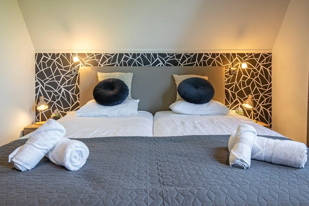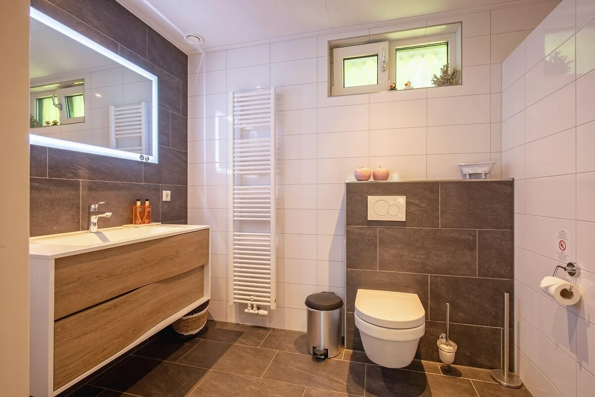 Im Erdgeschoss befindet sich ein Schlafzimmer mit komfortablen Einzelbetten (Boxspringbetten) und einem Fernseher. Ein angrenzendes Badezimmer mit Dusche, Waschbecken und WC ist ebenfalls vorhanden. Die drei weiteren Schlafzimmer befinden sich im ersten Stock und sind jeweils mit zwei Einzelbetten (Boxspringbetten) ausgestattet. Im Obergeschoss befindet sich ein renoviertes, luxuriöses Badezimmer mit ebenerdiger Dusche, Badewanne mit Whirlpoolfunktion, Doppelwaschbecken und Sauna zum Entspannen und Abschalten.
